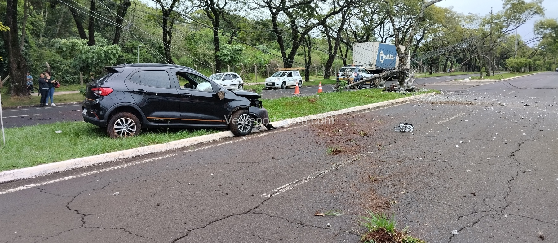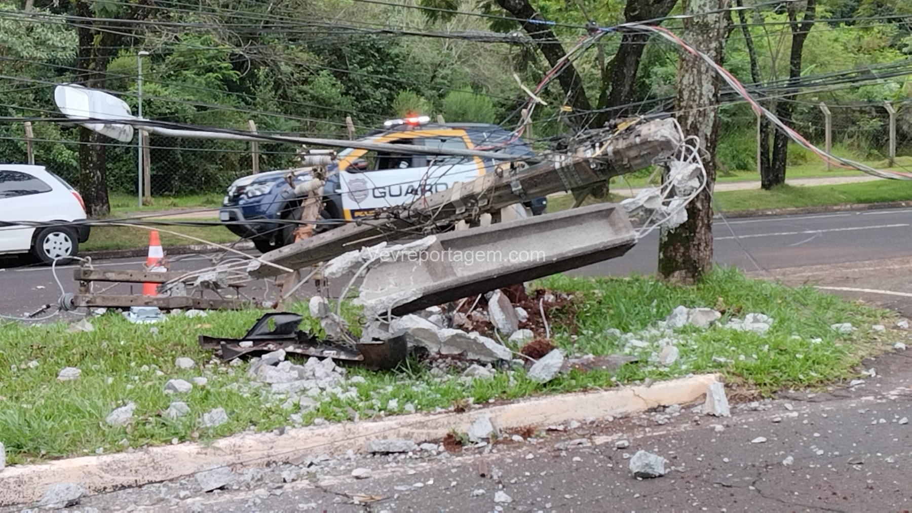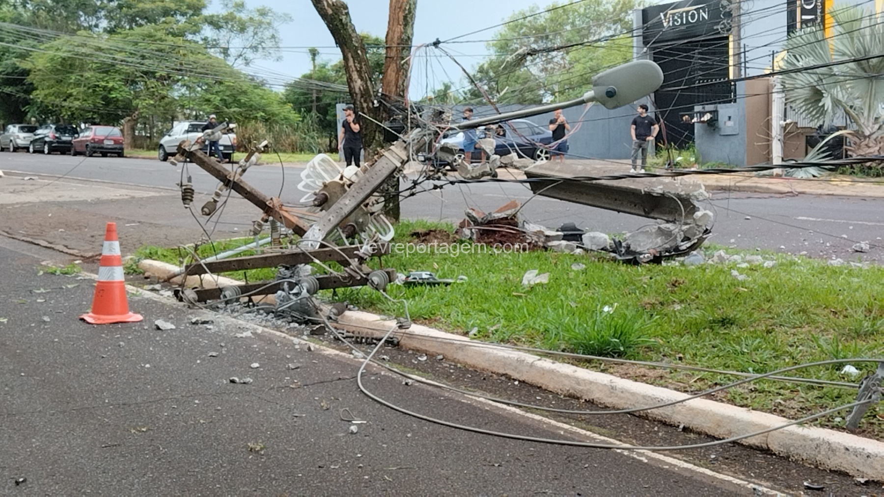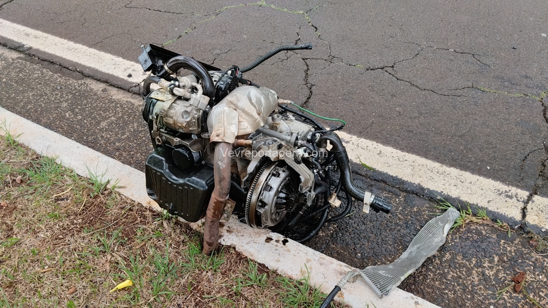 Com o impacto, o poste ficou completamente destruído e o motor do veículo chegou a ser arremessado para o meio da via.