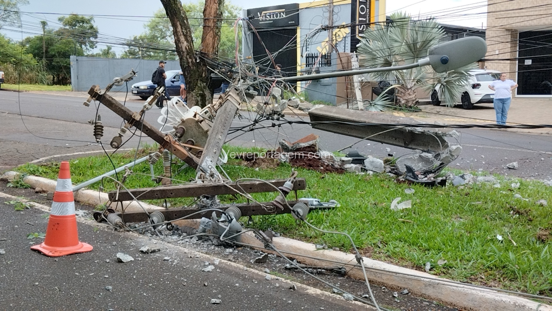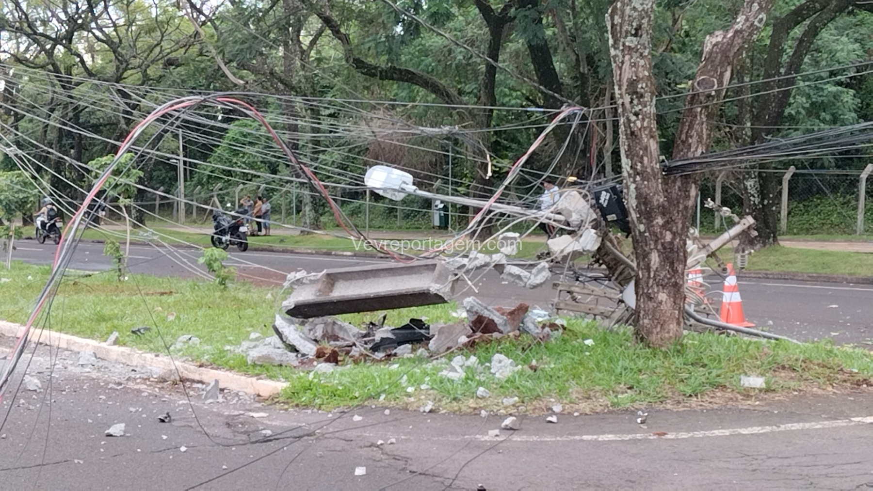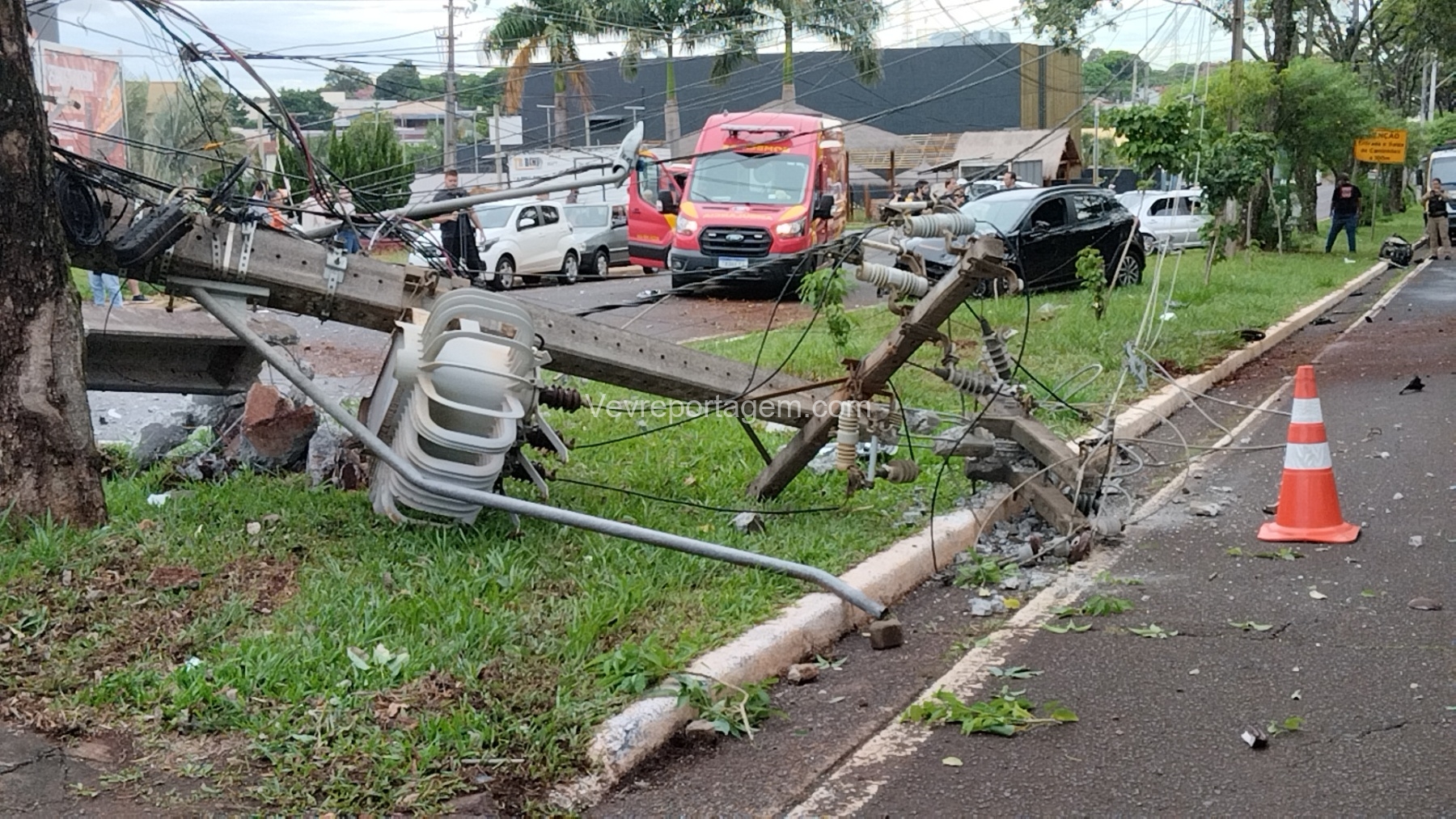Com o impacto, o poste ficou completamente destruído e o motor do veículo chegou a ser arremessado para o meio da via.