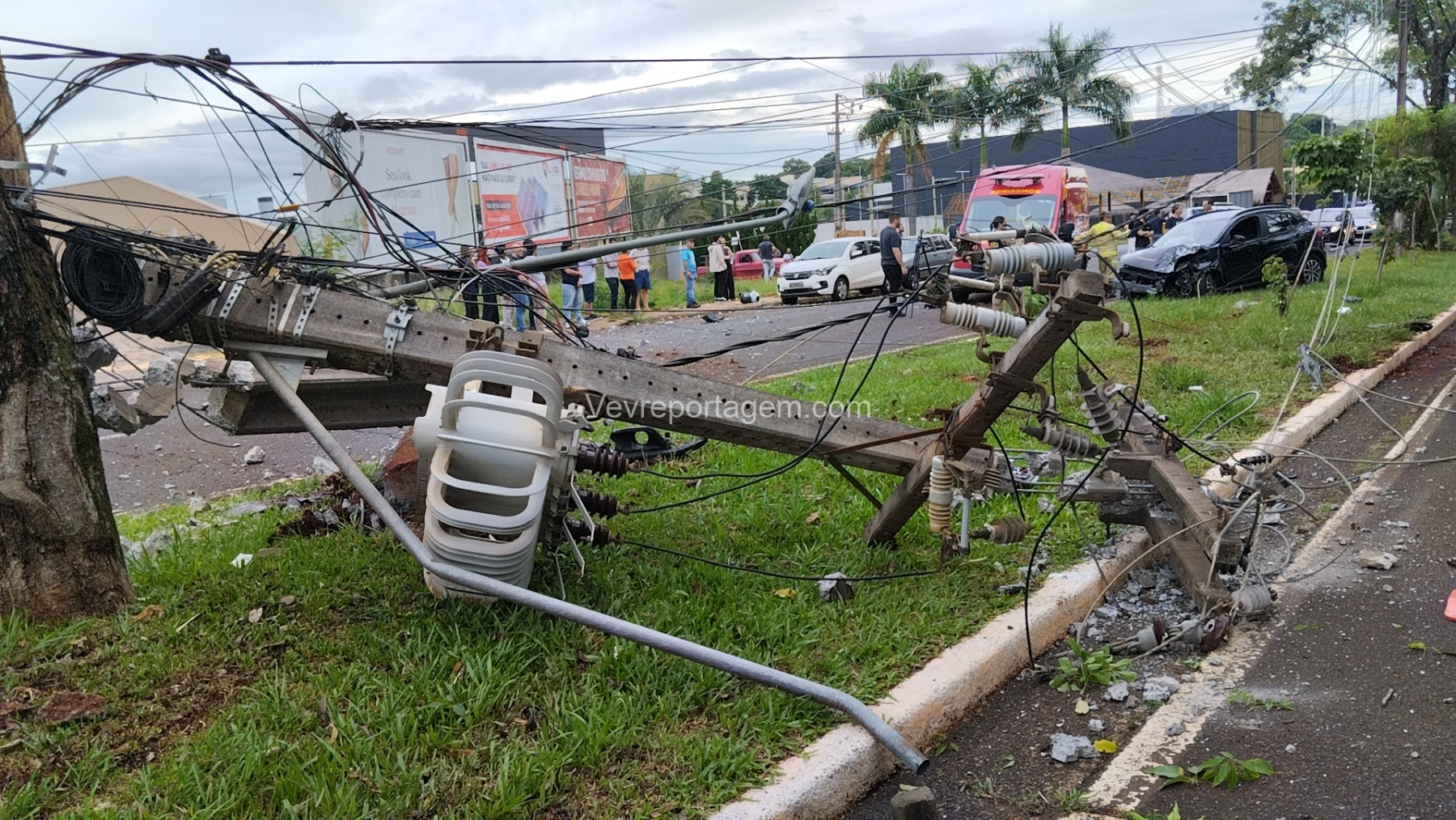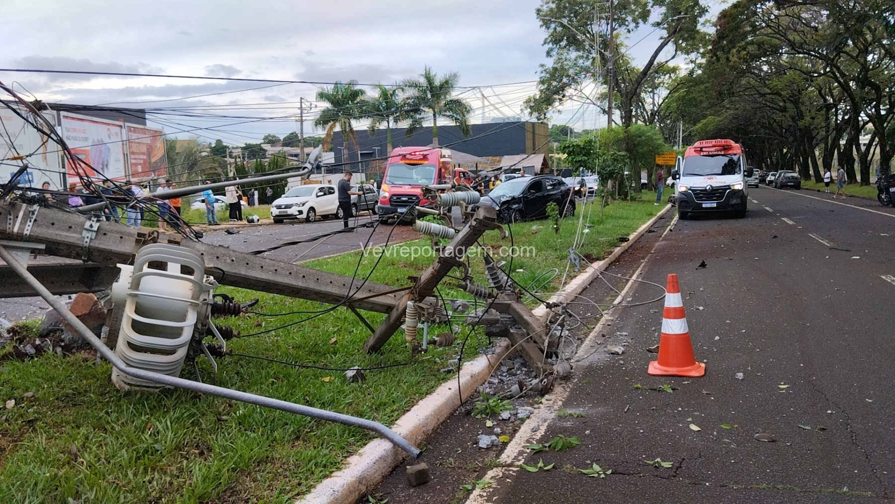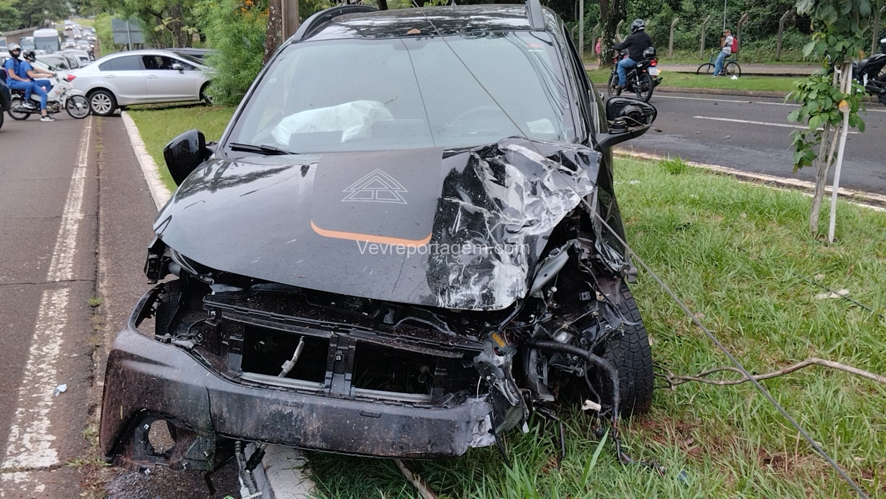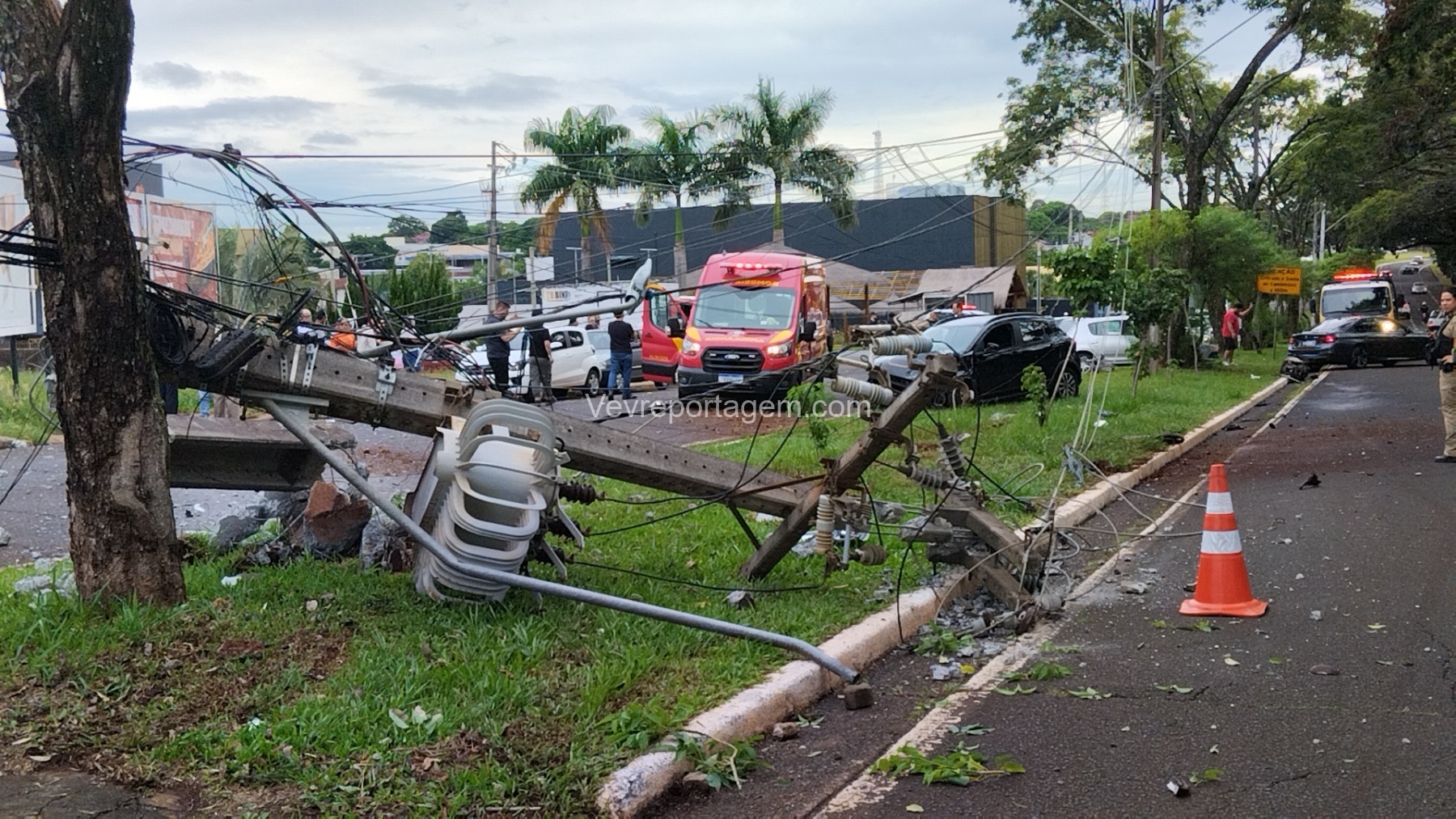 Com o impacto, o poste ficou completamente destruído e o motor do veículo chegou a ser arremessado para o meio da via.