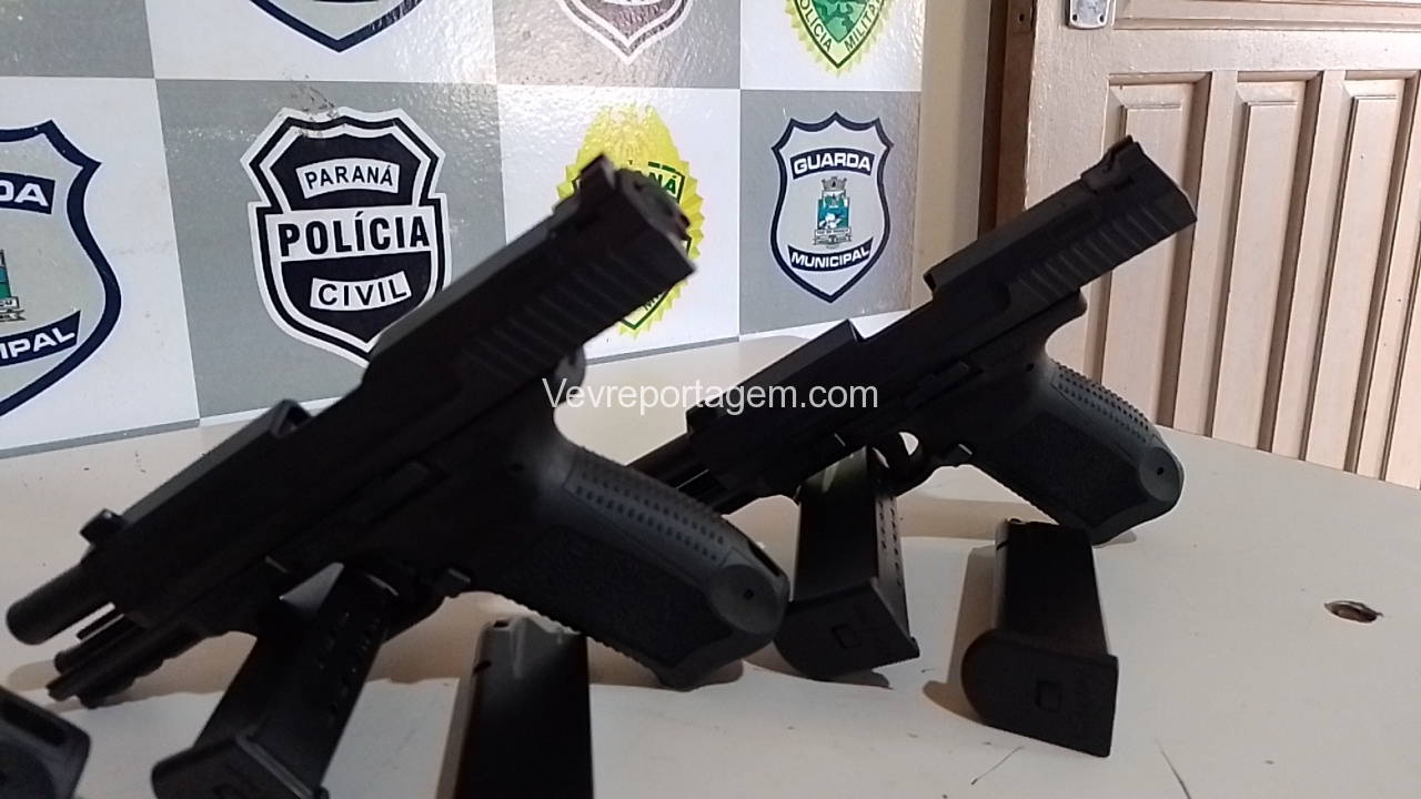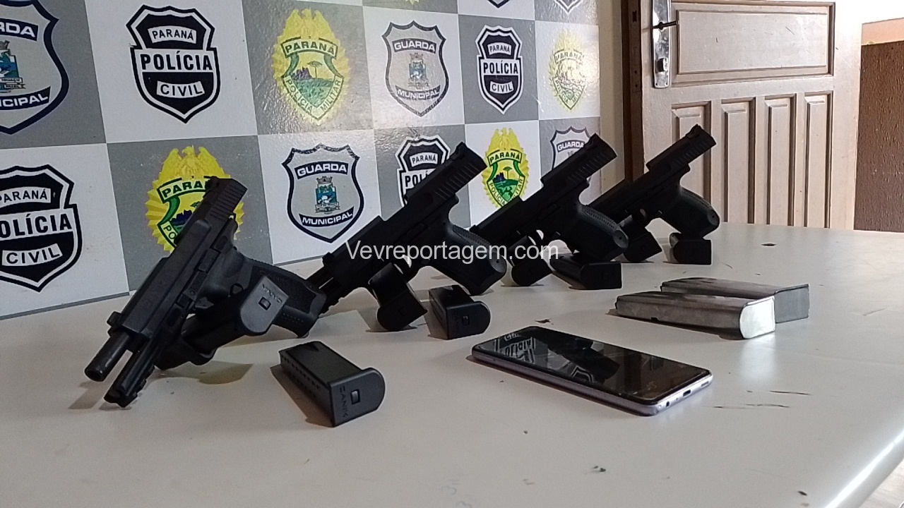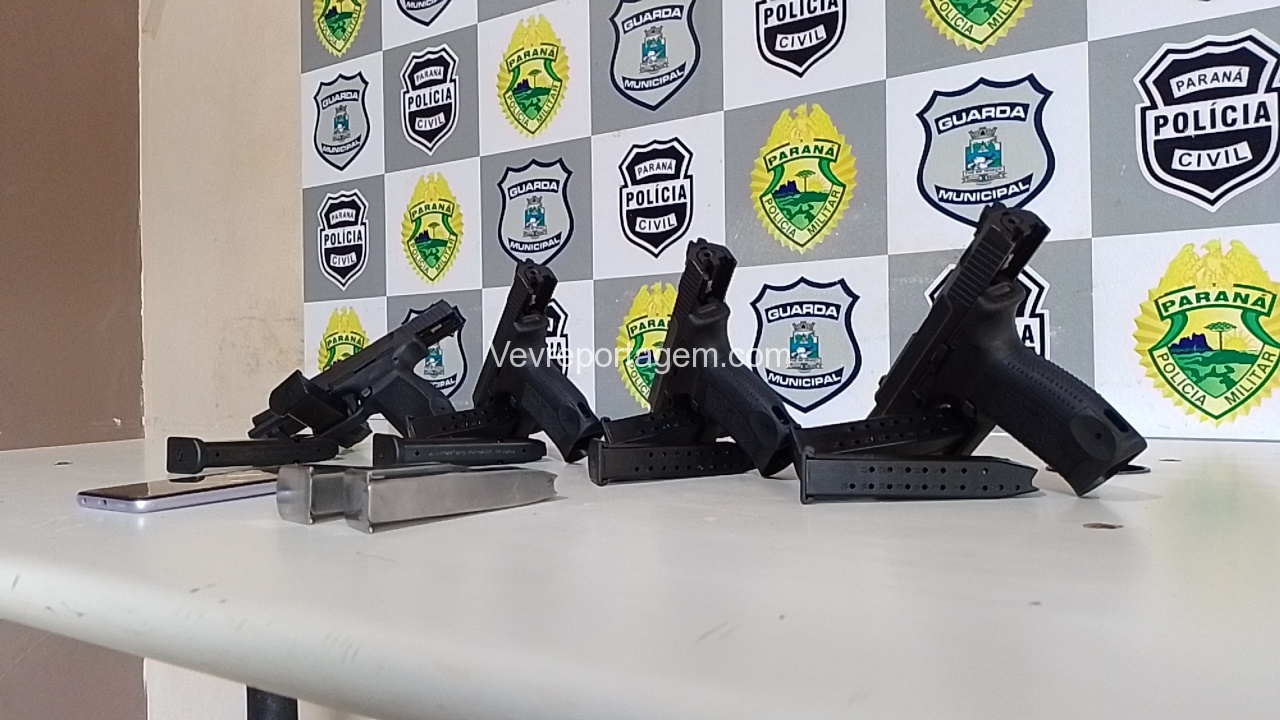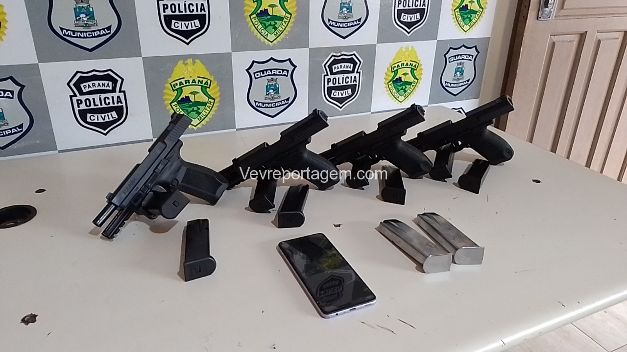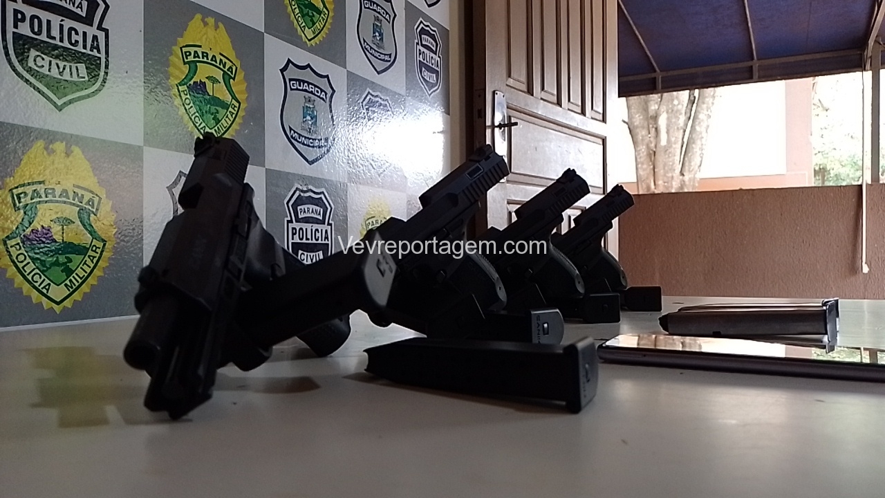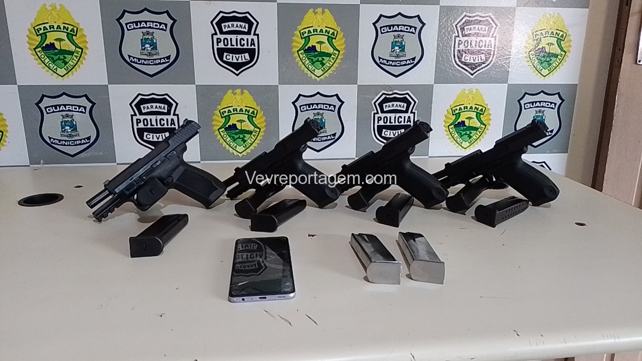 Os policiais rapidamente foram atrás para checarem a denúncia, quando na Avenida Sérgio Gasparetto, realizaram abordagem na van. Uma mulher ficou muito nervosa com a presença dos policiais, foi quando observado que havia algo fixado em seu corpo. Em revista pessoal feita por uma policial feminina foi localizado 4 pistola 9mm sem munição e mais 6 carregadores também sem munição.