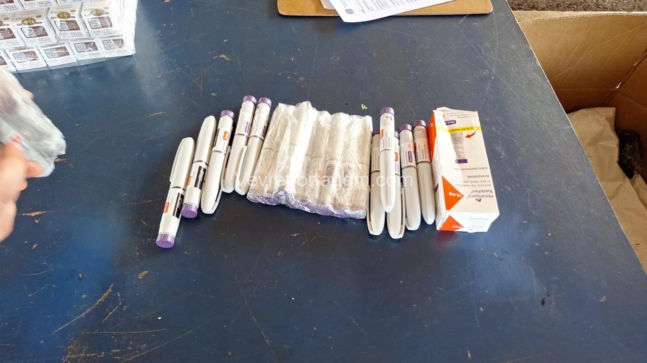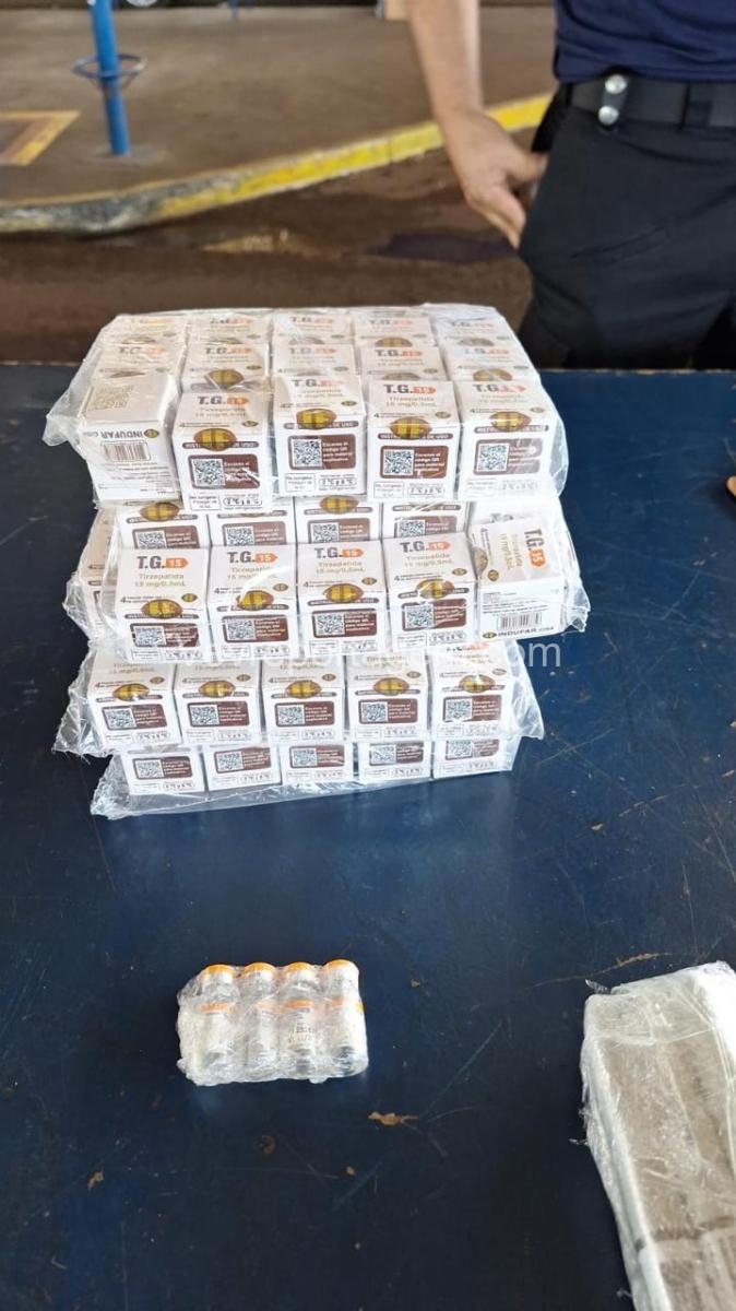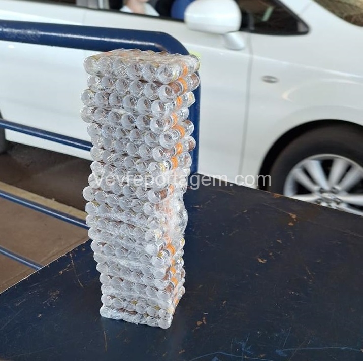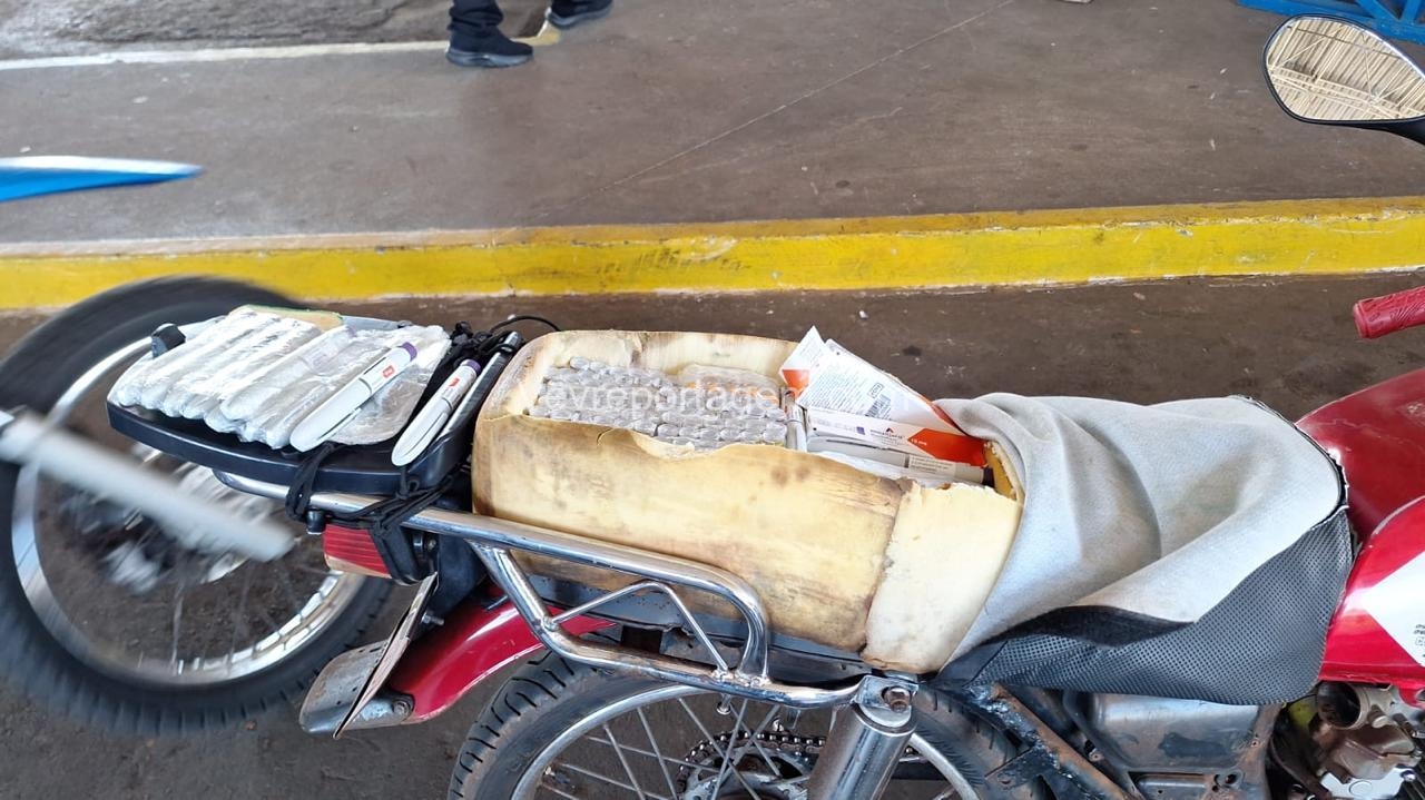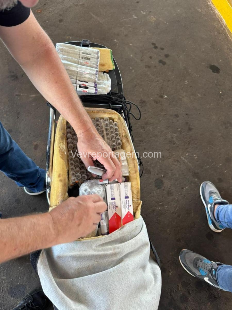 Durante a vistoria, foram encontrados diversos medicamentos emagrecedores, incluindo ampolas de tirzepatida (TG 15 mg), canetas Mounjaro 15 mg e ampolas de Lipolez 15 mg, que estavam ocultos em um capacete extra e em um fundo falso no assento da motocicleta.