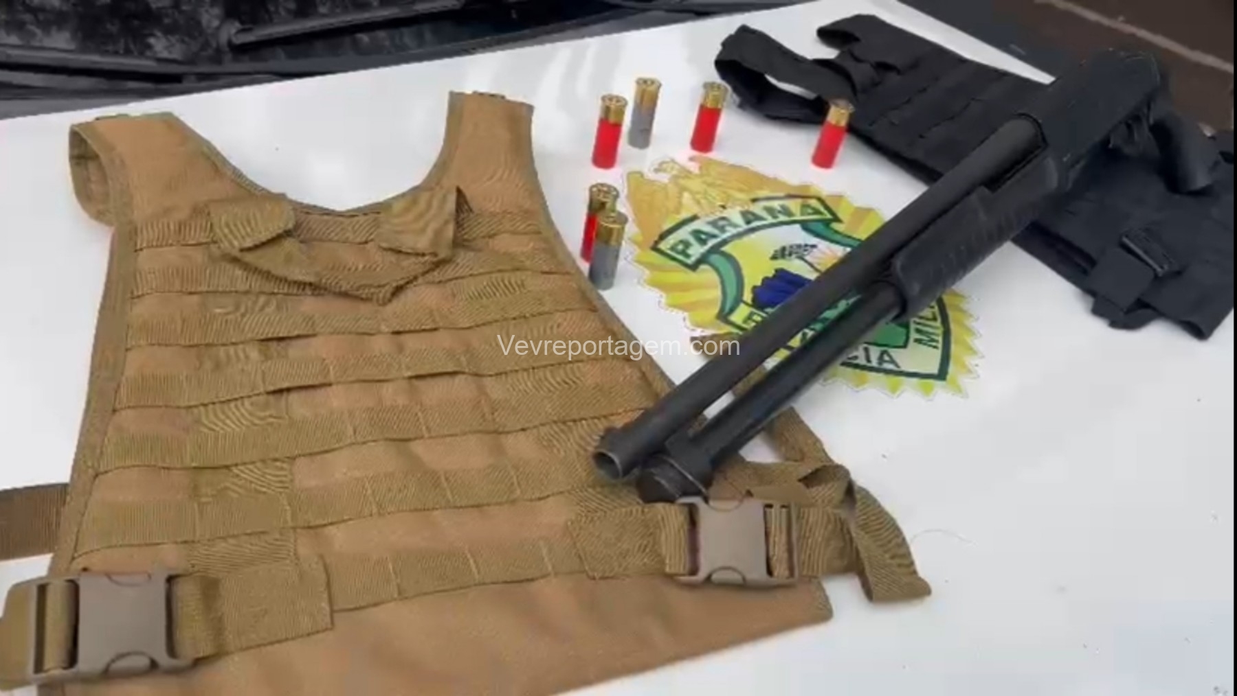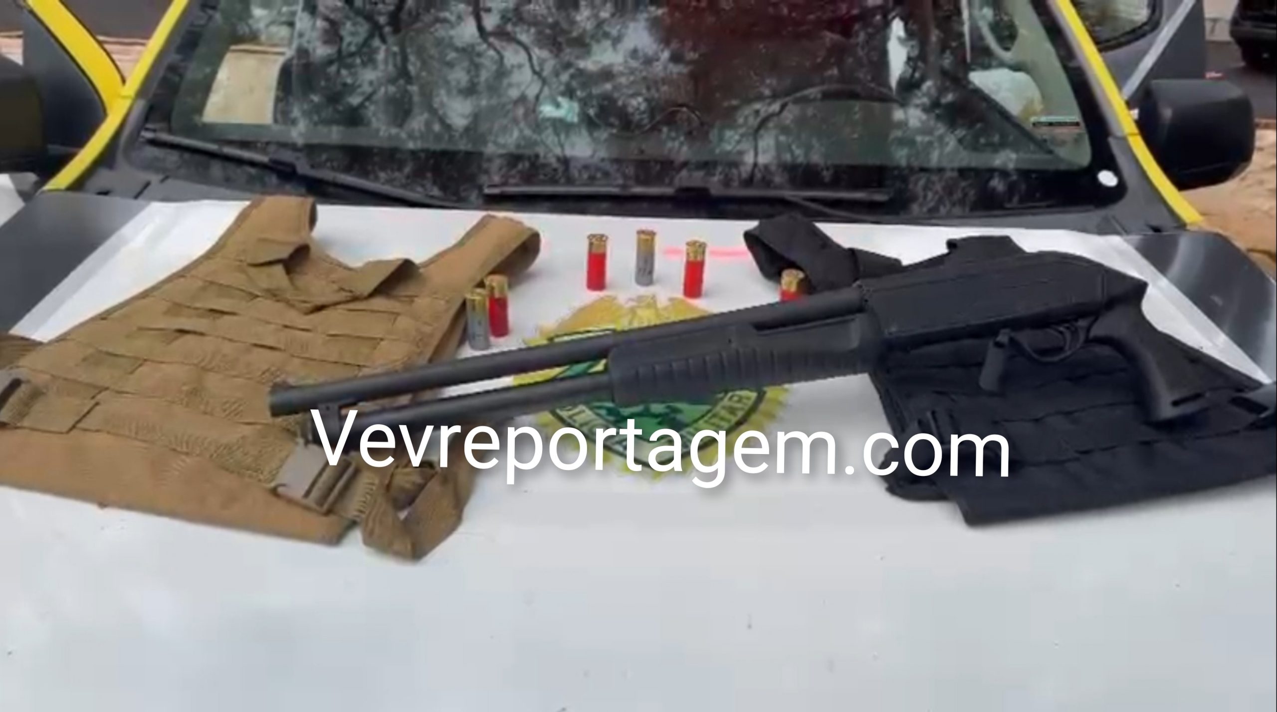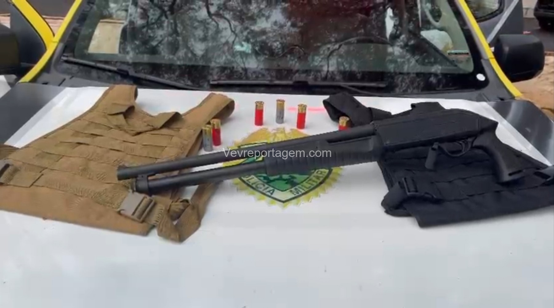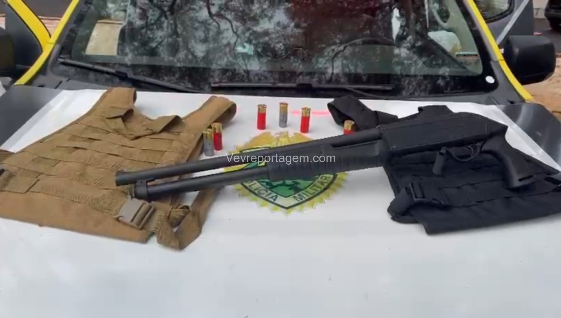 Durante as buscas, os policiais localizaram uma bolsa contendo duas capas modulares de colete balístico e uma espingarda calibre 12, já municiada com sete cartuchos intactos.