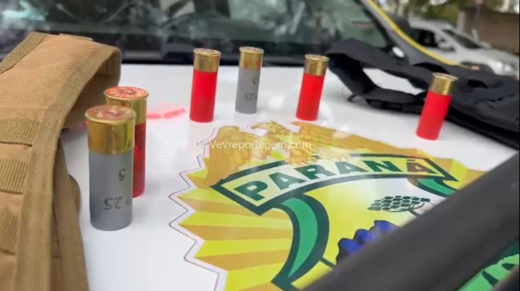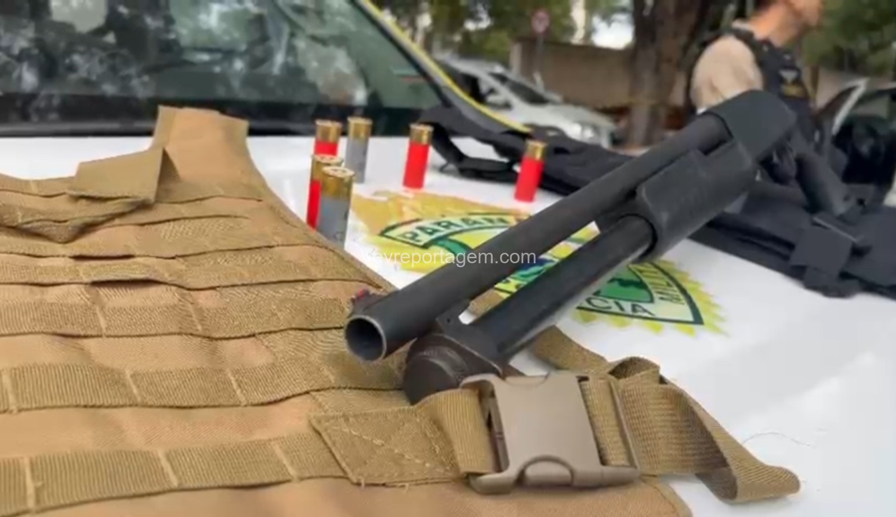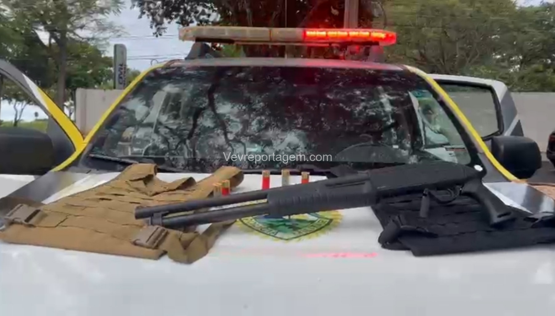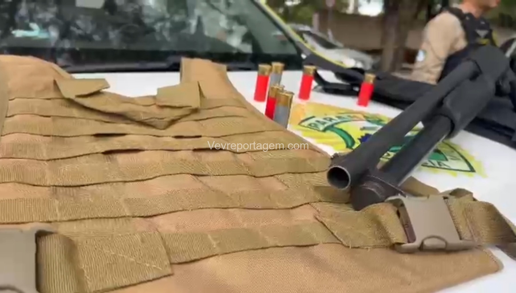 Durante as buscas, os policiais localizaram uma bolsa contendo duas capas modulares de colete balístico e uma espingarda calibre 12, já municiada com sete cartuchos intactos.