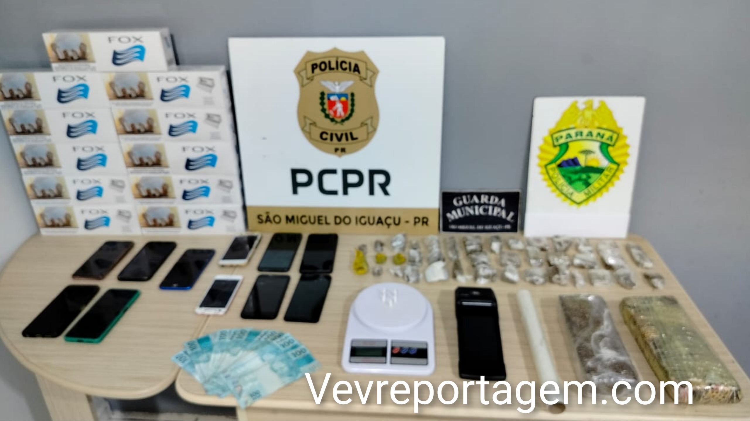 Com o apoio de outras forças de segurança, foram realizadas buscas no estabelecimento, resultando na apreensão de entorpecentes, dinheiro obtido por meio do tráfico, balanças de precisão, materiais para embalagem de drogas e diversos aparelhos celulares.