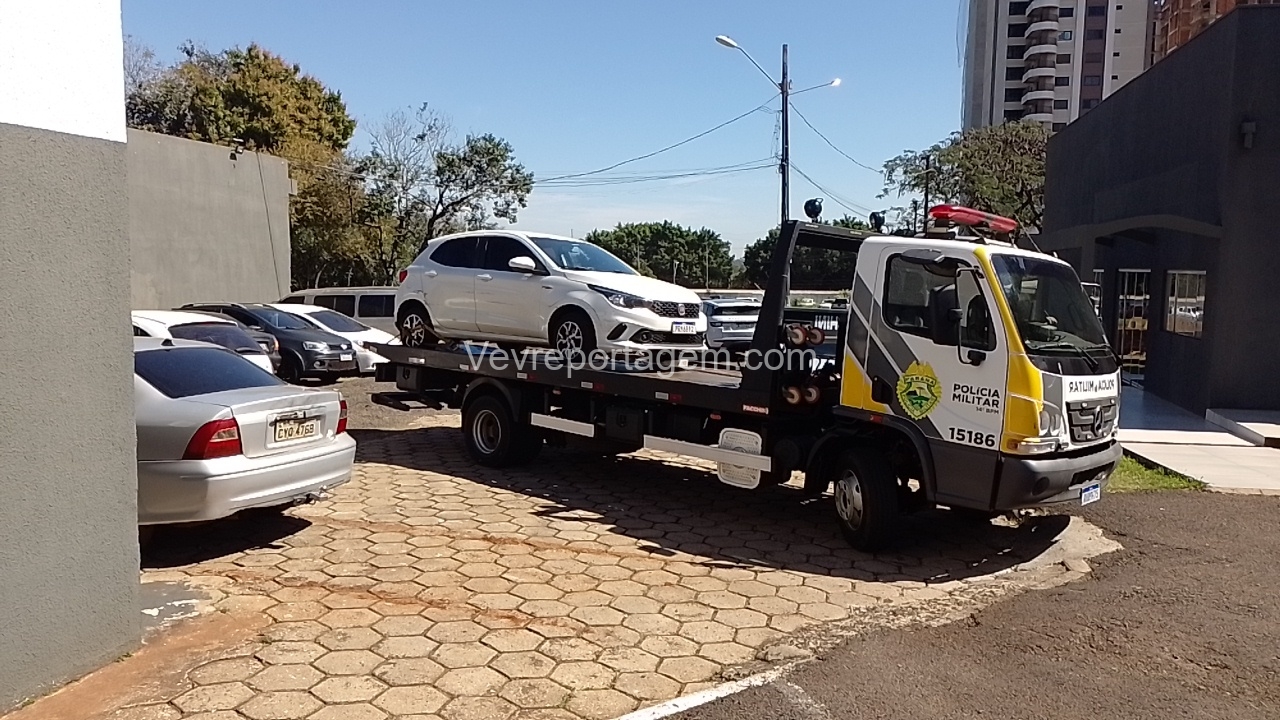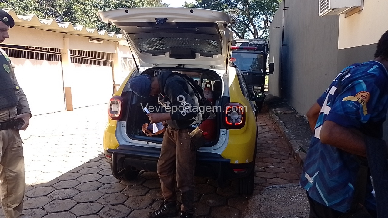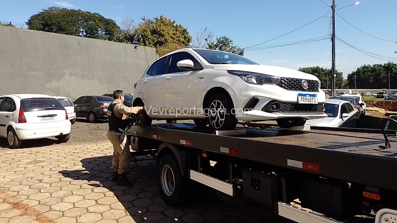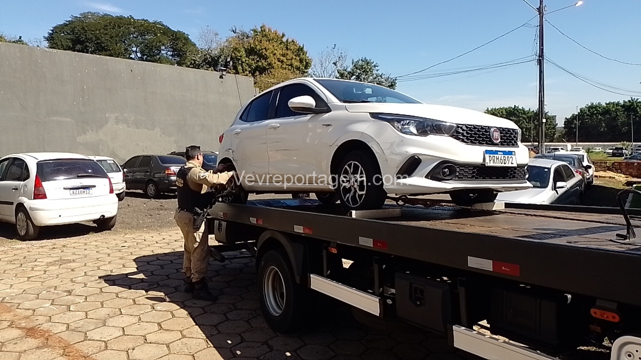 Ao chegarem ao local, a equipe abordou dois indivíduos que estavam dentro de um automóvel. Durante a checagem da placa, foi constatado que o veículo possuía registro de furto ocorrido na noite anterior.