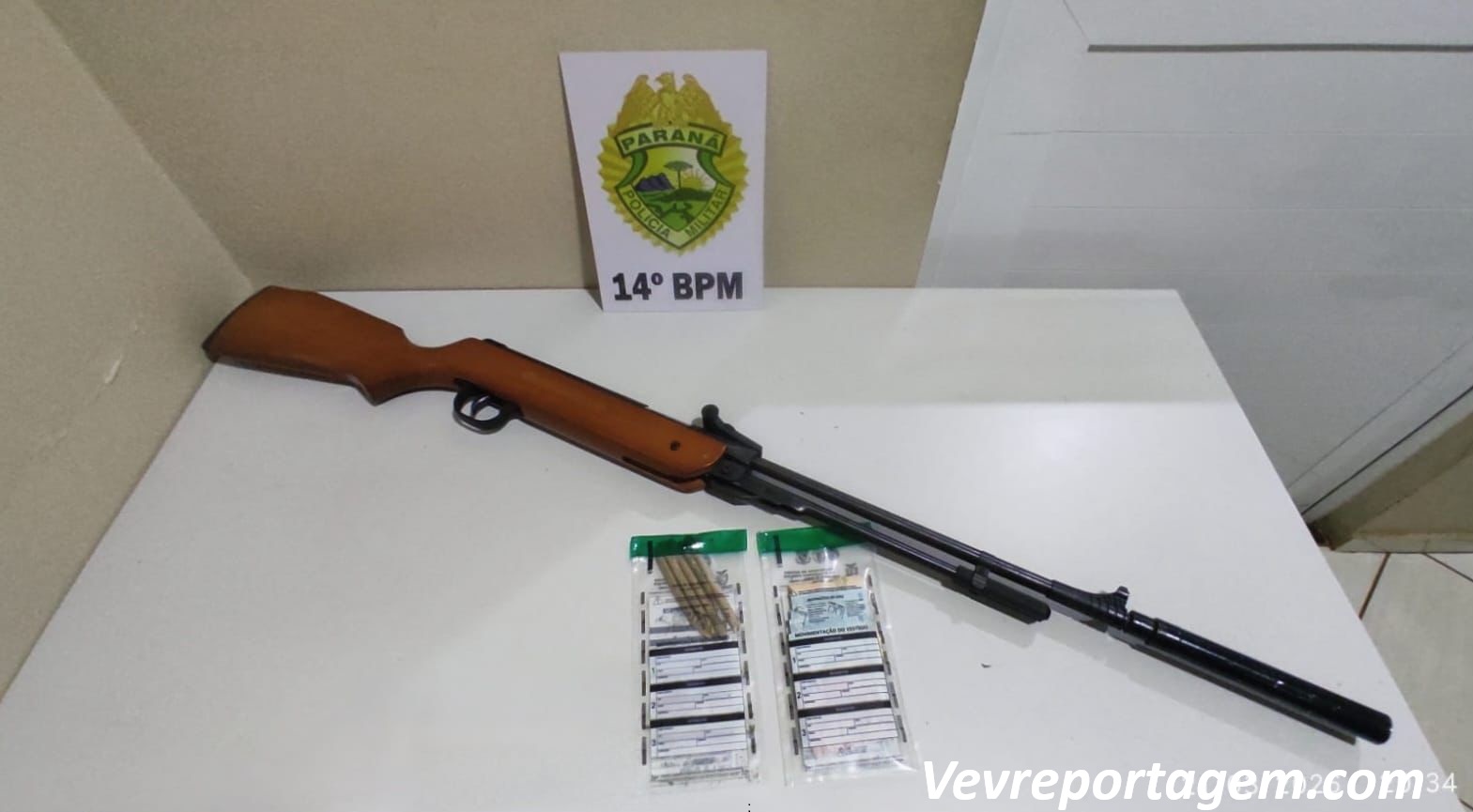 Durante as buscas, foram encontrados entorpecentes e uma arma de fogo do tipo rifle calibre .22, adaptada, além de quantia em dinheiro.
