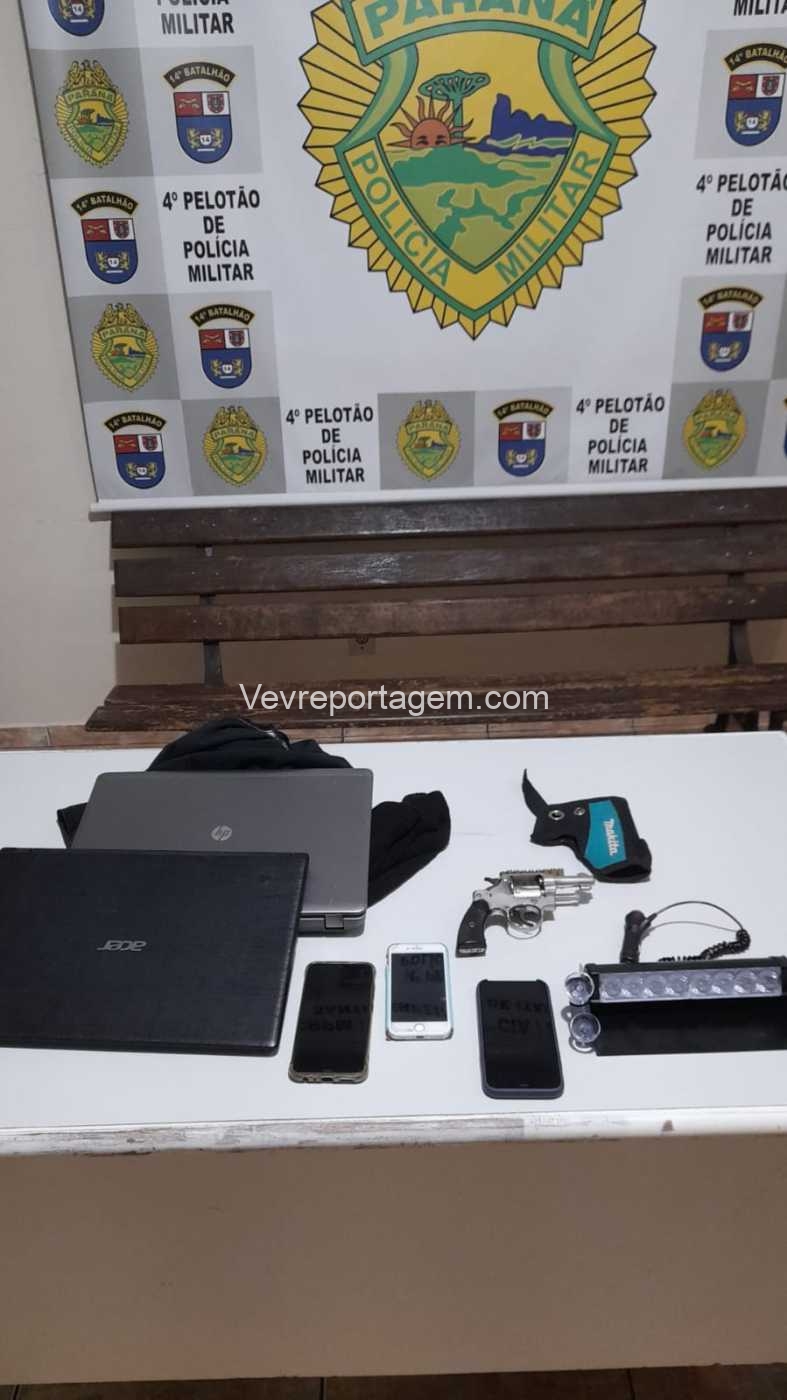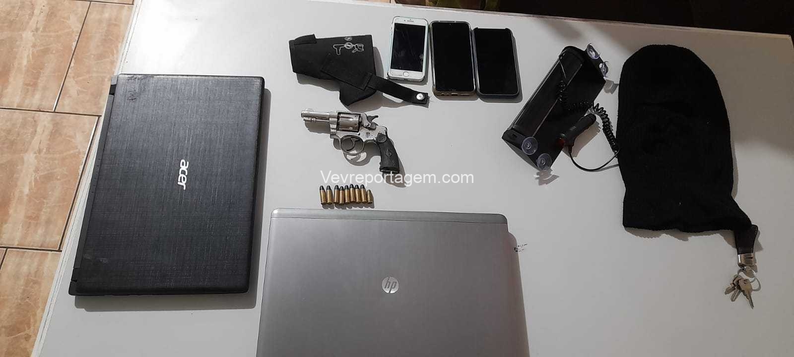 A equipe da Polícia Militar, com a equipe da Polícia Civil, foram até o endereço da motocicleta. Chegando na residência, o indivíduo confessou ser ele o autor do roubo e mostrou onde estava uma das armas utilizada para cometer o roubo. O homem levou os policiais até seu quarto e falou que a arma estava em seu guarda-roupa, foi localizado uma arma de fogo de calibre .32, toca balaclava e 9 munições de calibre .32.