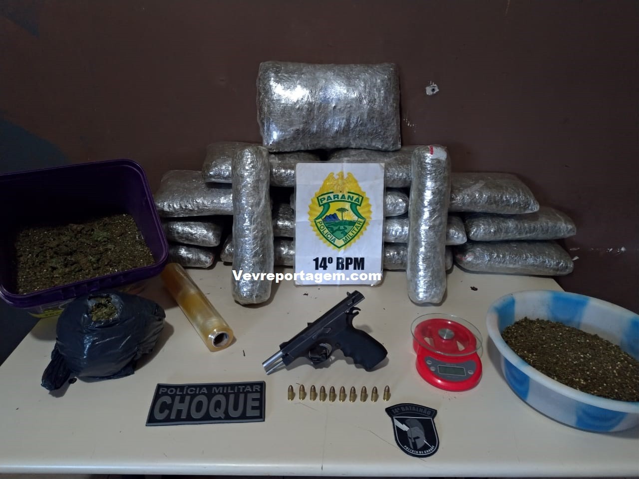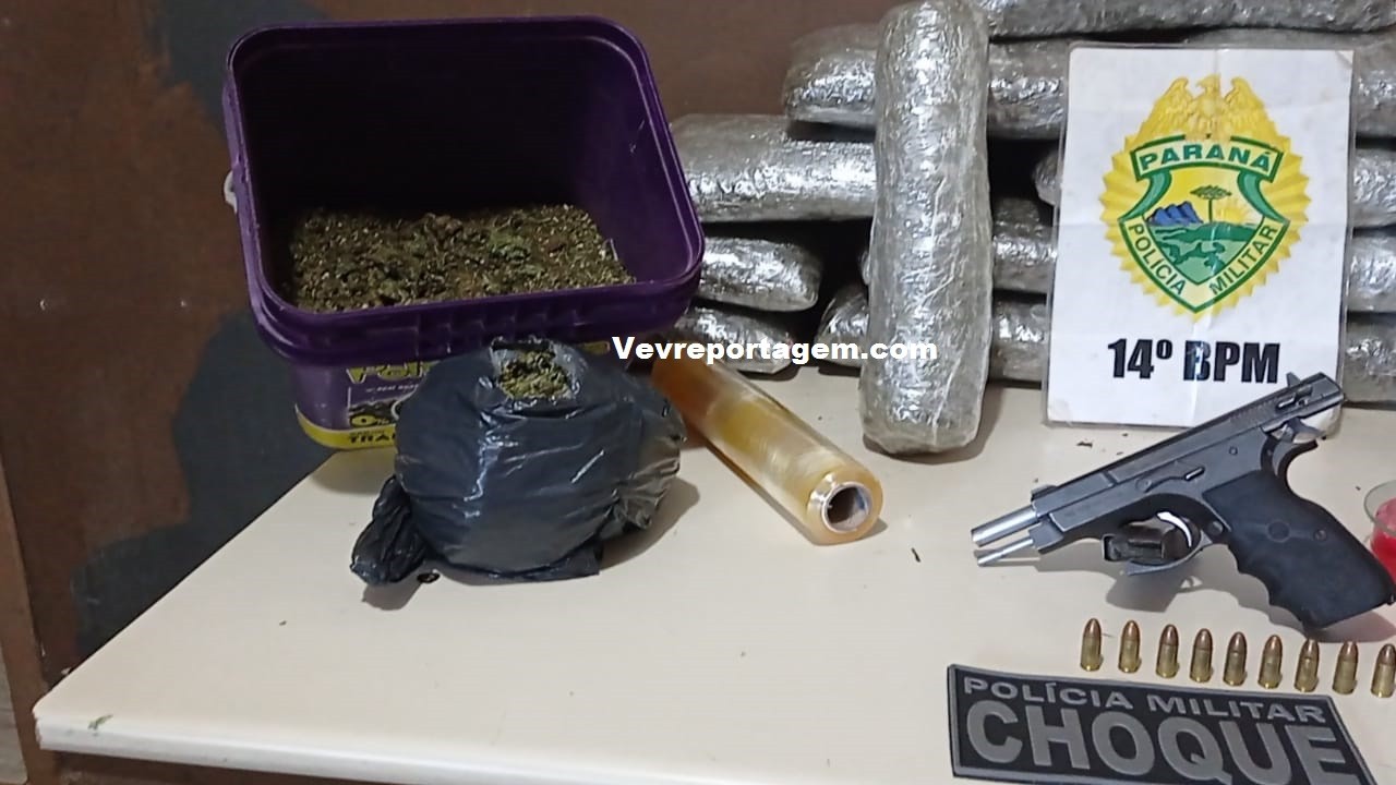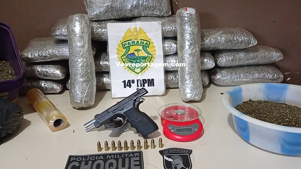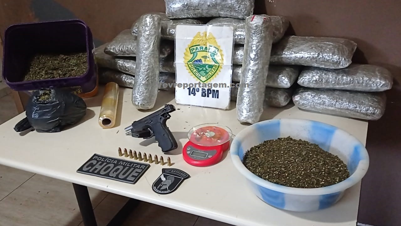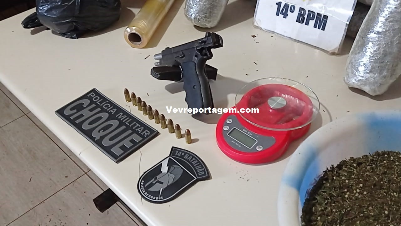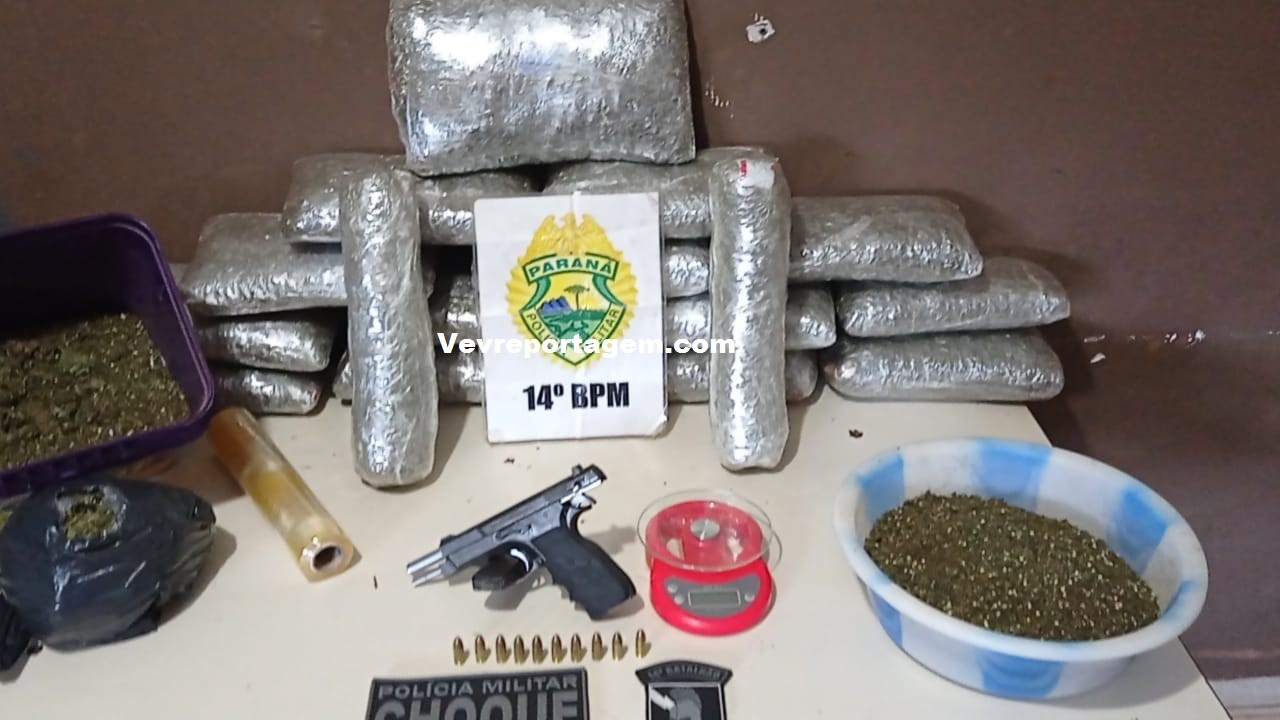 Foi quando em um outro estabelecimento que fica do lado do bar, a equipe policial sentiu forte odor da maconha, quando olharam pelas frestas observaram uma grande quantia de maconha, como o estabelecimento estava fechado o proprietário da residencia veio e assumiu a droga, o mesmo disse que estava com a droga por cerca de dois dias e iria passar a droga para uma terceira pessoa, porém não disse quem seria esta pessoa. As vistoria continuaram e foi localizado uma pistola 9mm de fabricação chinesa com 10 munições intactas e com a numeração raspada.