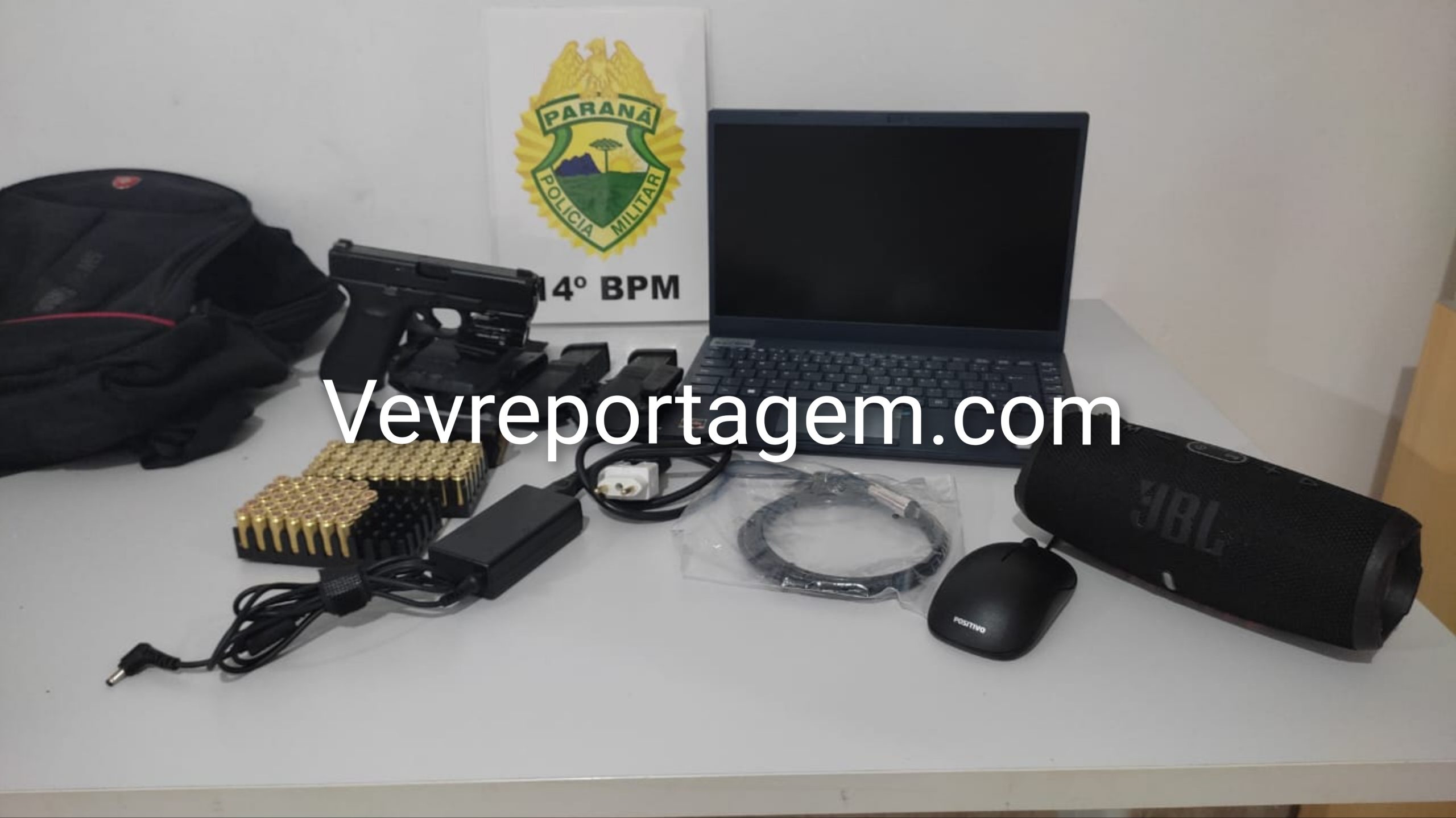 Ao checar os fundos da residência, o policial flagrou uma mulher pulando o muro para a casa vizinha. Ele deu voz de abordagem e conseguiu detê-la. Em seguida, um vizinho encontrou uma mochila com os pertences furtados e a entregou ao proprietário. Dentro da mochila estavam: 1 pistola Glock G45 9mm, 3 carregadores, 117 munições (84 de calibre .40 e demais de 9mm), 1 notebook da marca Sony e Outros pertences do policial penal.