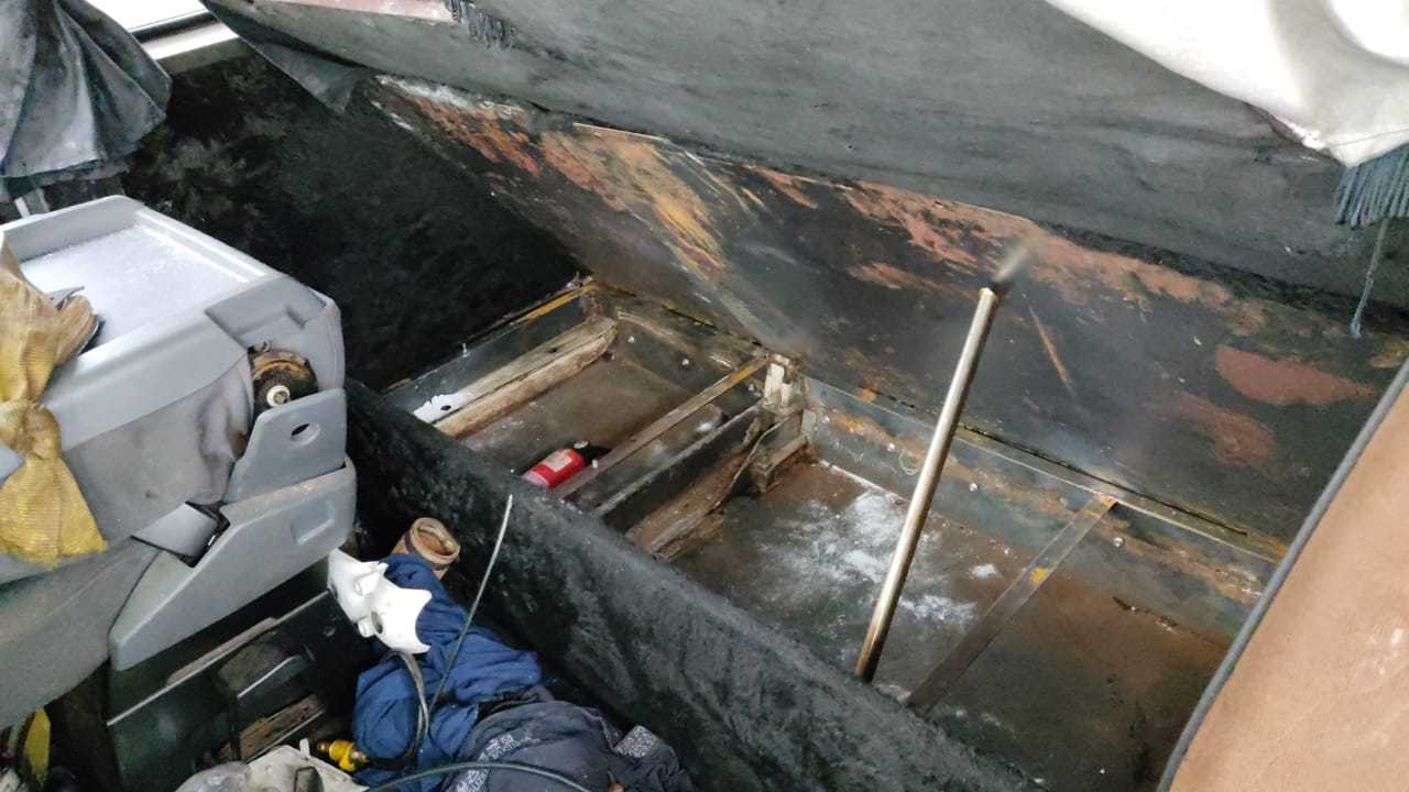 Em frente à Unidade Operacional, os Policiais Rodoviários Federais abordaram uma carreta e, após uma fiscalização pormenorizada, foram flagrados, em diversos sacos plásticos, 135 kg da substância denominada clobenzorex, ocultos em um compartimento especialmente preparado para o transporte de ilícitos sob a cama do motorista.