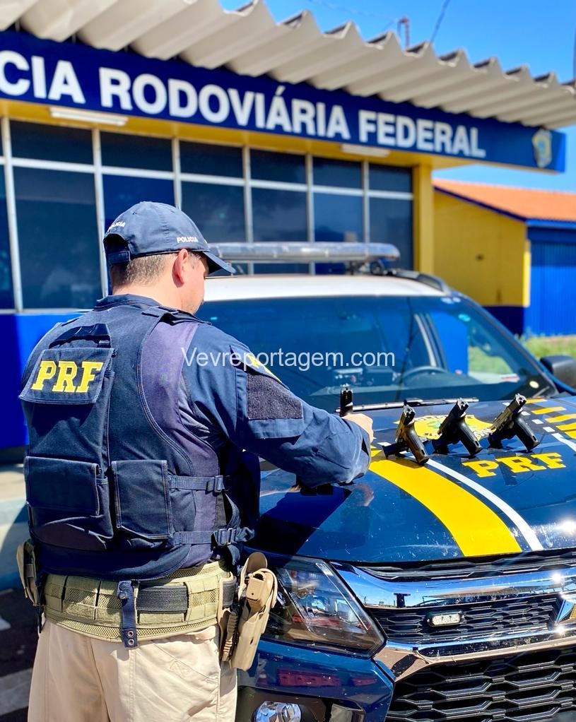 Em frente à Unidade Operacional da PRF, policiais rodoviários federais abordaram um ônibus com destino ao Rio de Janeiro e, durante a realização de revista pessoal em uma das passageiras, flagraram 5 pistolas, calibre 9mm, de origem turca e 11 carregadores, afixados por uma cinta, escondida sob suas roupas, na altura de sua cintura.