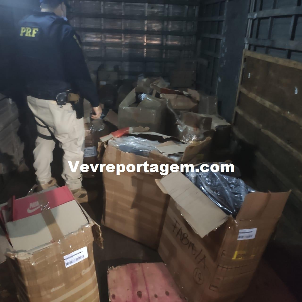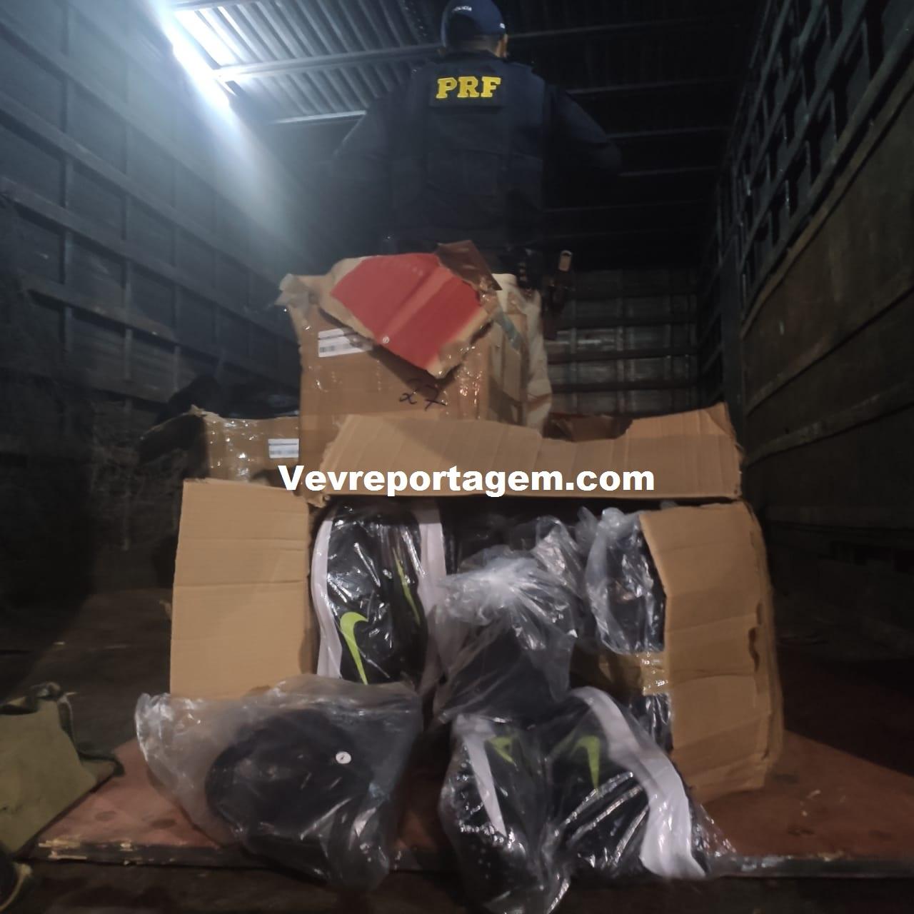 Ao fiscalizar as encomendas que estavam no interior do caminhão-baú foram encontrados diversos produtos (tênis) contrafeitos que seriam comercializados, bem como diversos volumes de embalagens (caixas) dos produtos falsificados.