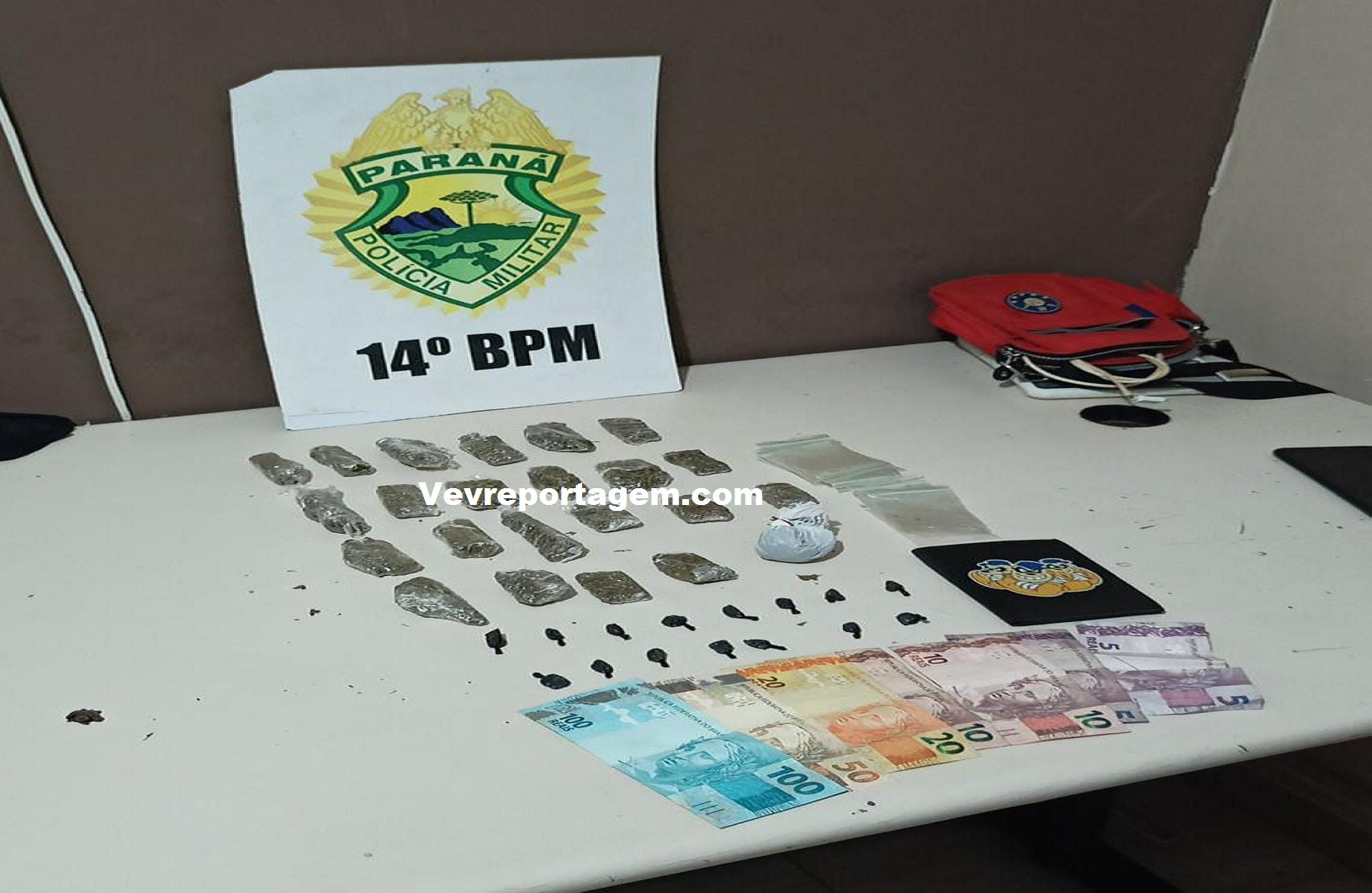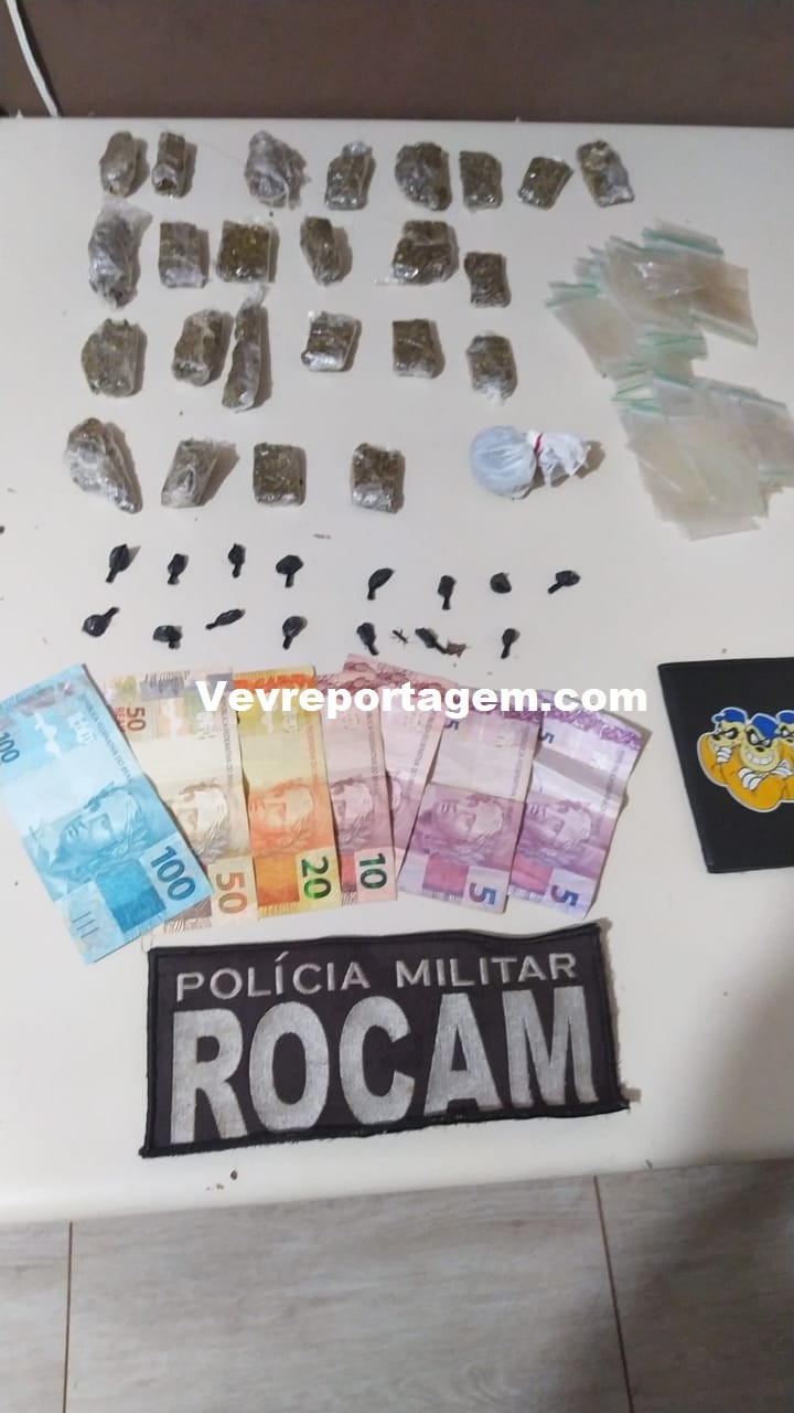 A equipe da ROCAM realizavam patrulhamento de rotina no bairro Cidade Nova, quando avistaram dois indivíduos em atitudes suspeitas, sendo realizado abordagem nos mesmos. Em revista pessoal foi encontrado com um deles 10 buchas de cocaína e 195 reais, já com outro encontrado 25 porções de maconha em uma bolsinha vermelha. Os políciais foram até a residência do menor que estava com a cocaína, e lá foi localizado mais 5 buchas de cocaína.