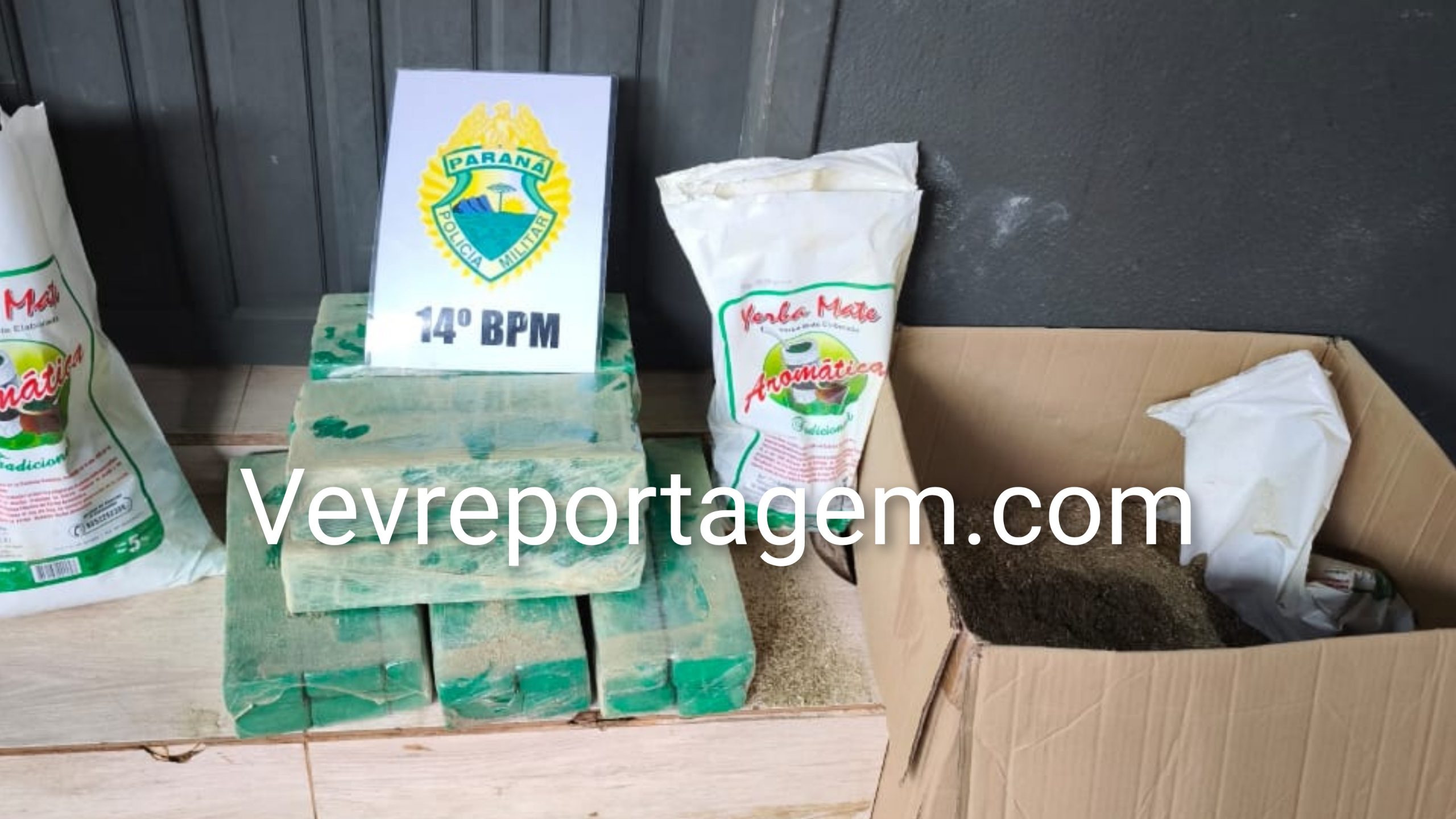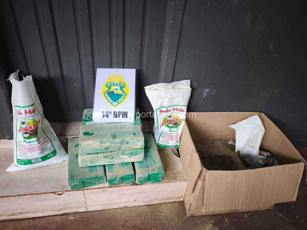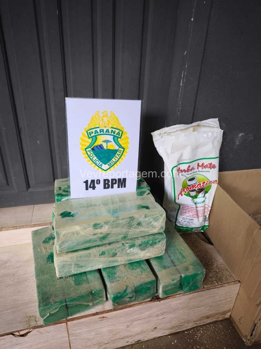 No interior da embalagem, os policiais encontraram diversos pacotes de erva-mate que escondiam tabletes de maconha, totalizando 22,4 quilos do entorpecente.