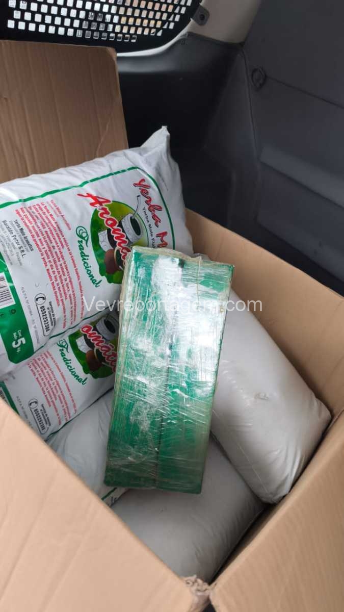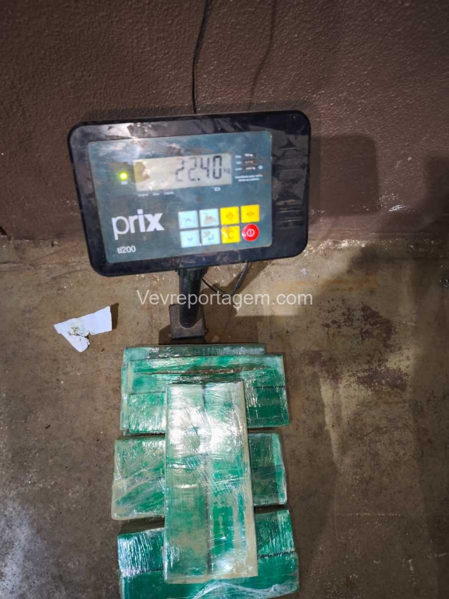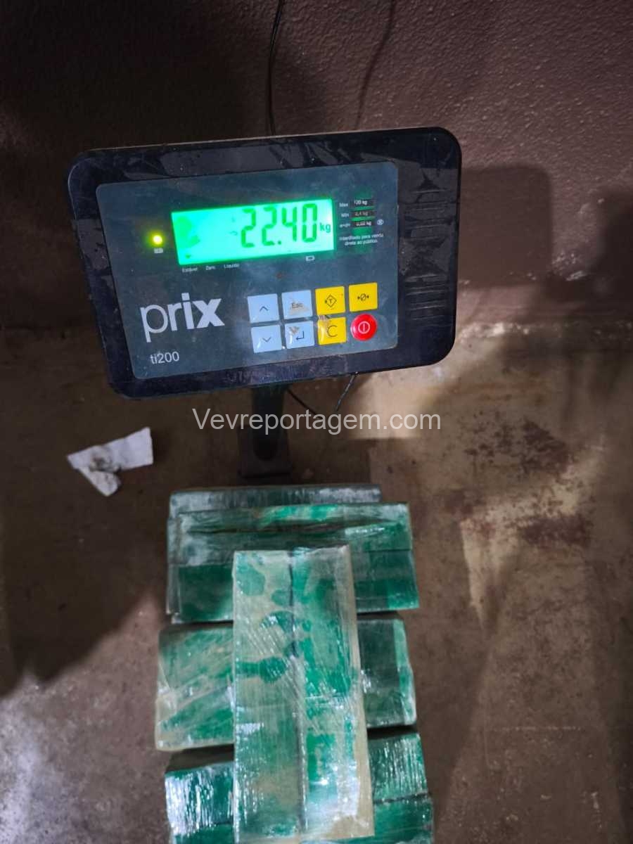 No interior da embalagem, os policiais encontraram diversos pacotes de erva-mate que escondiam tabletes de maconha, totalizando 22,4 quilos do entorpecente.