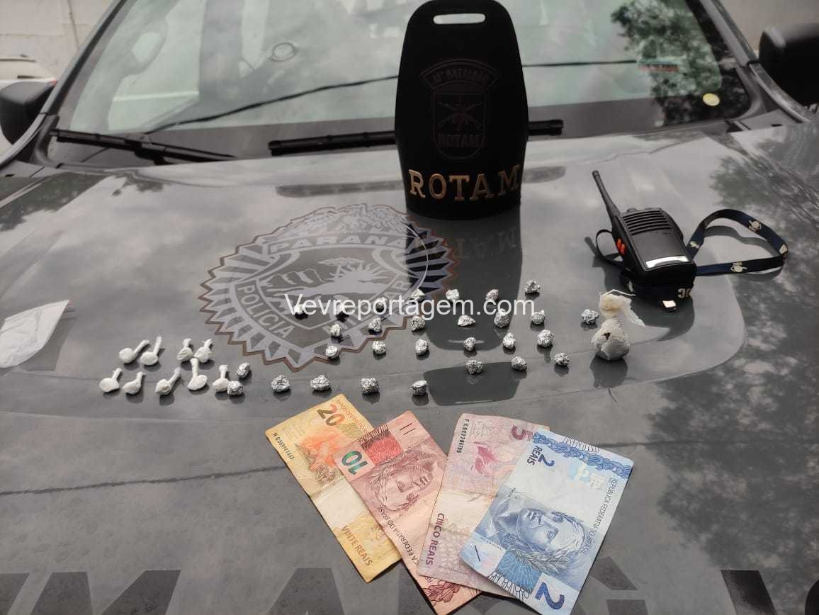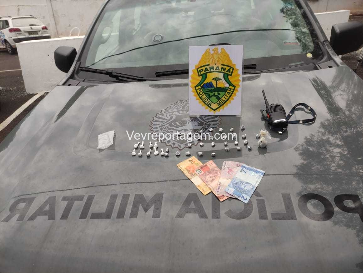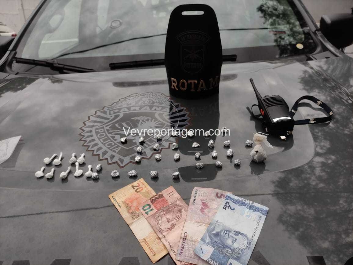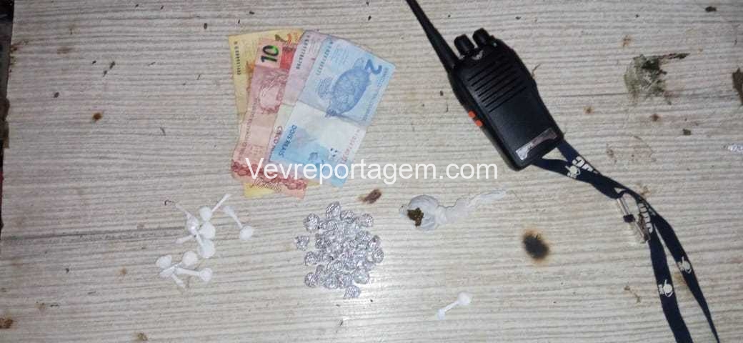 Na revista pessoal foi localizado com as duas mulheres pedras de crack, cocaína e dinheiro, em vistoria no barraco foi localizado mais algumas pedras de crack e um rádio comunicador.