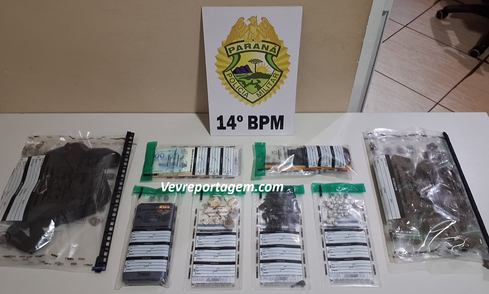 Após cerco tático, o suspeito foi abordado. Durante a verificação, foram localizadas porções de entorpecentes já fracionadas e prontas para comercialização, incluindo maconha, cocaína, crack e haxixe, além de dinheiro em espécie, aparelhos celulares e um rádio-comunicador.
