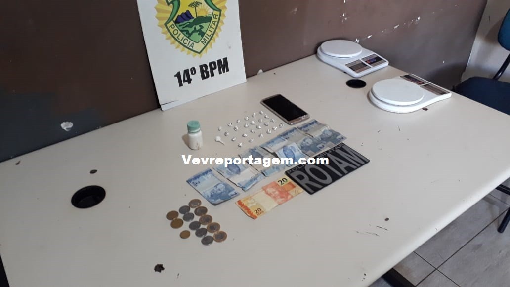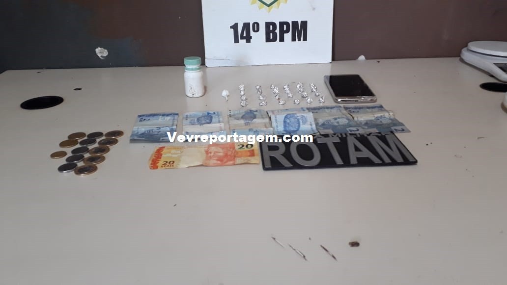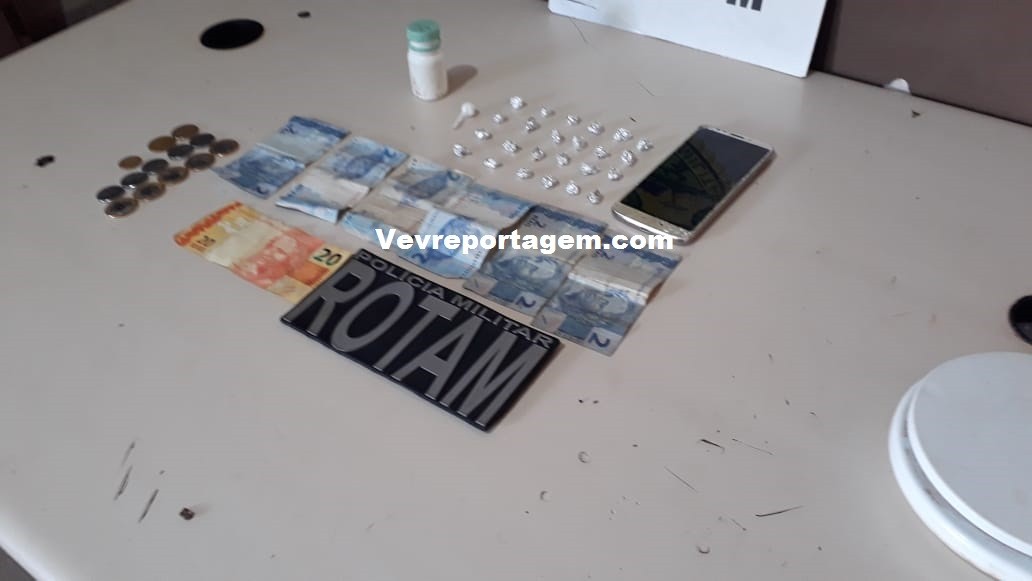 Os policiais estavam em dois na viatura e outros dois apé, onde realizaram um cerco e conseguiram abordam um dos indivíduos. No momento da fuga foi avistado que o indivíduo abordado tinha dispensado algo em uma casa que está em construção, ao verificarem encontraram notas de 2 reais, moedas e um frasco contendo buchas de cocaína.