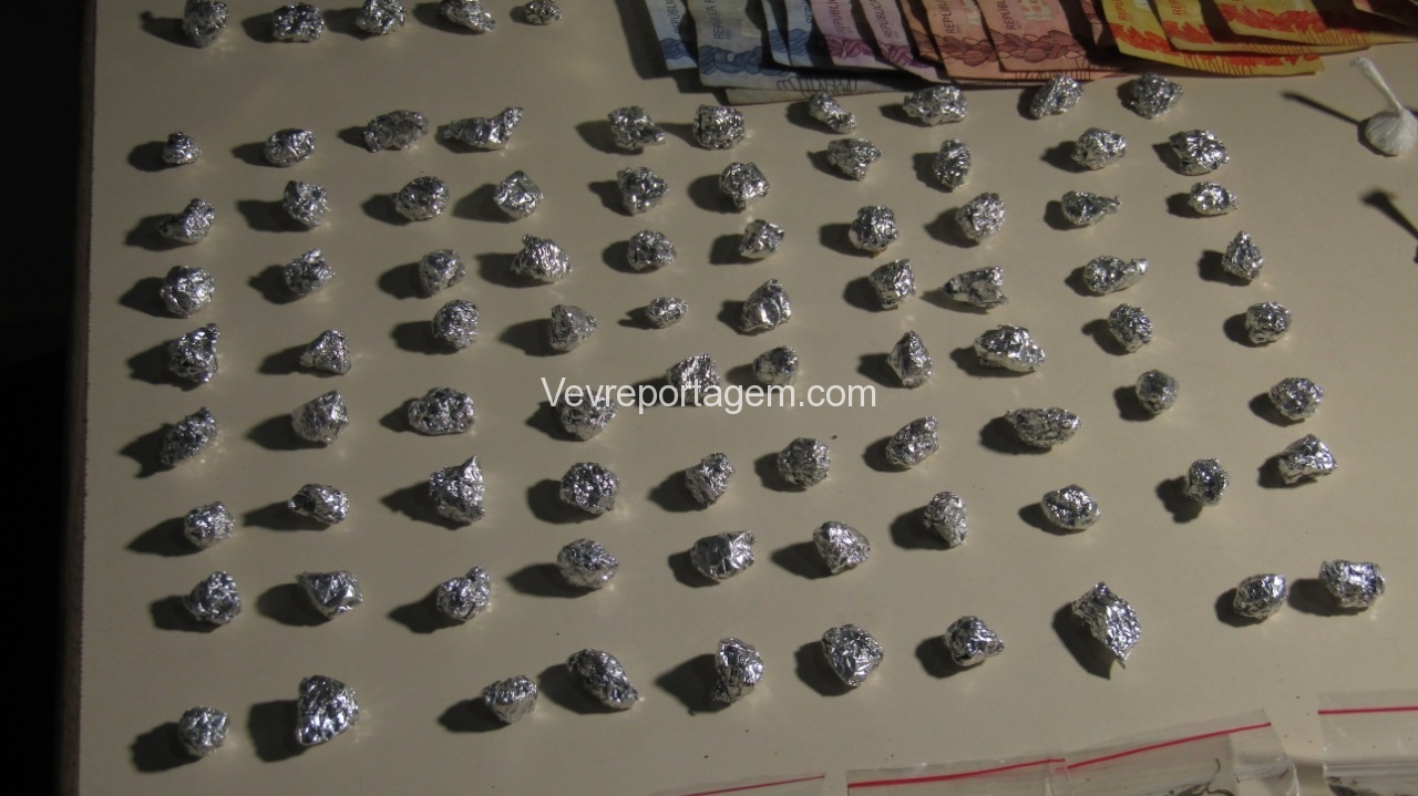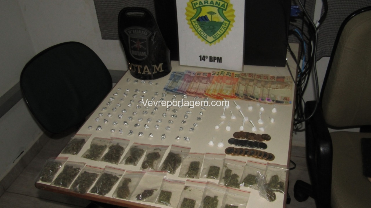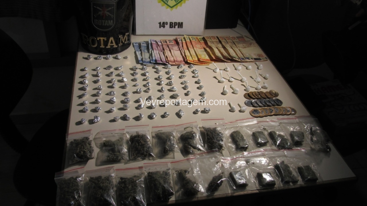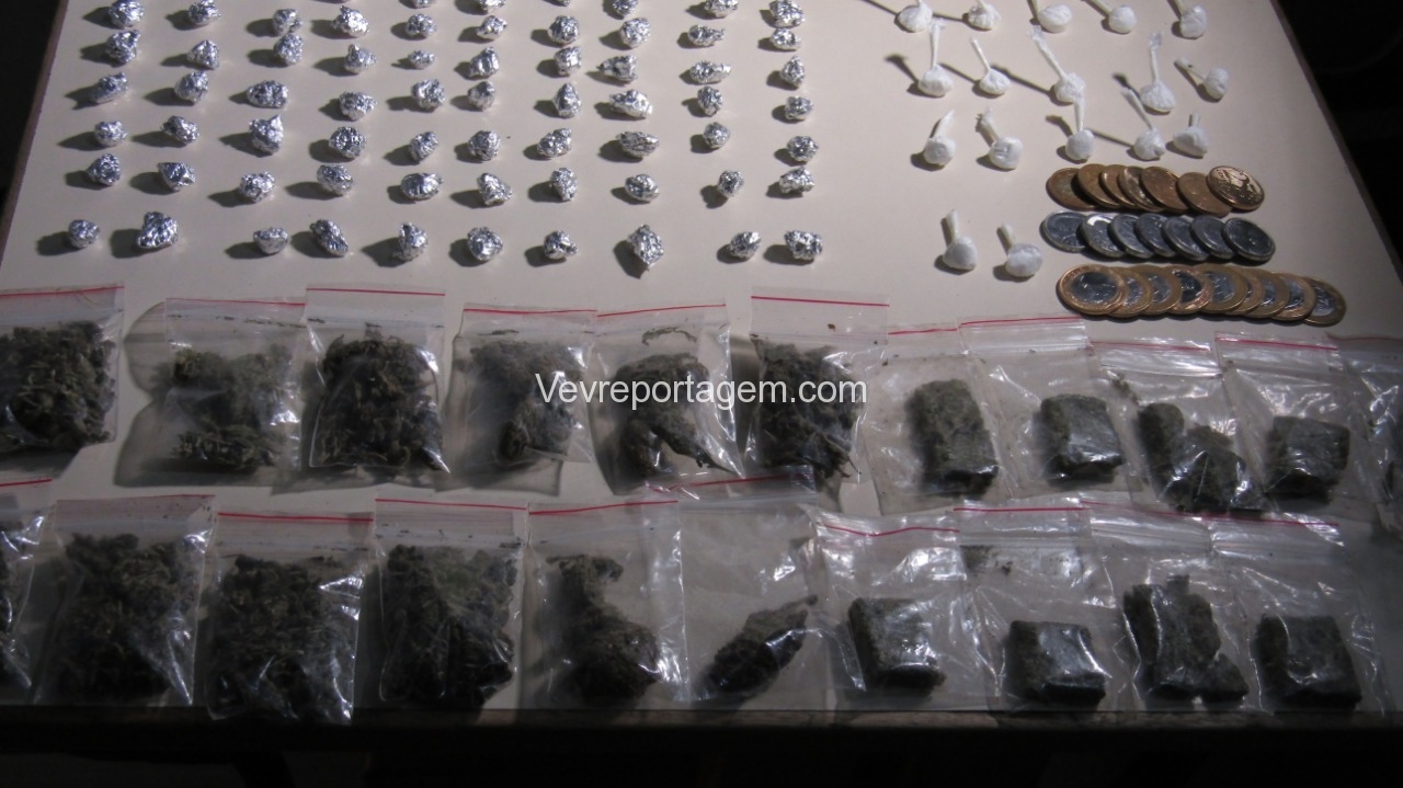 Foi realizado abordagem nos indivíduos, onde foram localizados uma pequena porção de maconha, continuado as buscas foram encontrados Cocaína, Crack, Maconha e Dinheiro.