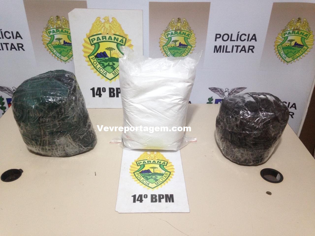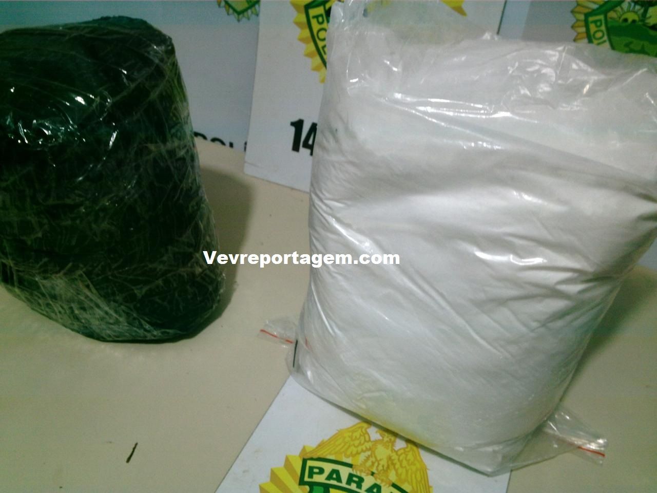 Em uma revista no automóvel foi localizado 2 pacotes grandes com mercadorias eletrônicas do Paraguai e 3 pacotes grandes de um pó branco sendo cocaína.