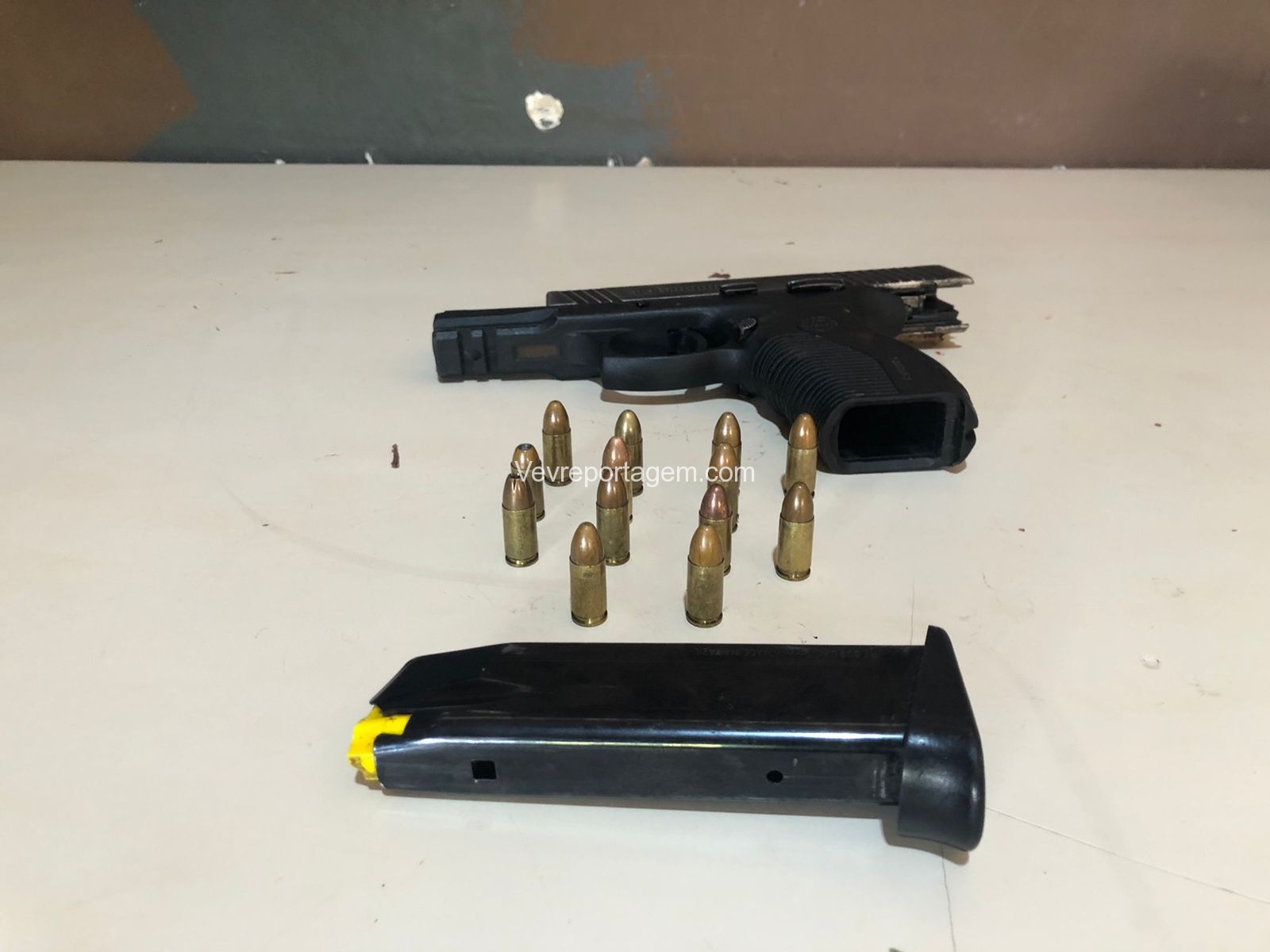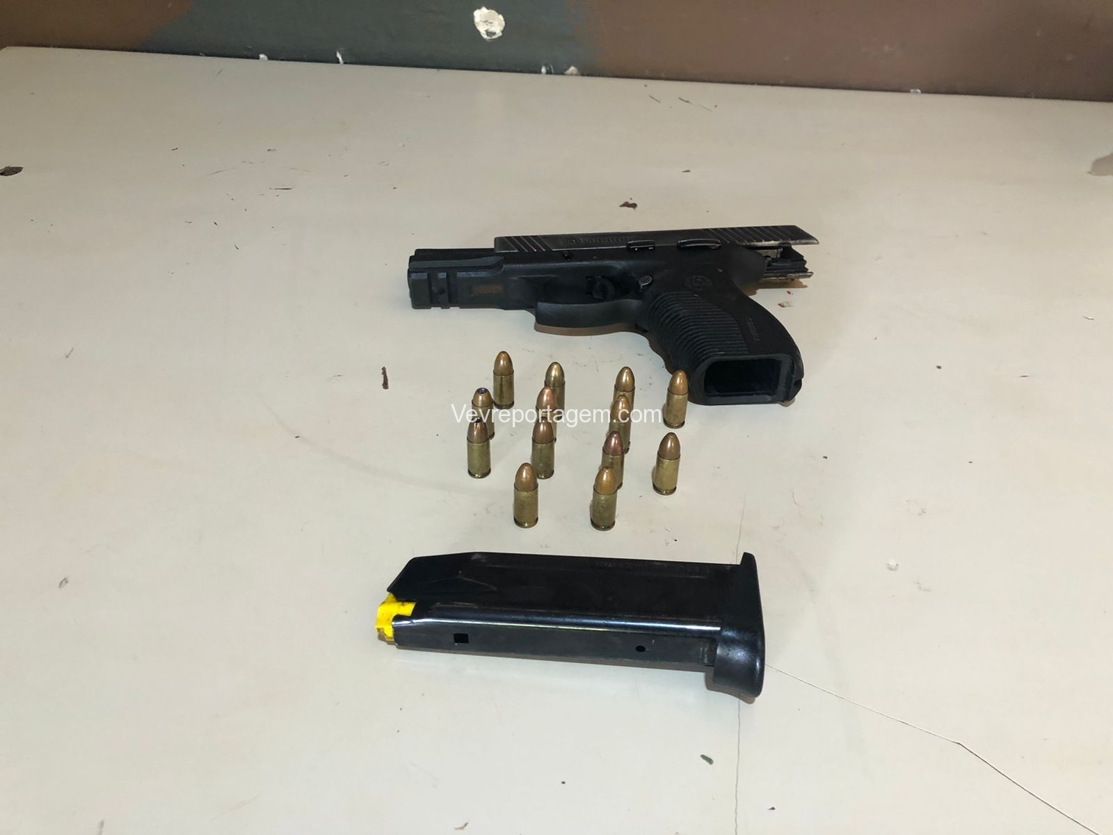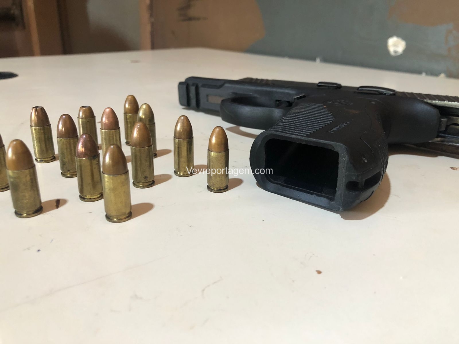 Buscas foram feitas no local, porém sem êxito o indivíduo não foi localizado, porém os policiais observaram que durante a fuga o homem dispensou um objeto então feito uma varredura no local e localizaram uma pistola 9mm com 13 munições intactas.