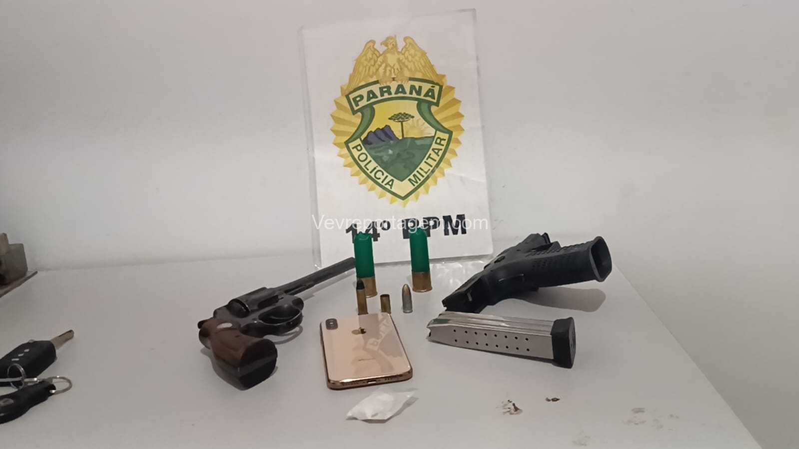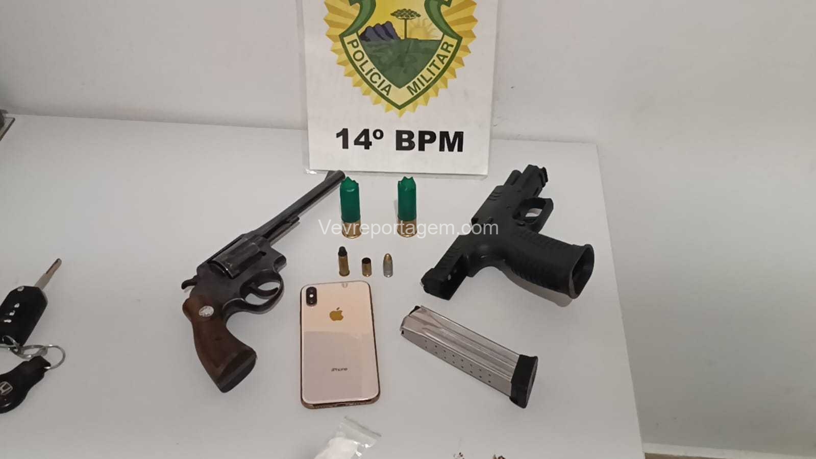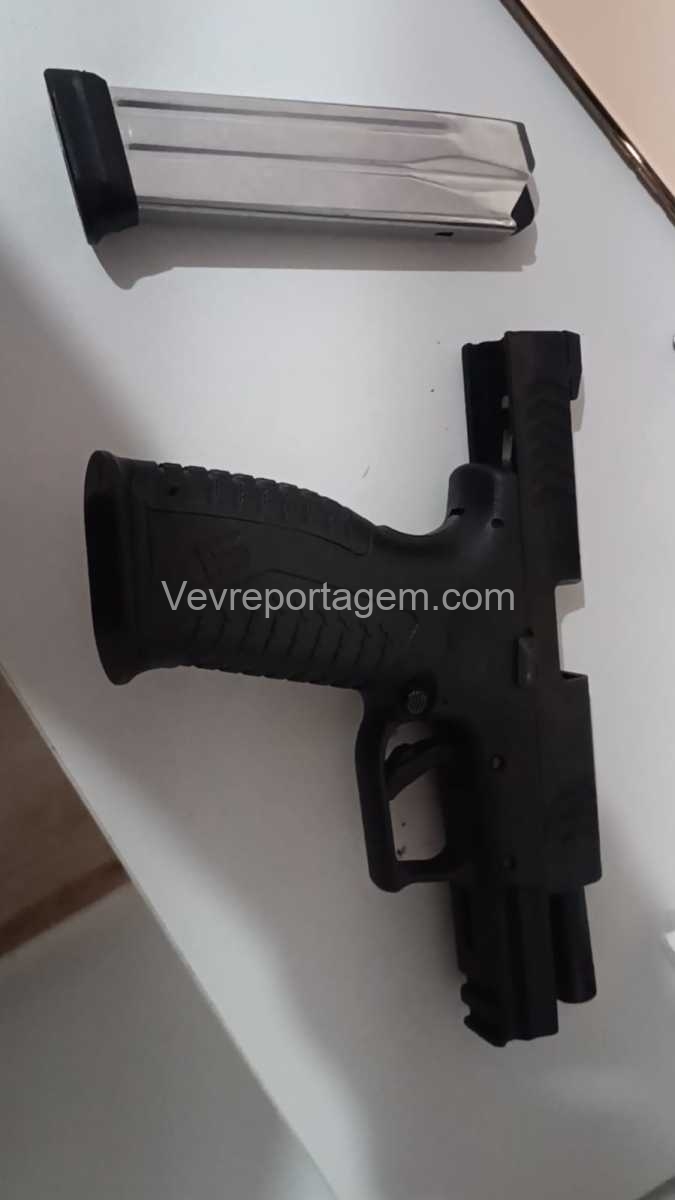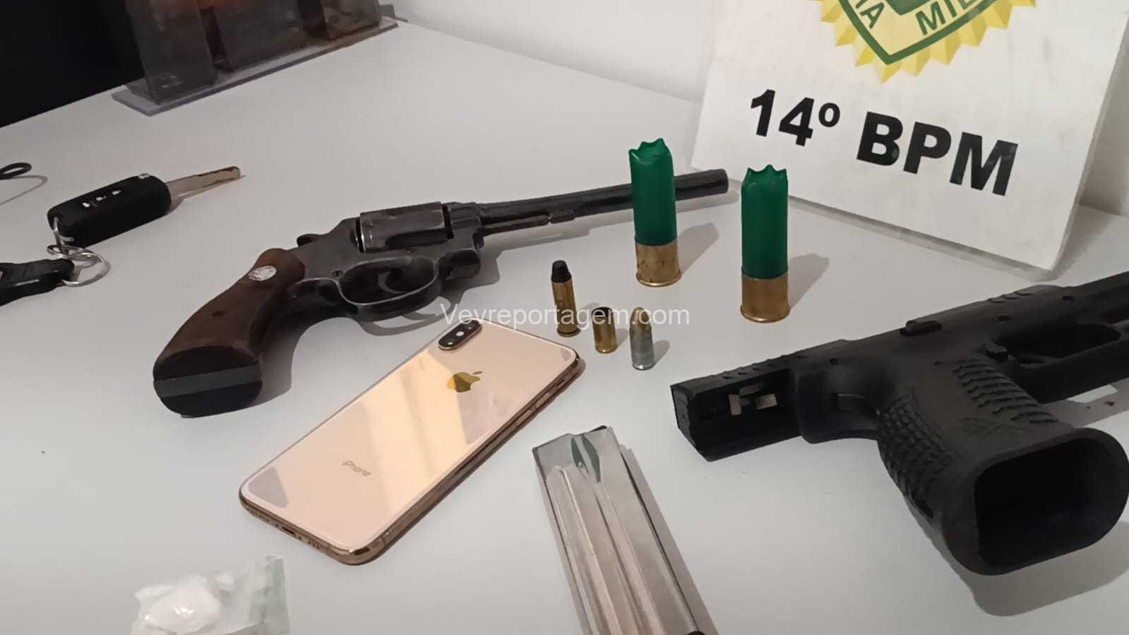 Ao chegarem ao endereço, os militares constataram que o automóvel estava aberto. Durante a vistoria no interior do carro, foram localizadas uma pistola calibre 9mm e um revólver calibre .38, ambos municiados. Nenhuma pessoa foi encontrada nas proximidades.