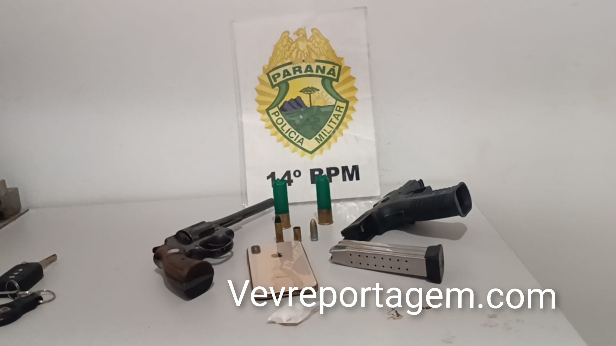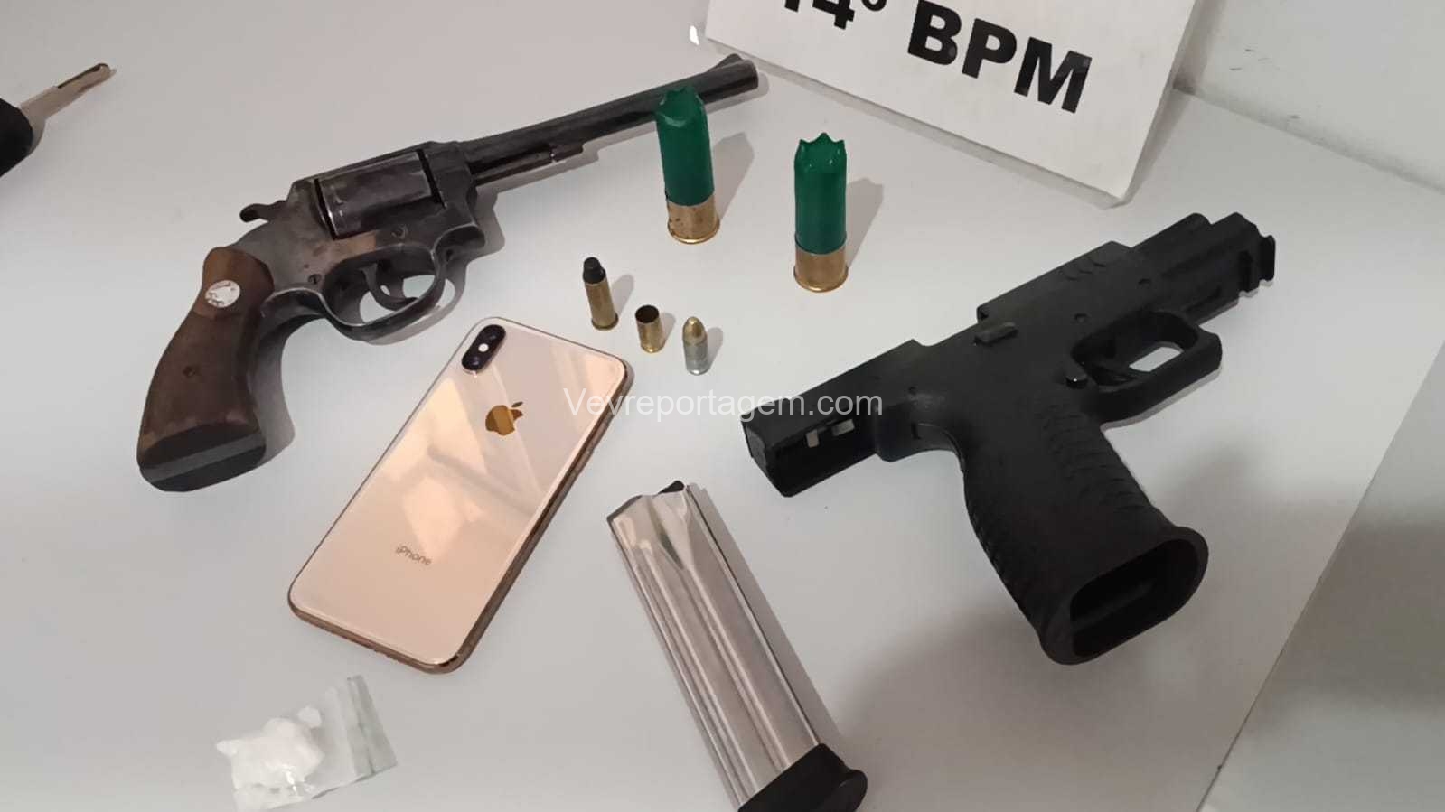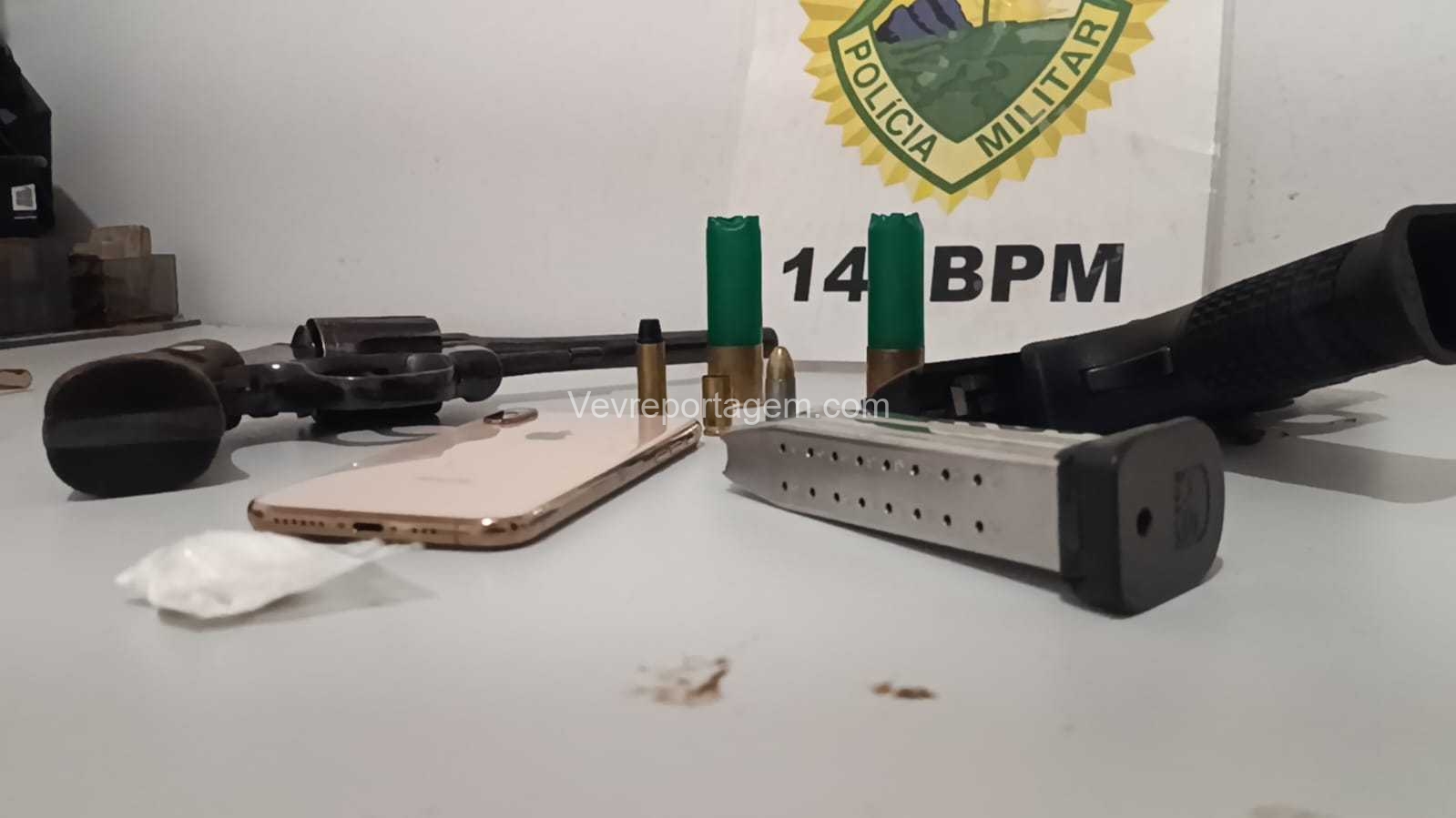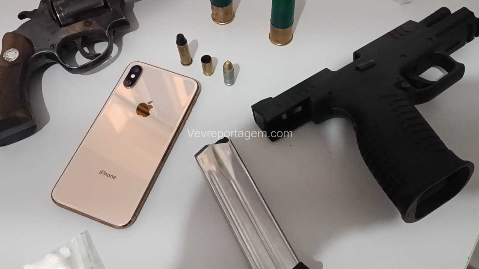 Ao chegarem ao endereço, os militares constataram que o automóvel estava aberto. Durante a vistoria no interior do carro, foram localizadas uma pistola calibre 9mm e um revólver calibre .38, ambos municiados. Nenhuma pessoa foi encontrada nas proximidades.