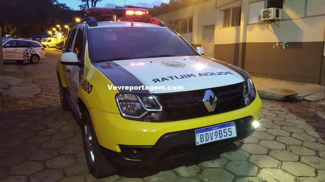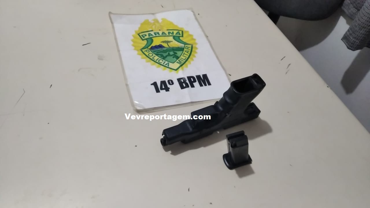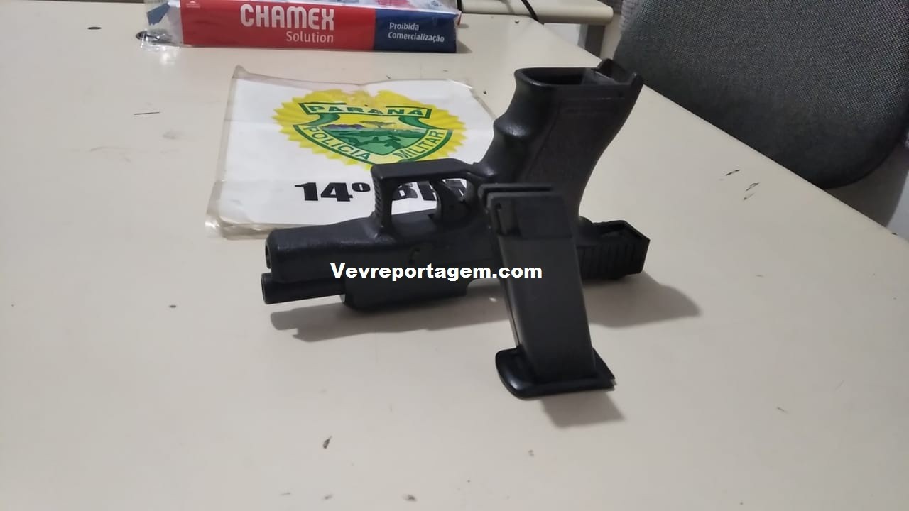 Os policiais foram até o local e localizaram o indivíduo, foi dado voz de abordagem, quando na revista pessoal localizaram na cintura do mesmo um simulacro de pistola Glock. Perguntado para o mesmo porque estava em posse daquela simulacro o mesmo disse que era para atirar nos gatos. A abordagem corria tranquilamente, foi quando chegou a esposa do indivíduo e começou a agredir verbalmente os policiais xingando com palavras de baixo calão e dizendo que os policiais eram folgados e uns bostas só faziam aquilo porque usavam a farda da Polícia Militar . Quando o policial dos Reis deu voz de prisão para a mulher por desacato e perturbação dos trabalhos, a mesma continuou xingando o policial e disse que não iria para a delegacia nem a pau momento esse que ela foi para cima do policial dando tapas e socos.