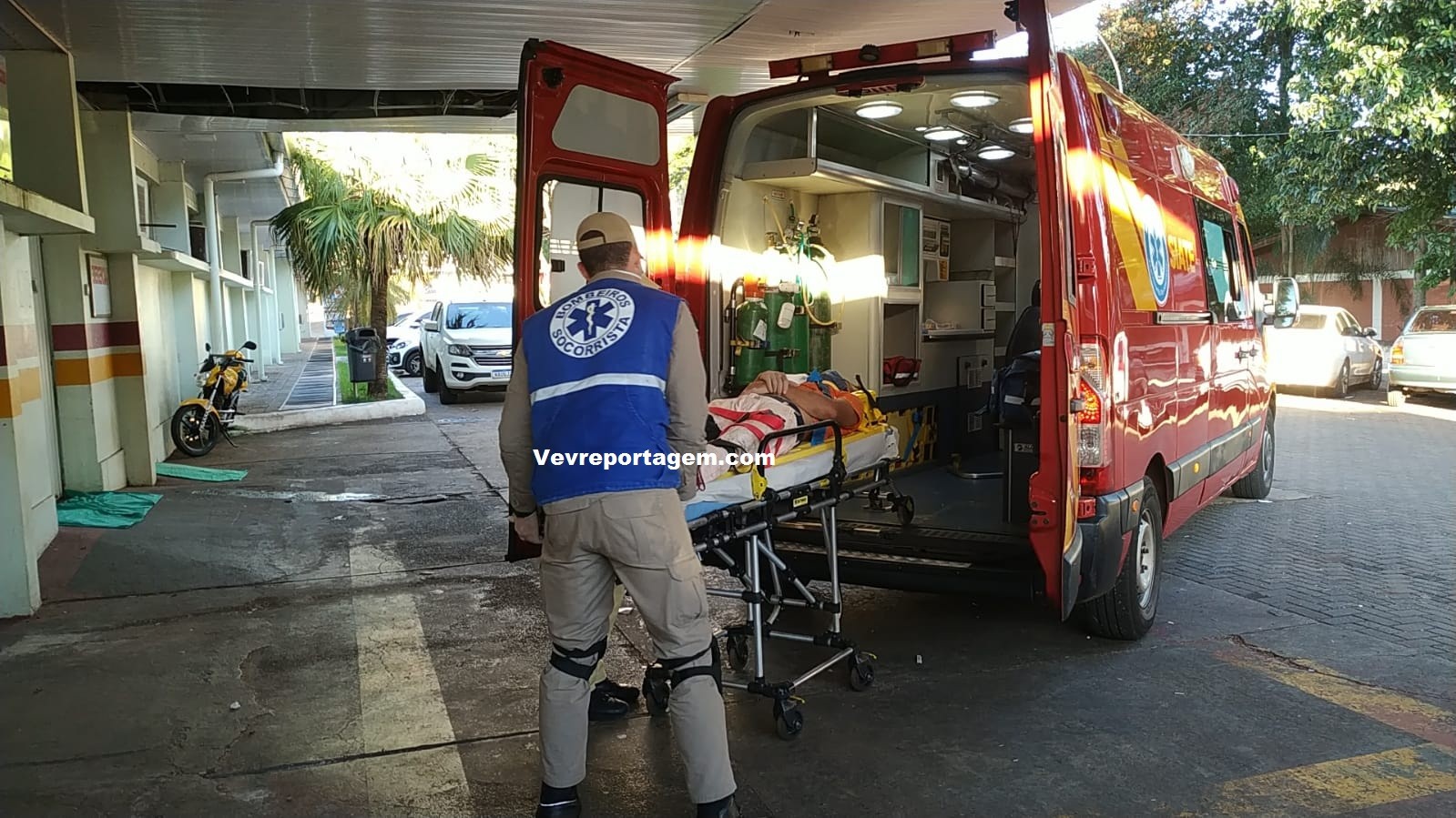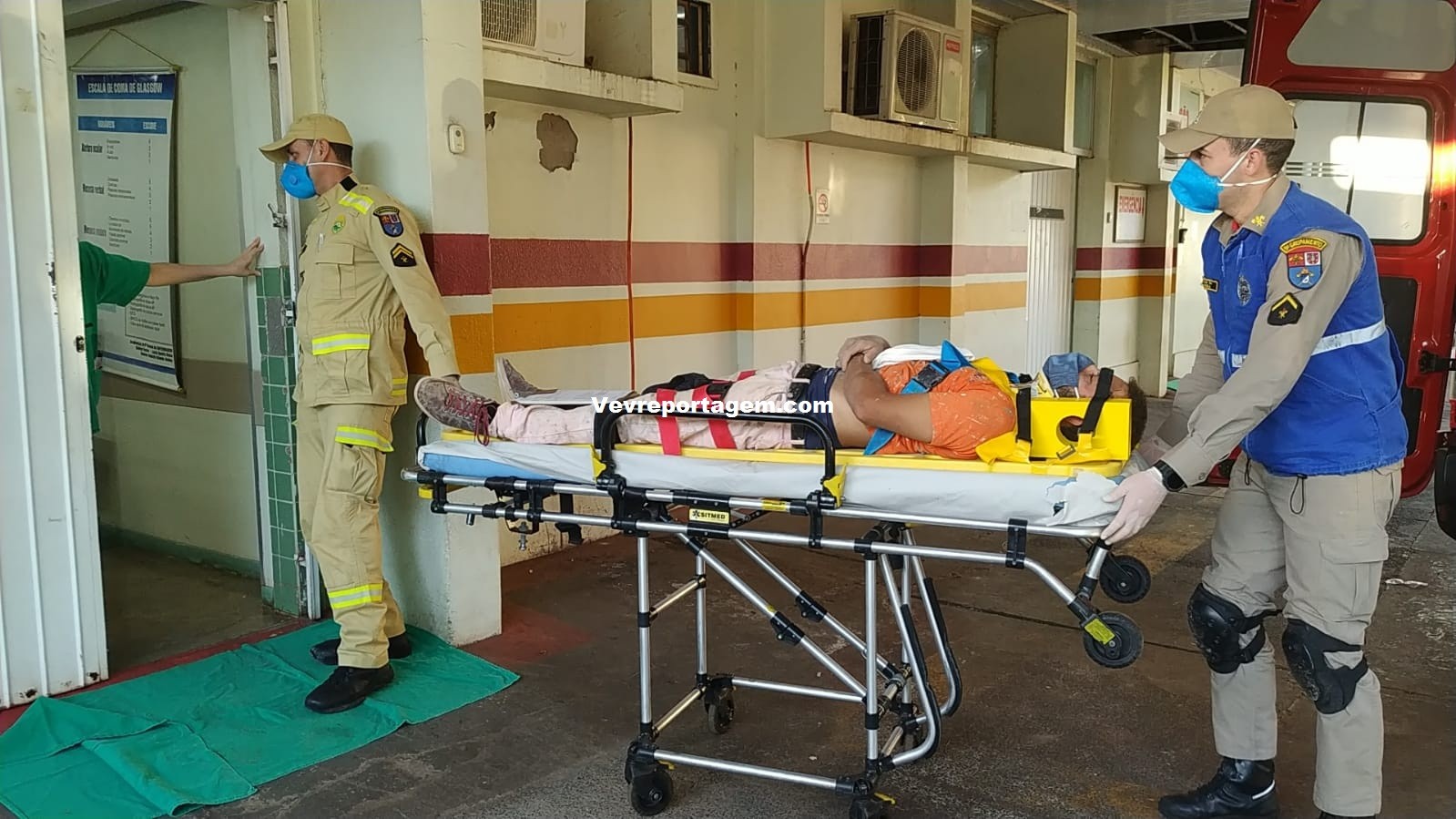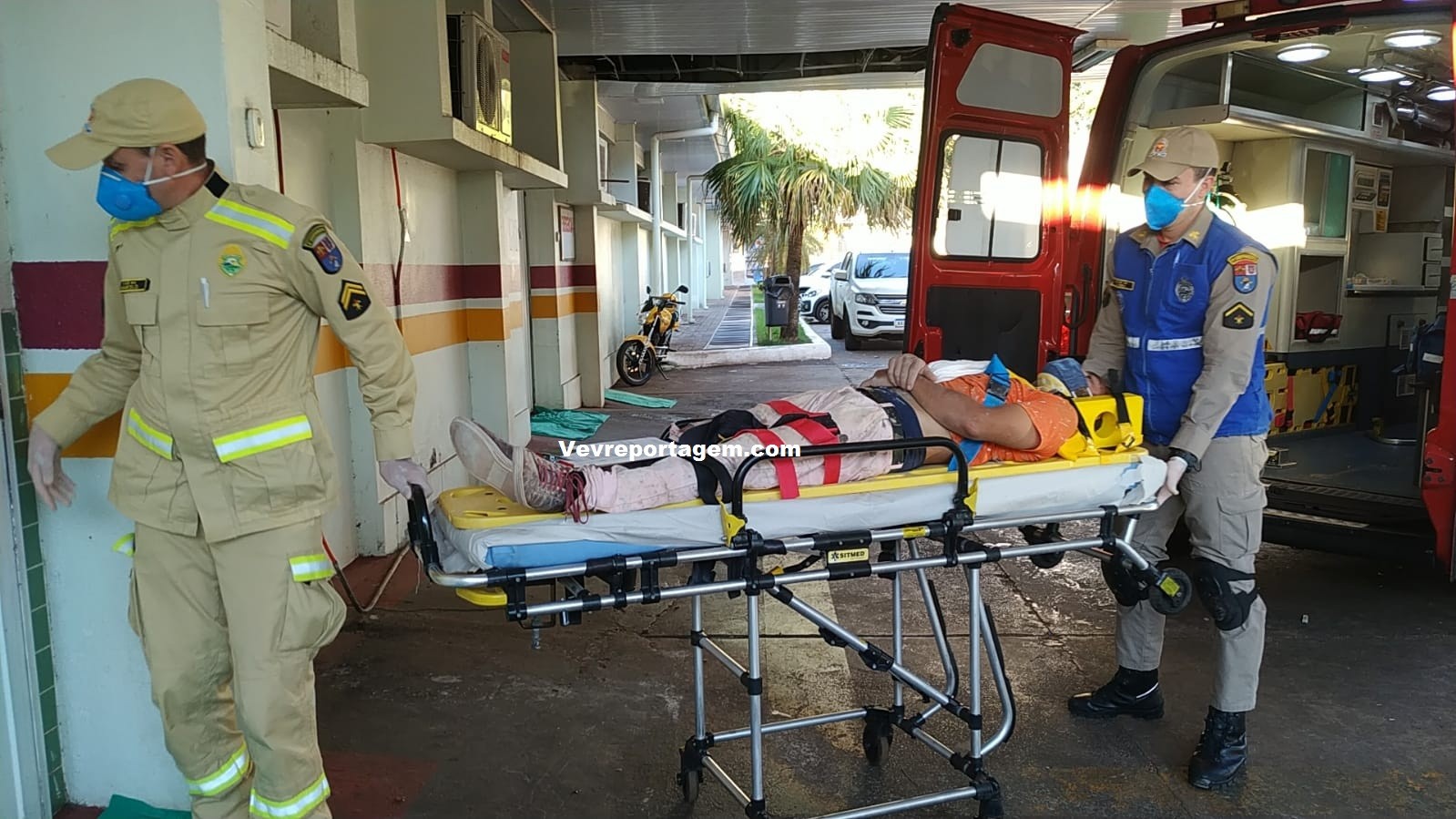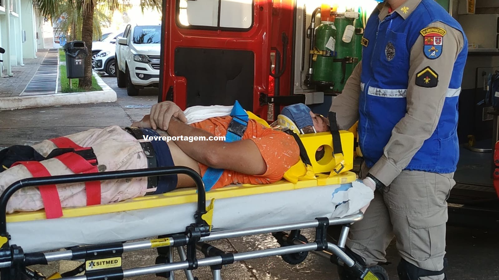 No local, foi constatado a ocorrência, porém o trabalhador estava consciente e orientado, o mesmo foi imobilizado colocado na maca e encaminhado para o interior da ambulância, onde seria melhor avaliado pelo médico.