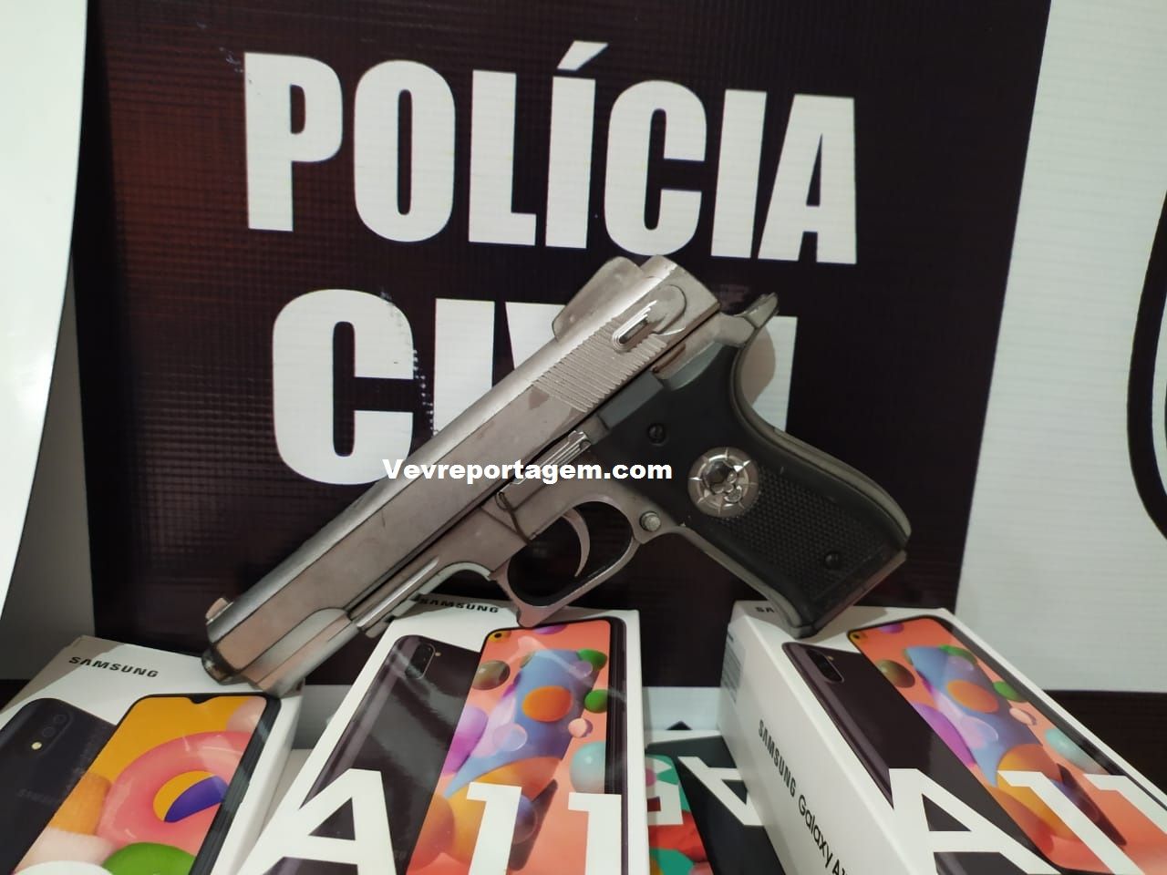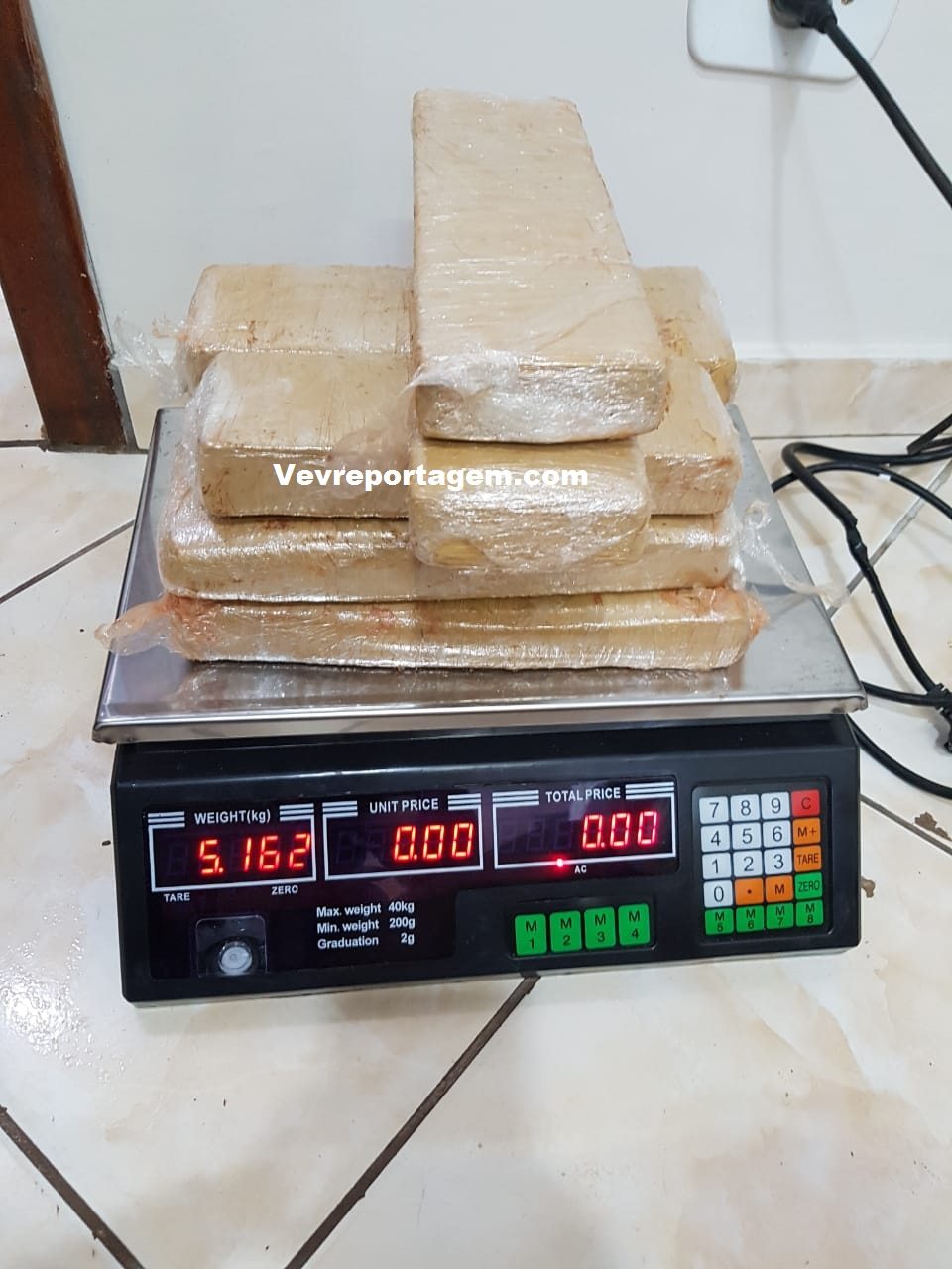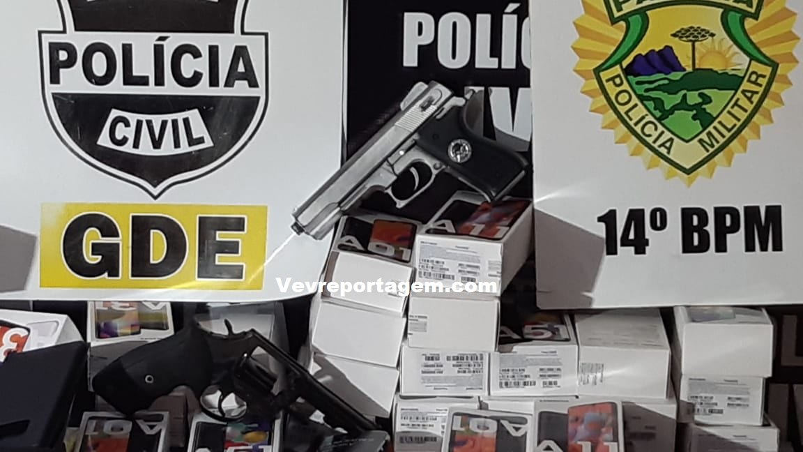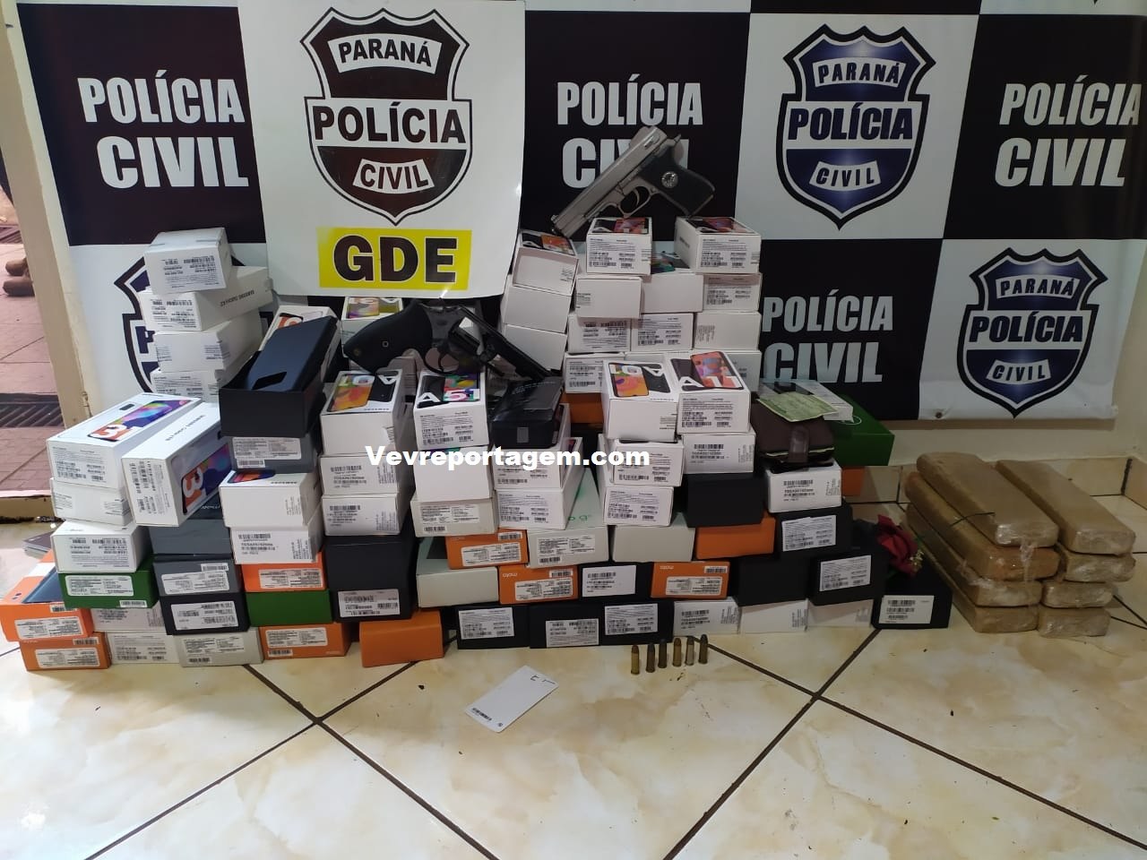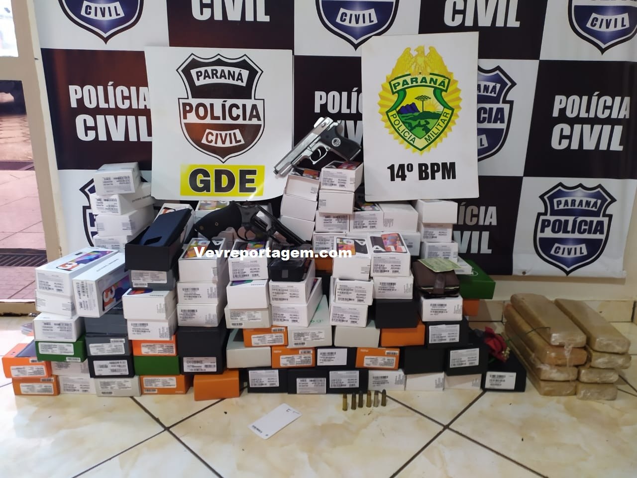 A equipe informada da ação criminosa passou a realizar diligências, quando lograram êxito em localizar os produtos oriundos do roubo em uma residência no bairro Portal da Foz. No local, os policiais localizaram os suspeitos e também uma mulher, proprietária da residência, onde os aparelhos de telefones celulares estavam armazenados, além de um revólver calibre 38, um simulacro, 8 tabletes de maconha, totalizando 5 kg (cinco quilos) de maconha e as roupas utilizados no roubo.