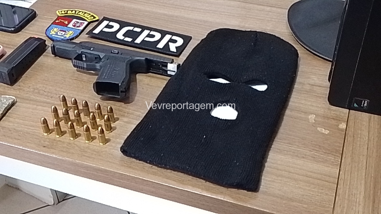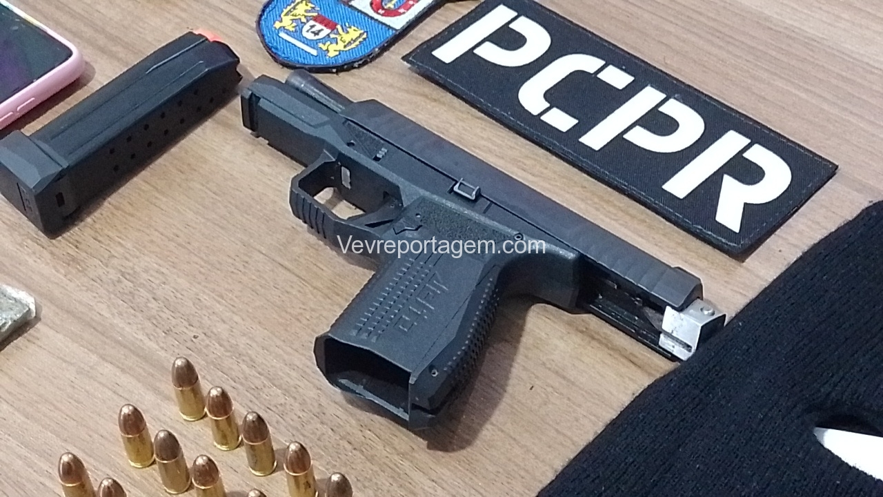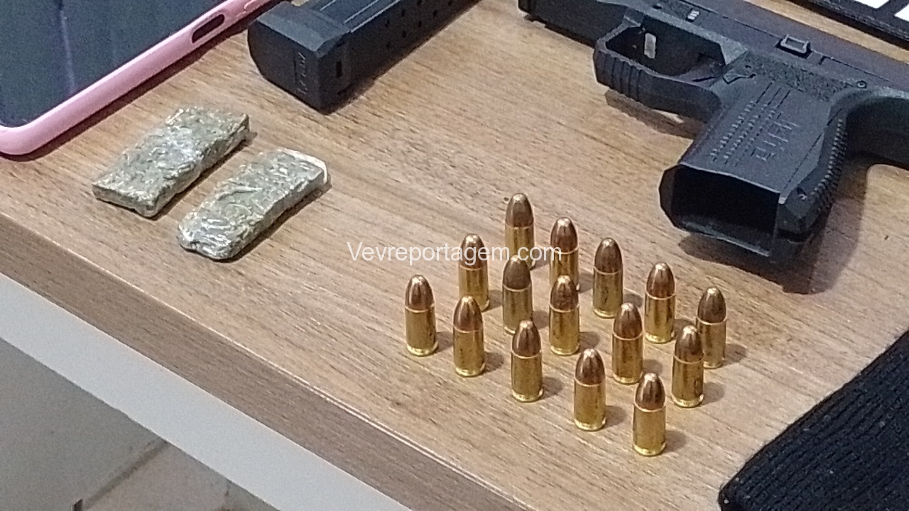 Feito a abordagem foi encontrado em.posse da mulher uma pistola calibre 9mm da marca Arex Delta, com a numeração raspada e equipada com seletor de rajada, foi encontrado também uma toca balaclava, dois tacos de maconha. A arma estava municiada com 15 munições intactas. Porém, o que chamou atenção que os indivíduos estavam usando duas mudas de roupas, provavelmente estavam prestes de cometer um crime, possivelmente um assalto, pois, todos tem passagens por roubo.