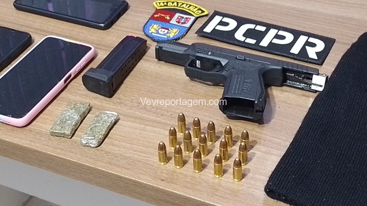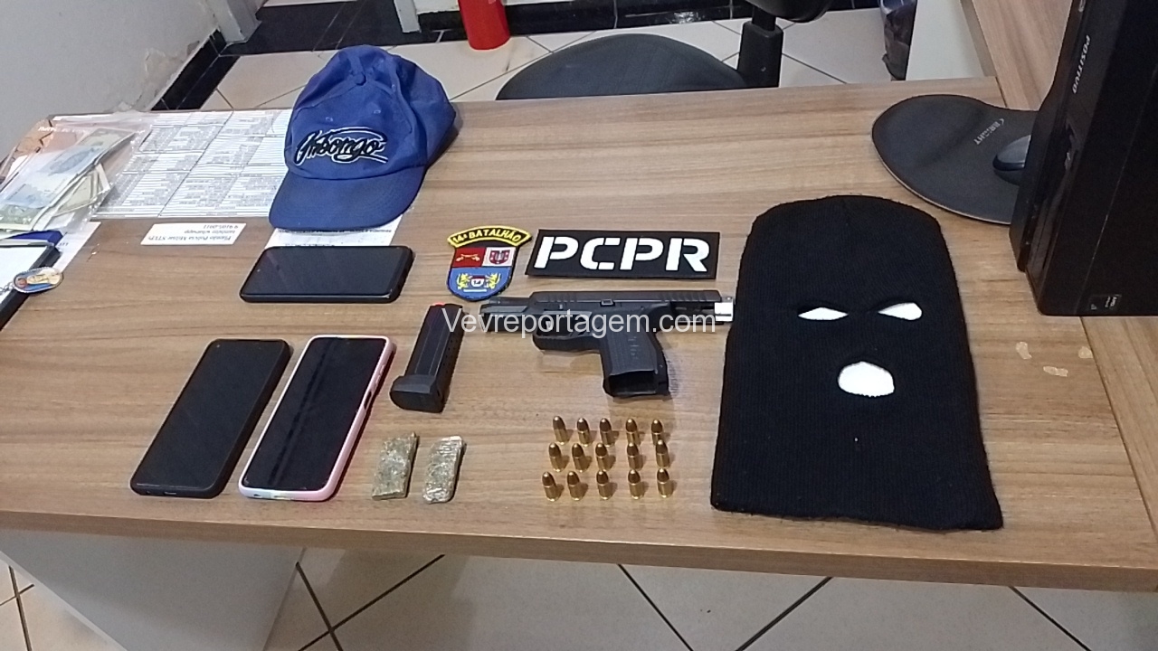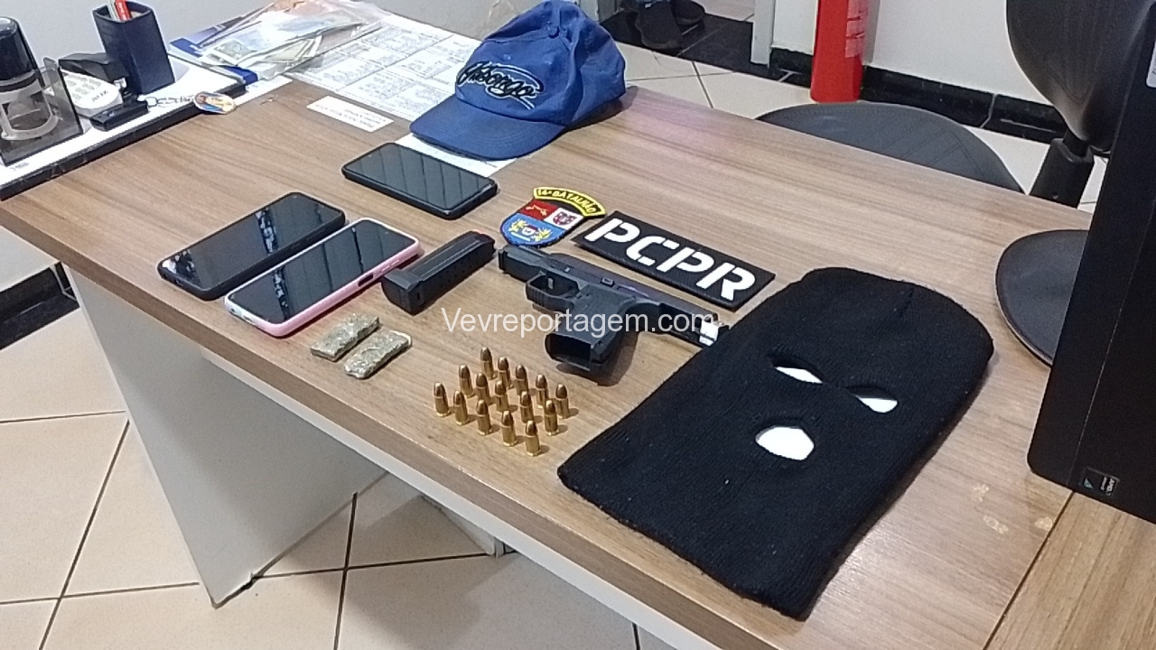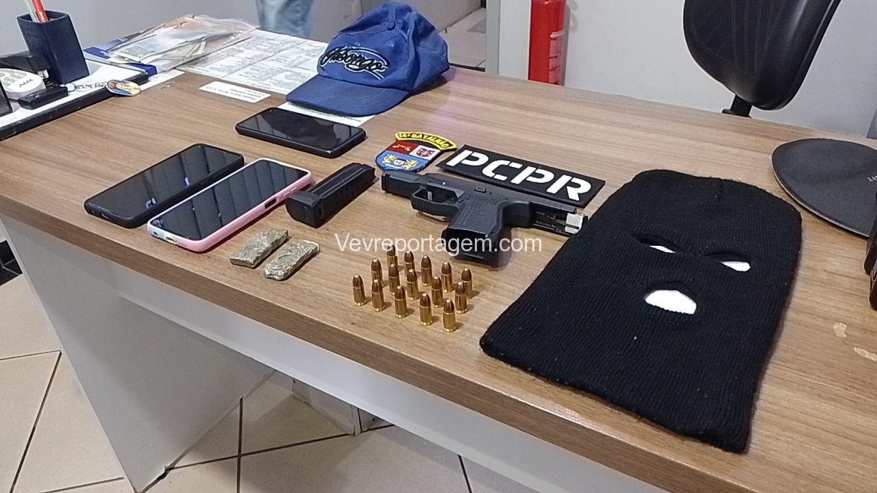 Feito a abordagem foi encontrado em.posse da mulher uma pistola calibre 9mm da marca Arex Delta, com a numeração raspada e equipada com seletor de rajada, foi encontrado também uma toca balaclava, dois tacos de maconha. A arma estava municiada com 15 munições intactas. Porém, o que chamou atenção que os indivíduos estavam usando duas mudas de roupas, provavelmente estavam prestes de cometer um crime, possivelmente um assalto, pois, todos tem passagens por roubo.