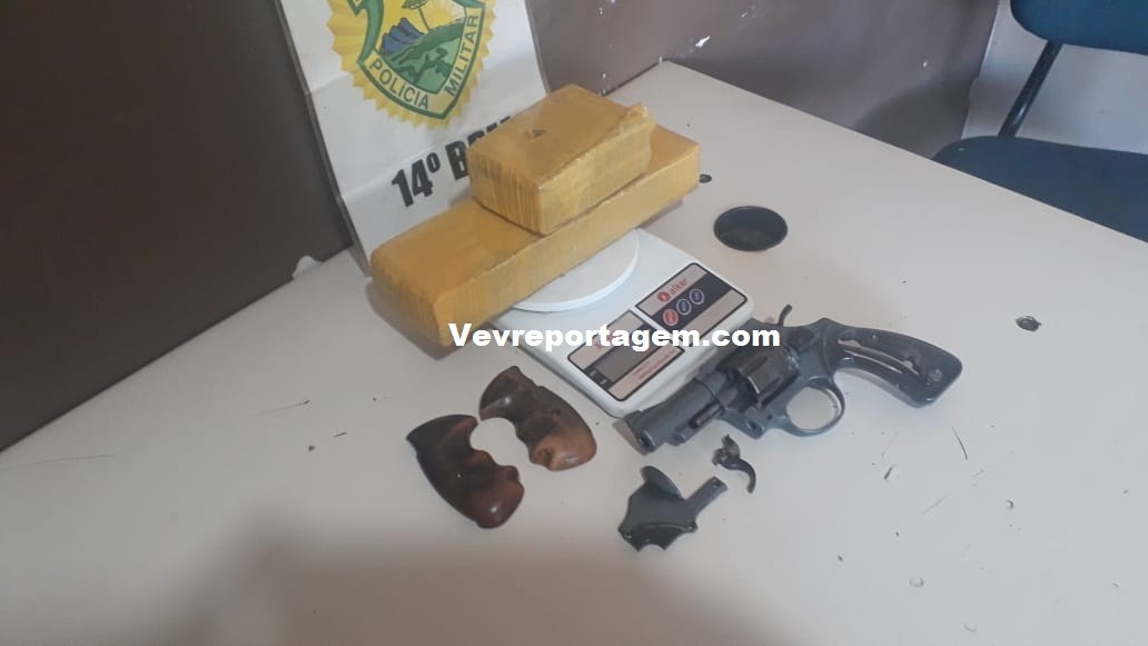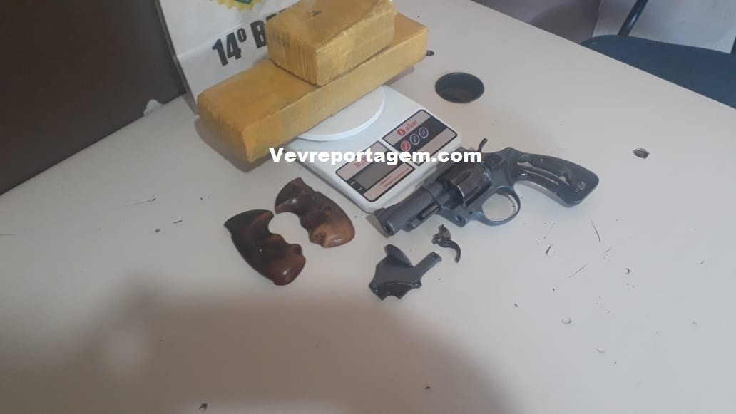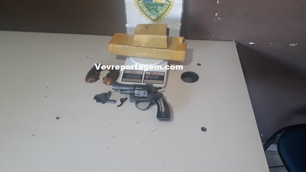 Inciando então um acompanhamento tático por diversas ruas em um momento os indivíduos lançaram algo pela janela, porém foi realizado abordagem, em vistoria pessoal nada foi encontrado, mas ao checarem o que os indivíduos dispensaram foi localizado um tablete e meio de maconha e um revólver calibre .38 desmuniciado.