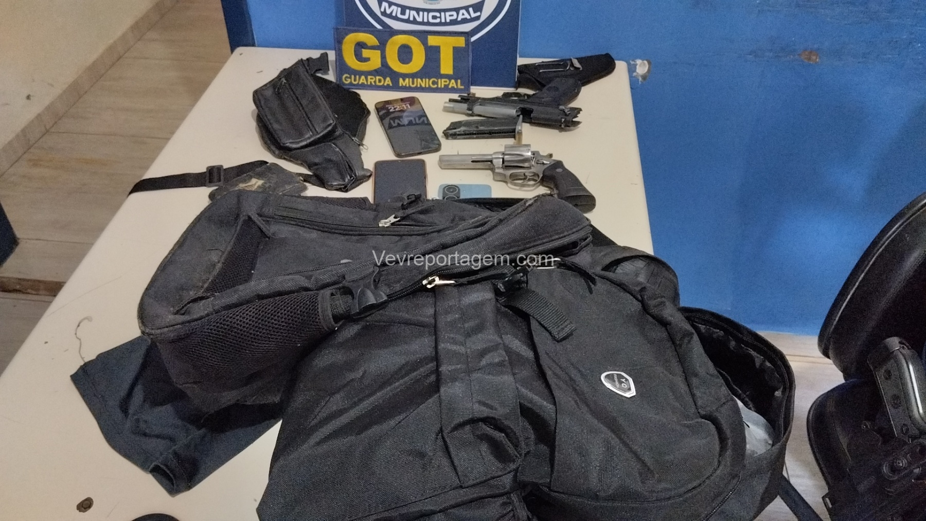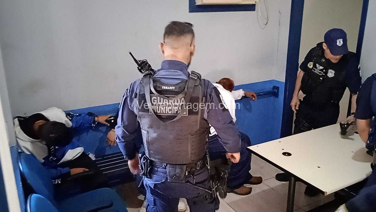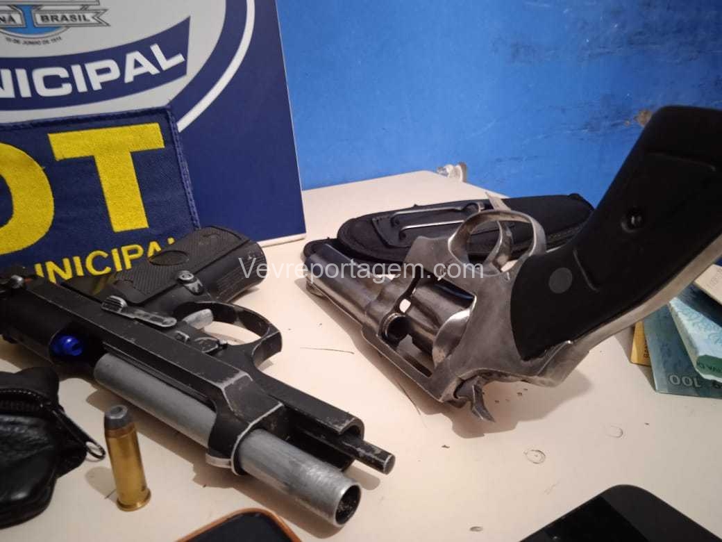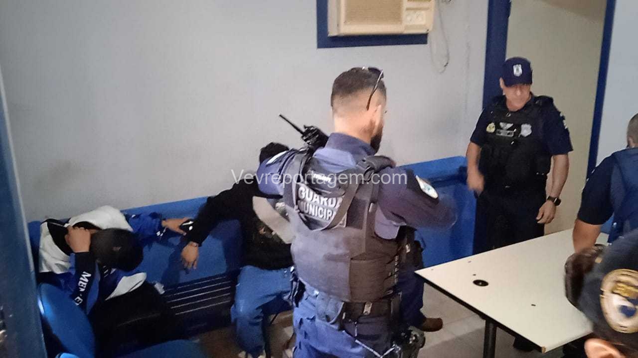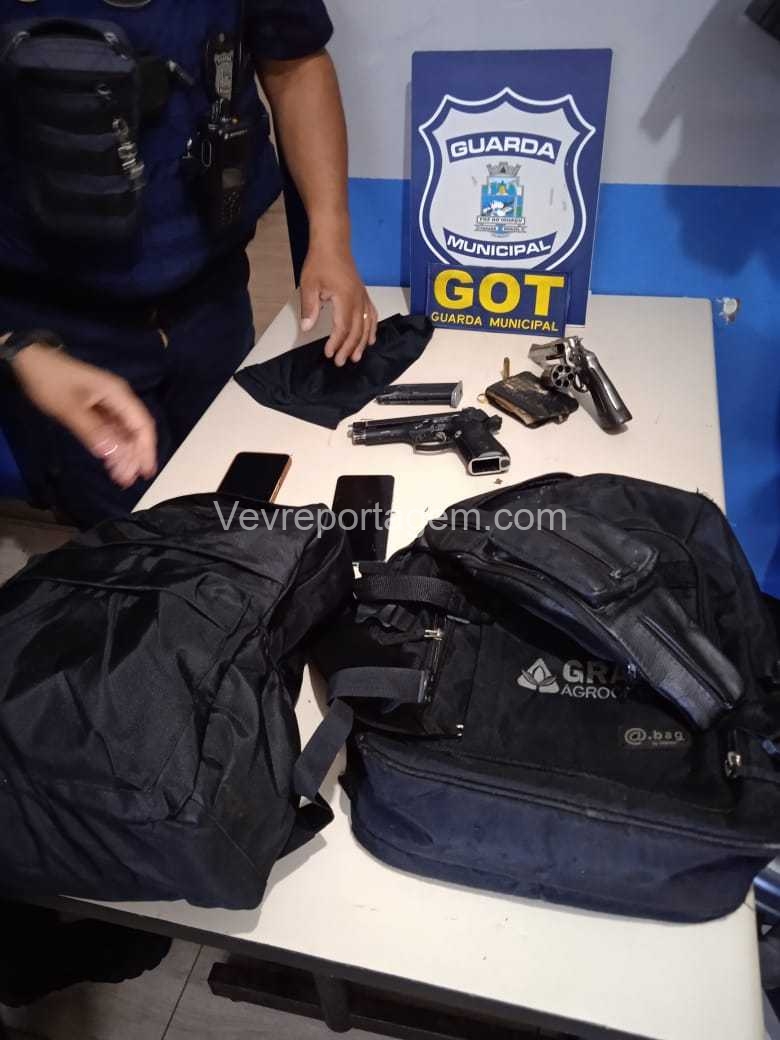 Durante a abordagem, os guardas constataram que nas mochilas havia diversos pertences roubados da vítima, além de um revólver calibre .38 e um simulacro de pistola calibre 9mm. Diante dos fatos, foi dada voz de prisão aos indivíduos.