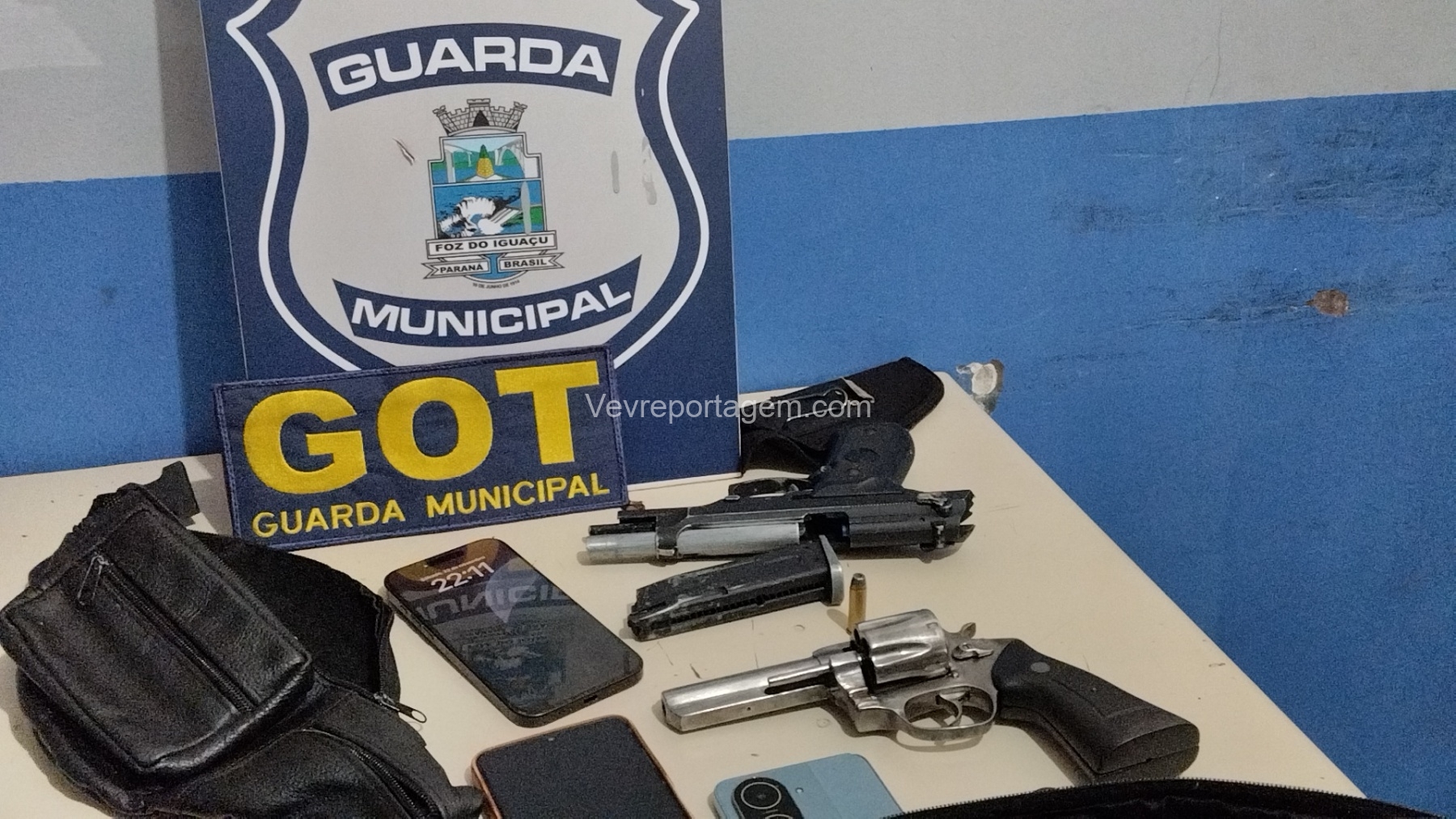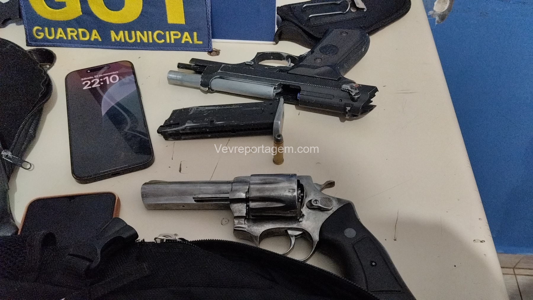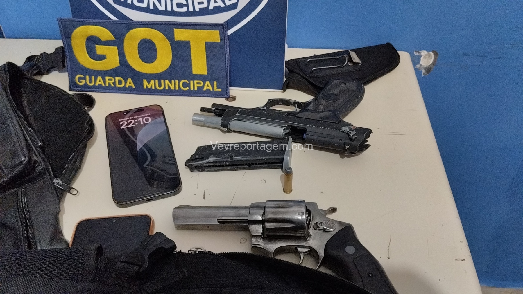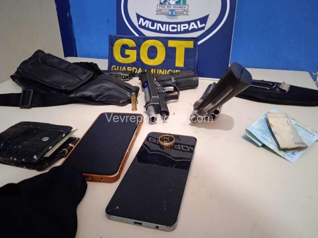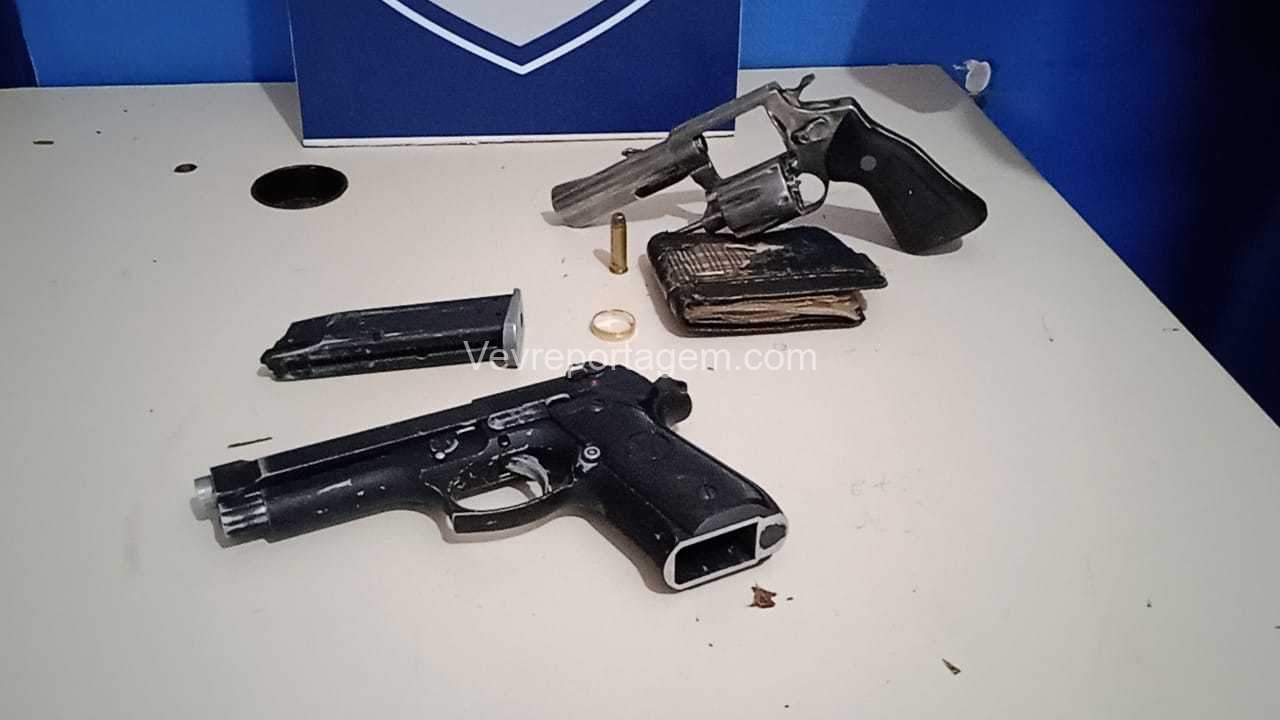 Durante a abordagem, os guardas constataram que nas mochilas havia diversos pertences roubados da vítima, além de um revólver calibre .38 e um simulacro de pistola calibre 9mm. Diante dos fatos, foi dada voz de prisão aos indivíduos.