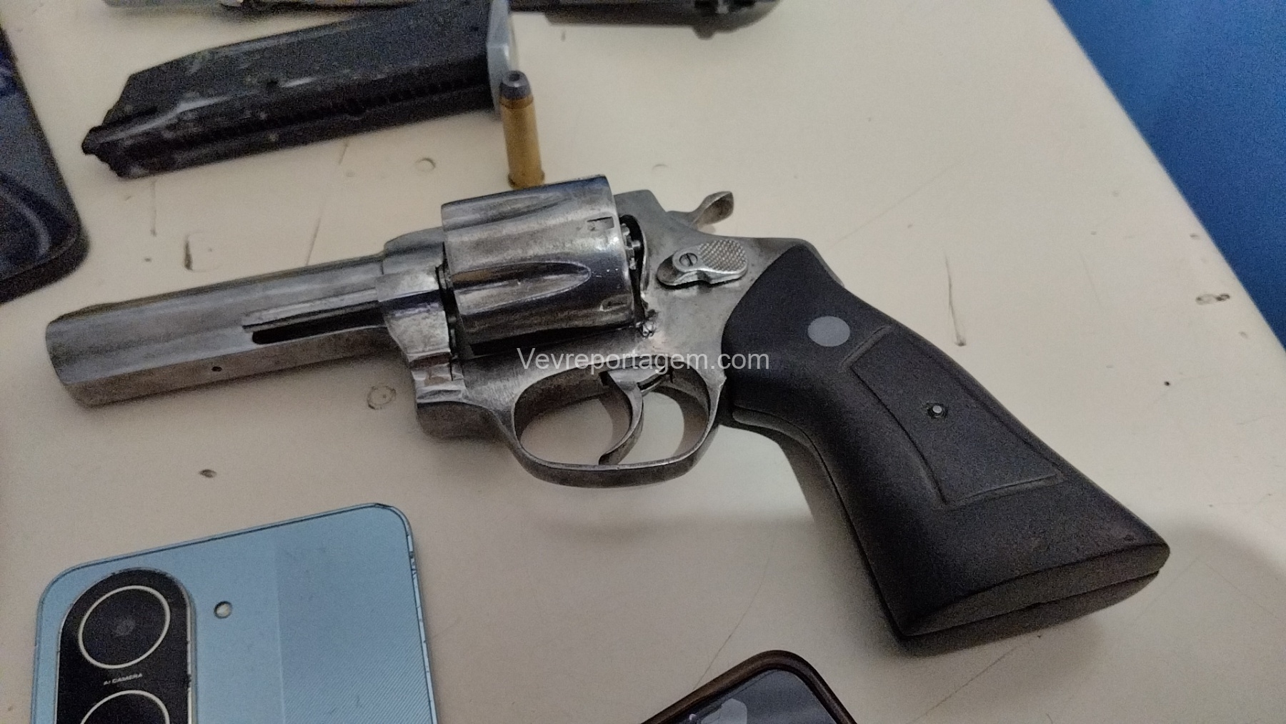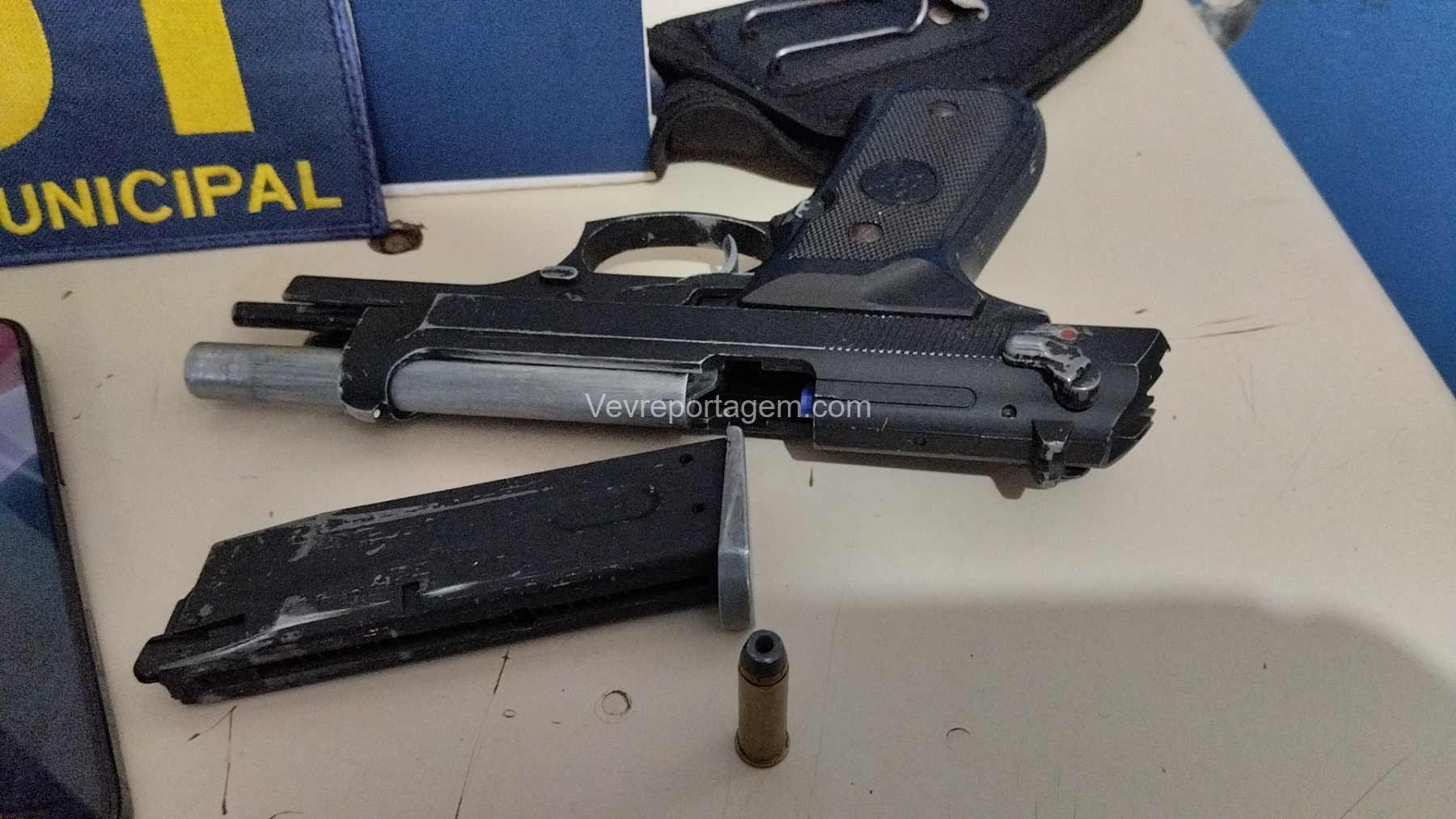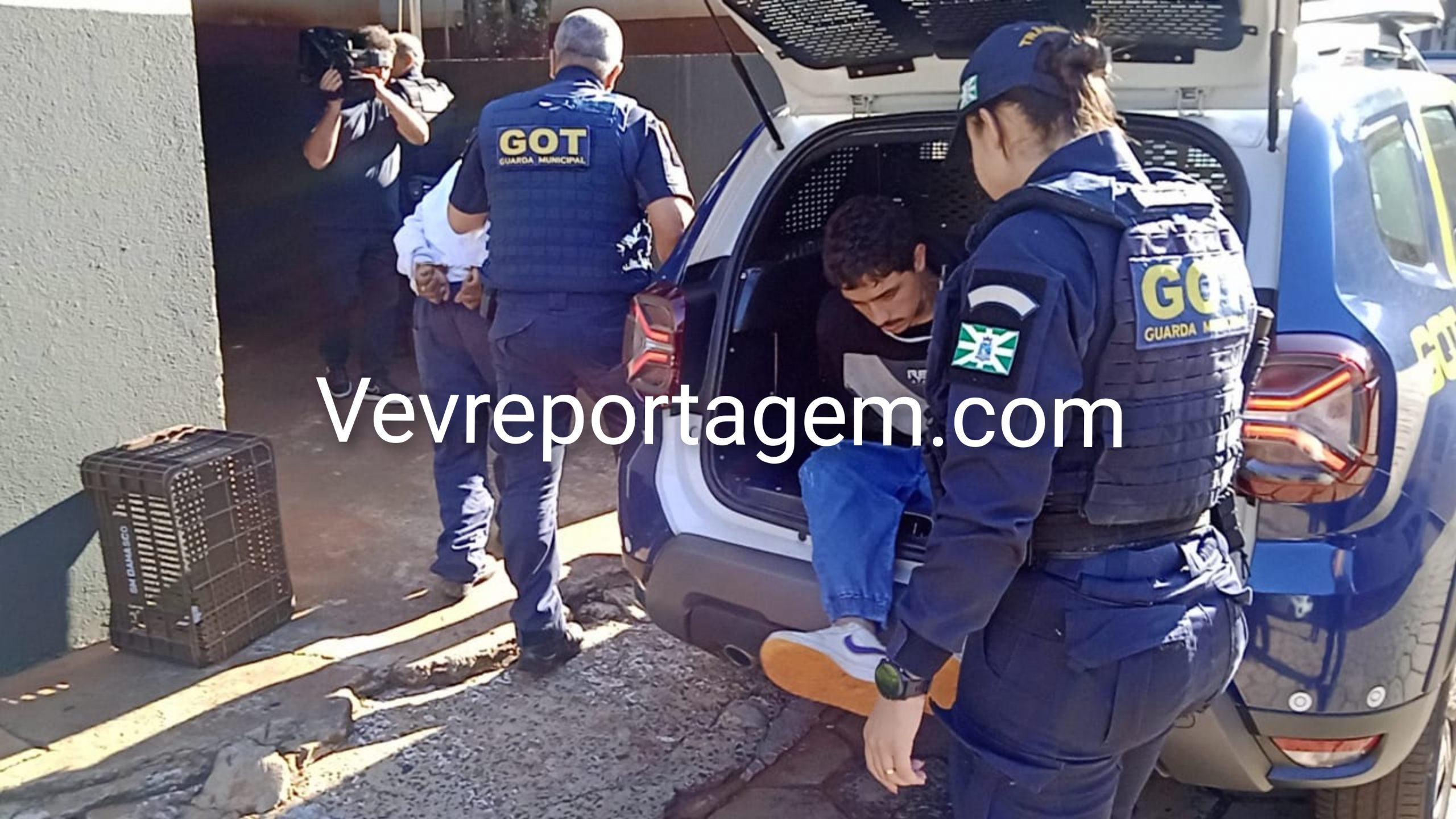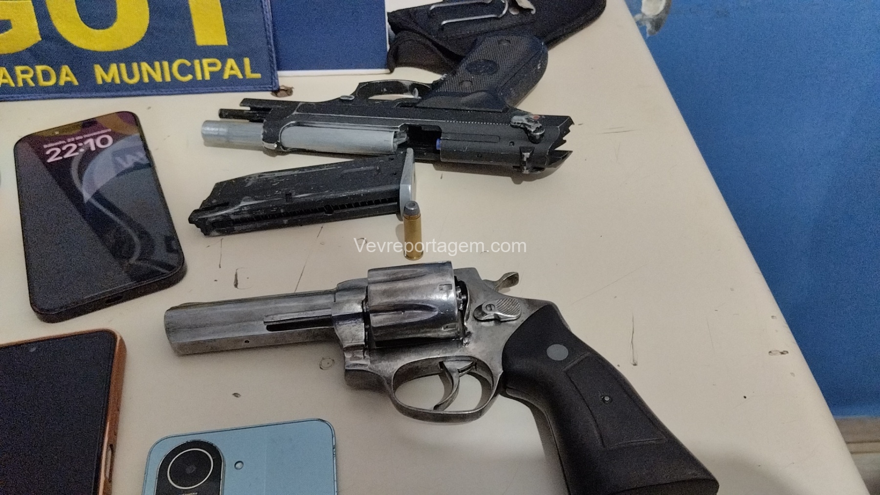 Durante a abordagem, os guardas constataram que nas mochilas havia diversos pertences roubados da vítima, além de um revólver calibre .38 e um simulacro de pistola calibre 9mm. Diante dos fatos, foi dada voz de prisão aos indivíduos.