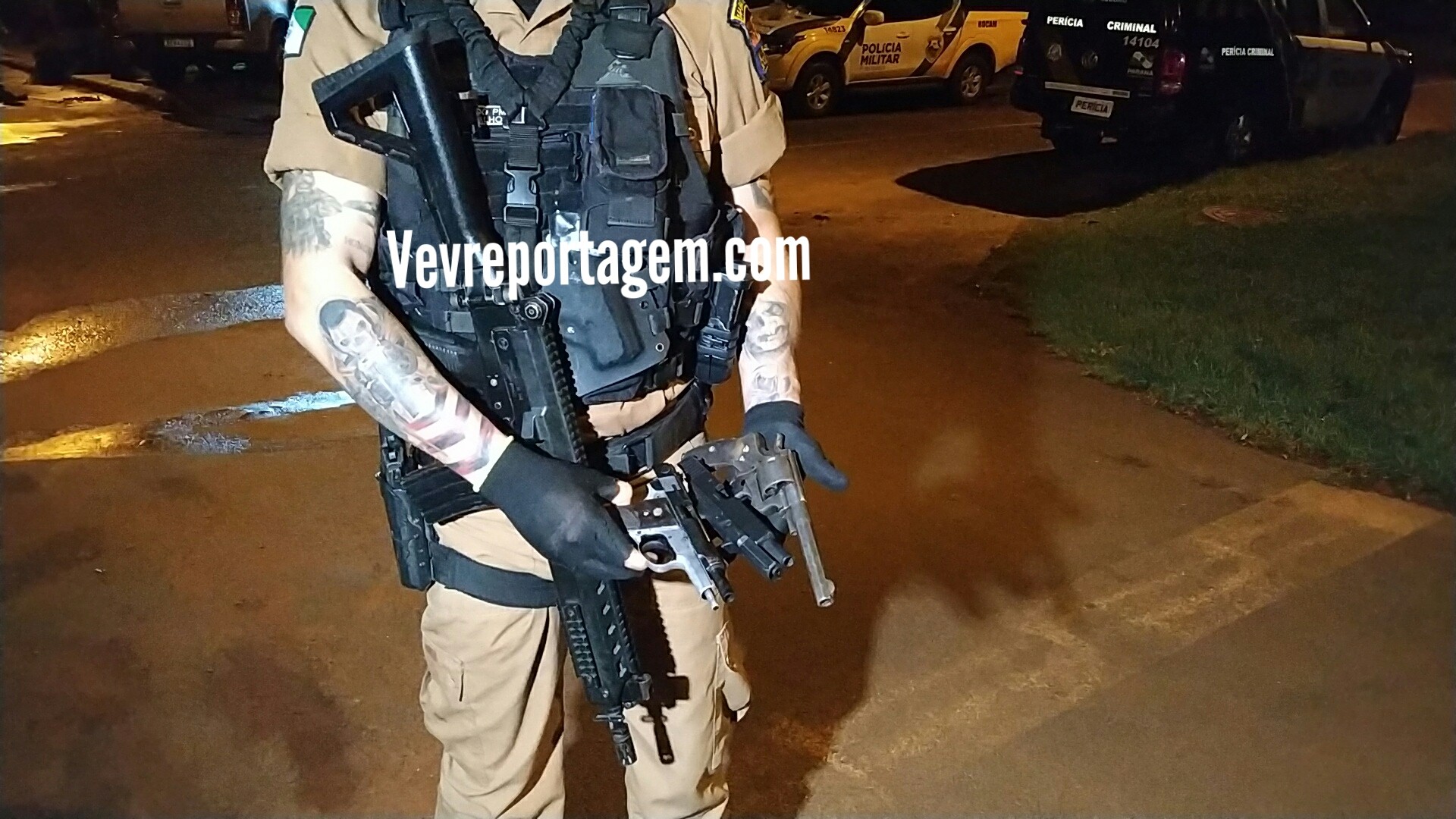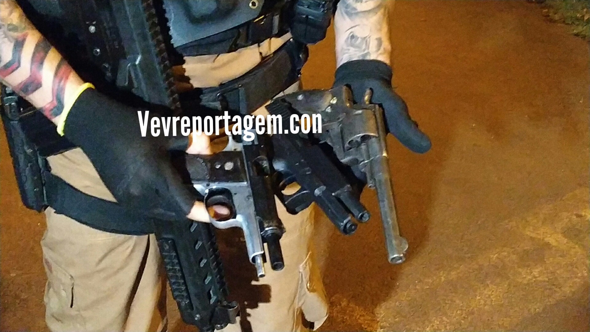 Com os assaltantes foram localizados três armas sendo elas, uma pistola calibre .40, uma pistola calibre 9mm e um magnum calibre 44.