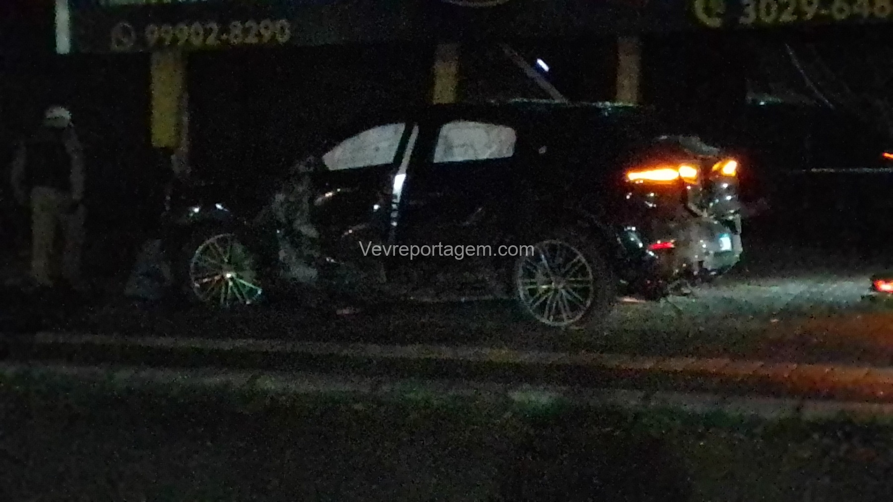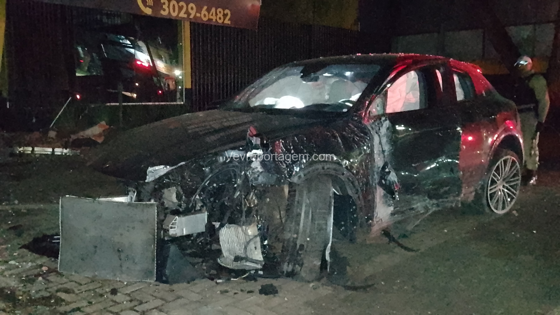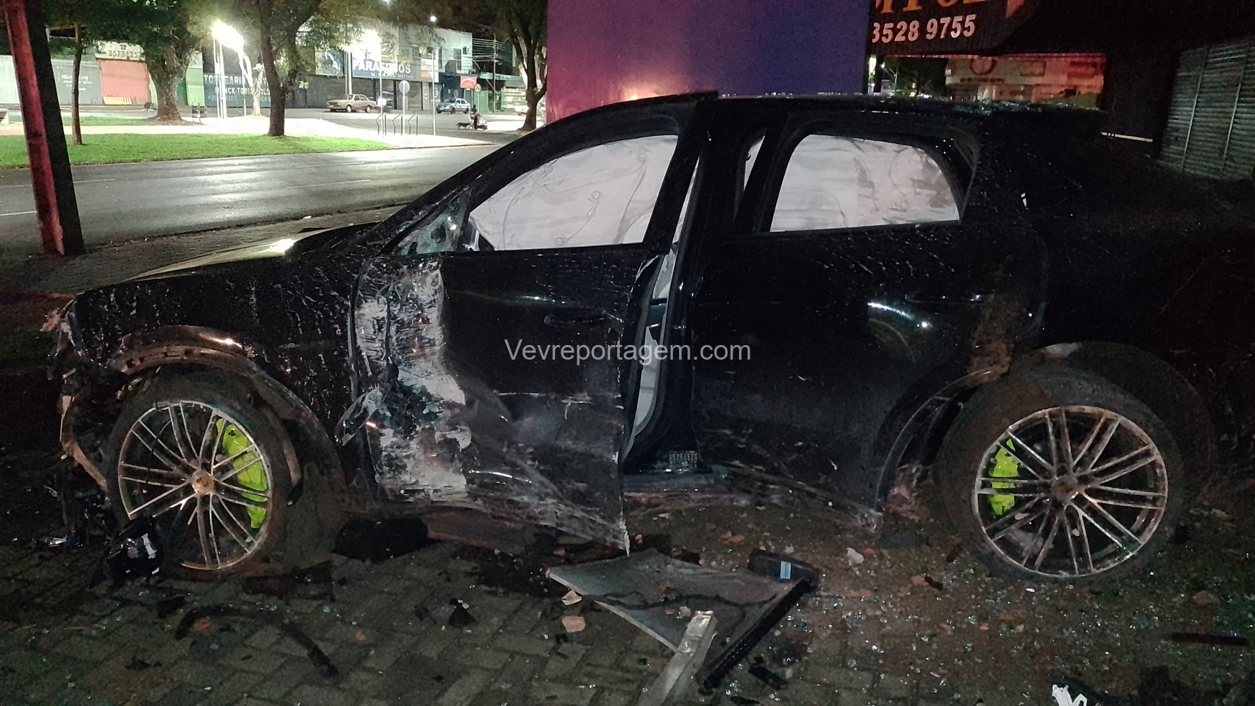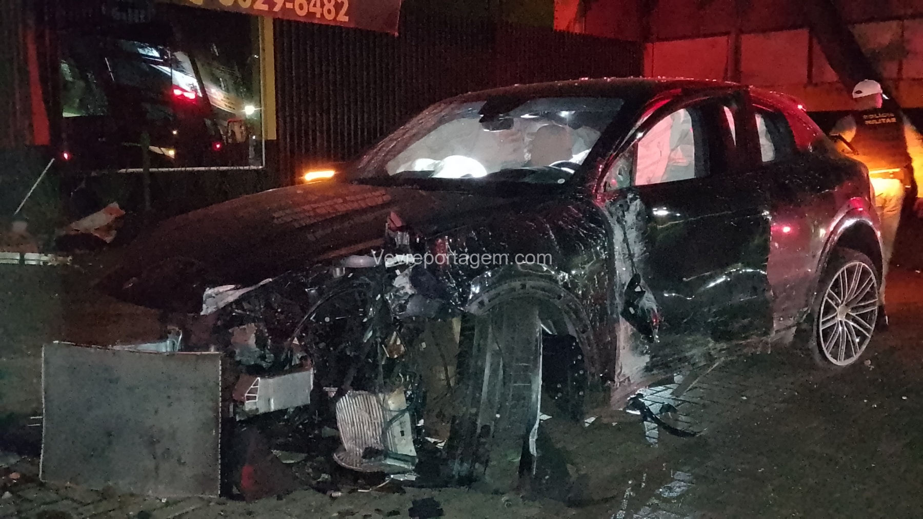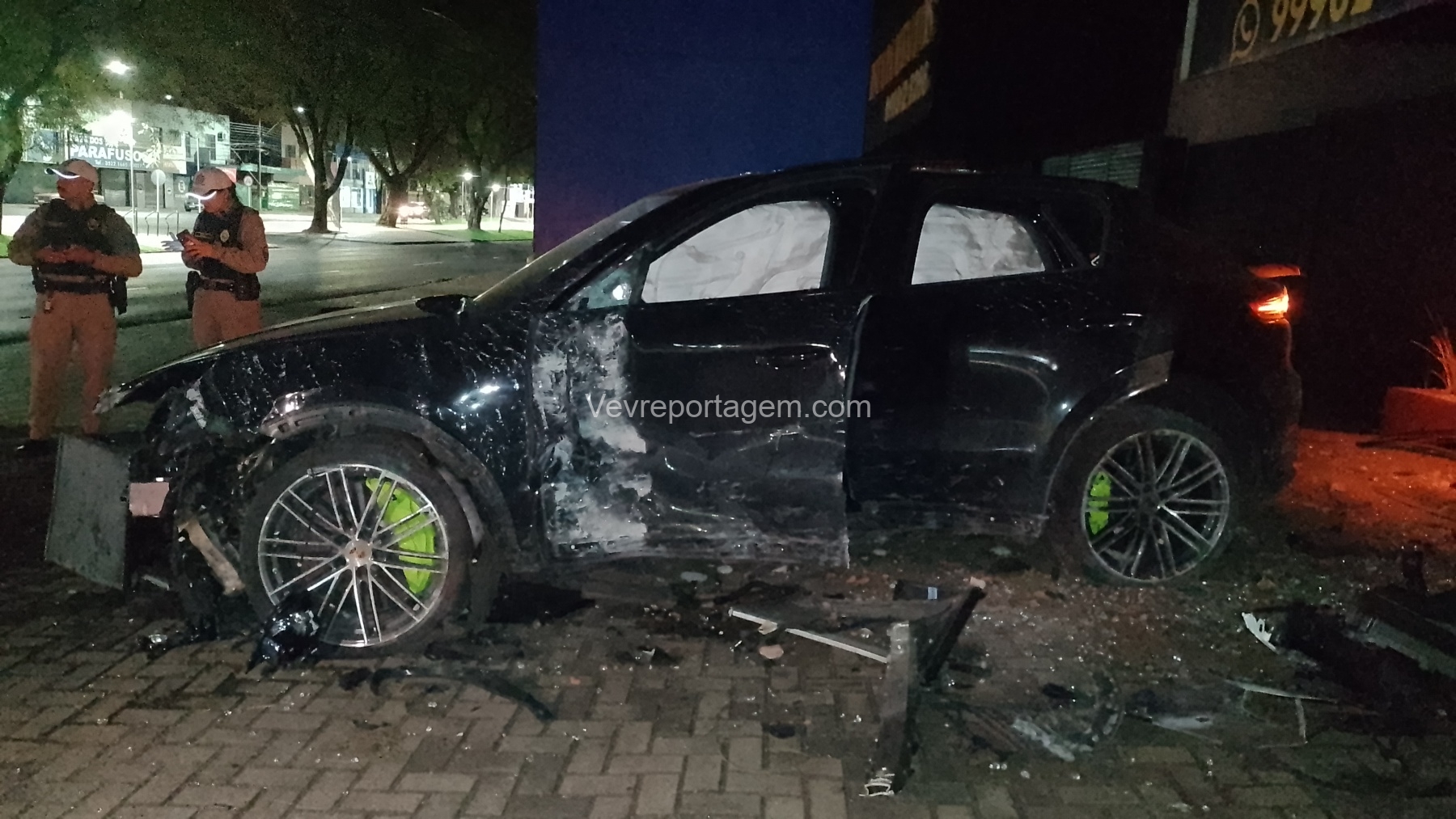 De acordo com as informações repassadas às equipes, um veículo de luxo, modelo Porsche, colidiu violentamente contra um poste de energia elétrica e, em seguida, contra a fachada de um estabelecimento comercial. Ao chegarem ao local, os policiais e os guardas municipais constataram o acidente, porém não havia feridos. O condutor do veículo havia abandonado o local antes da chegada das autoridades.
