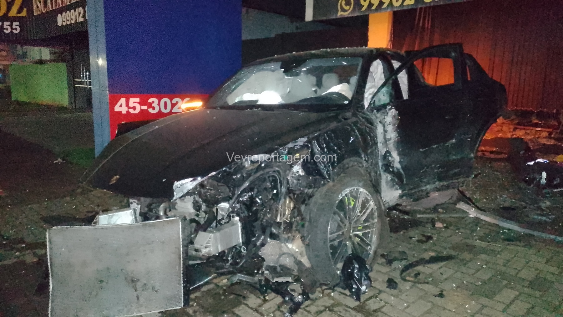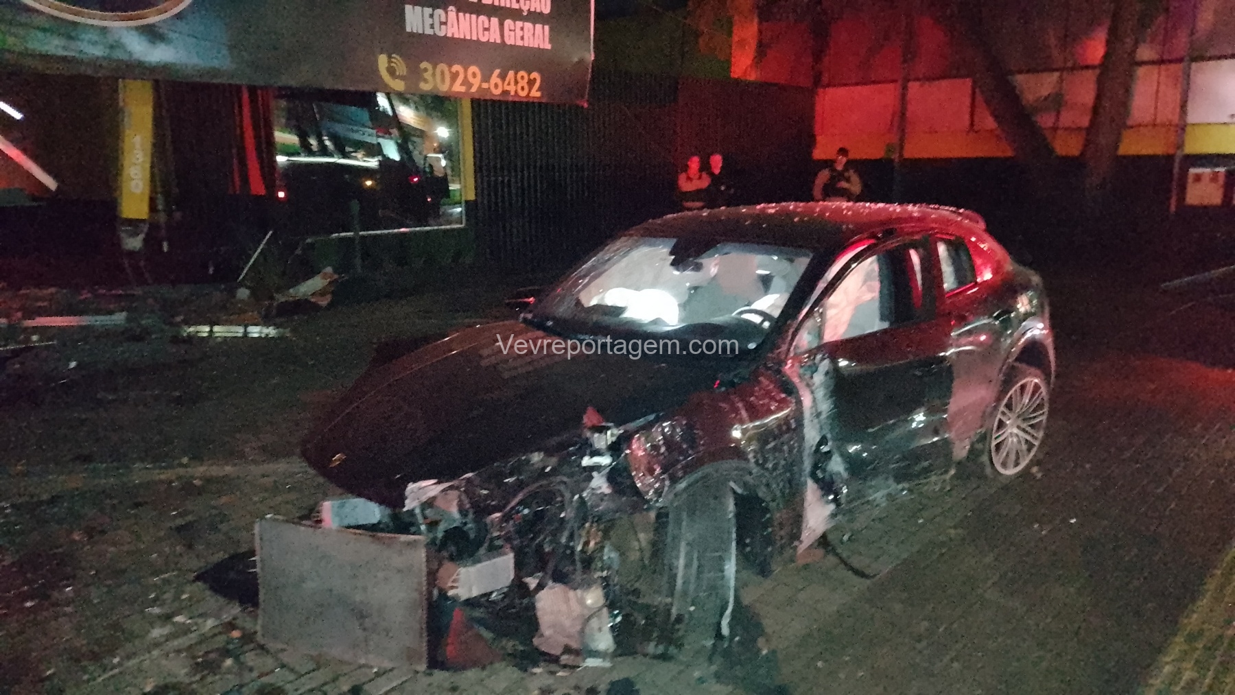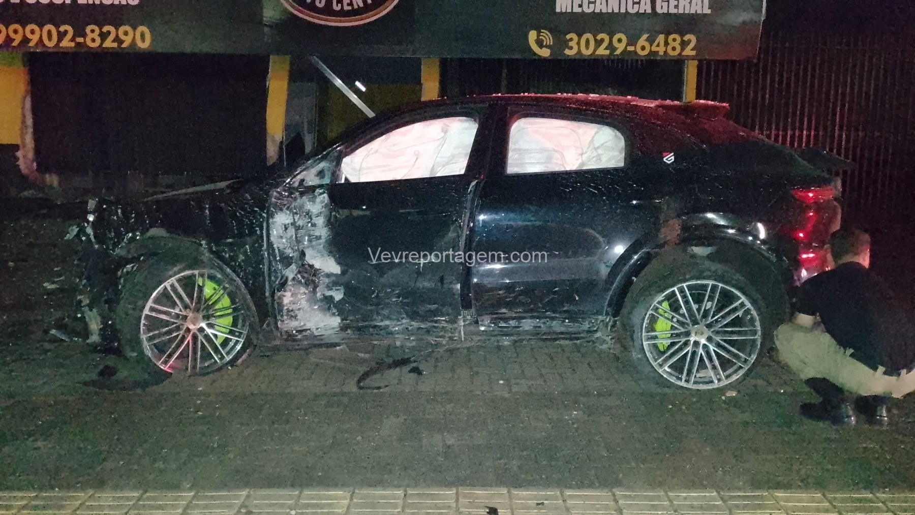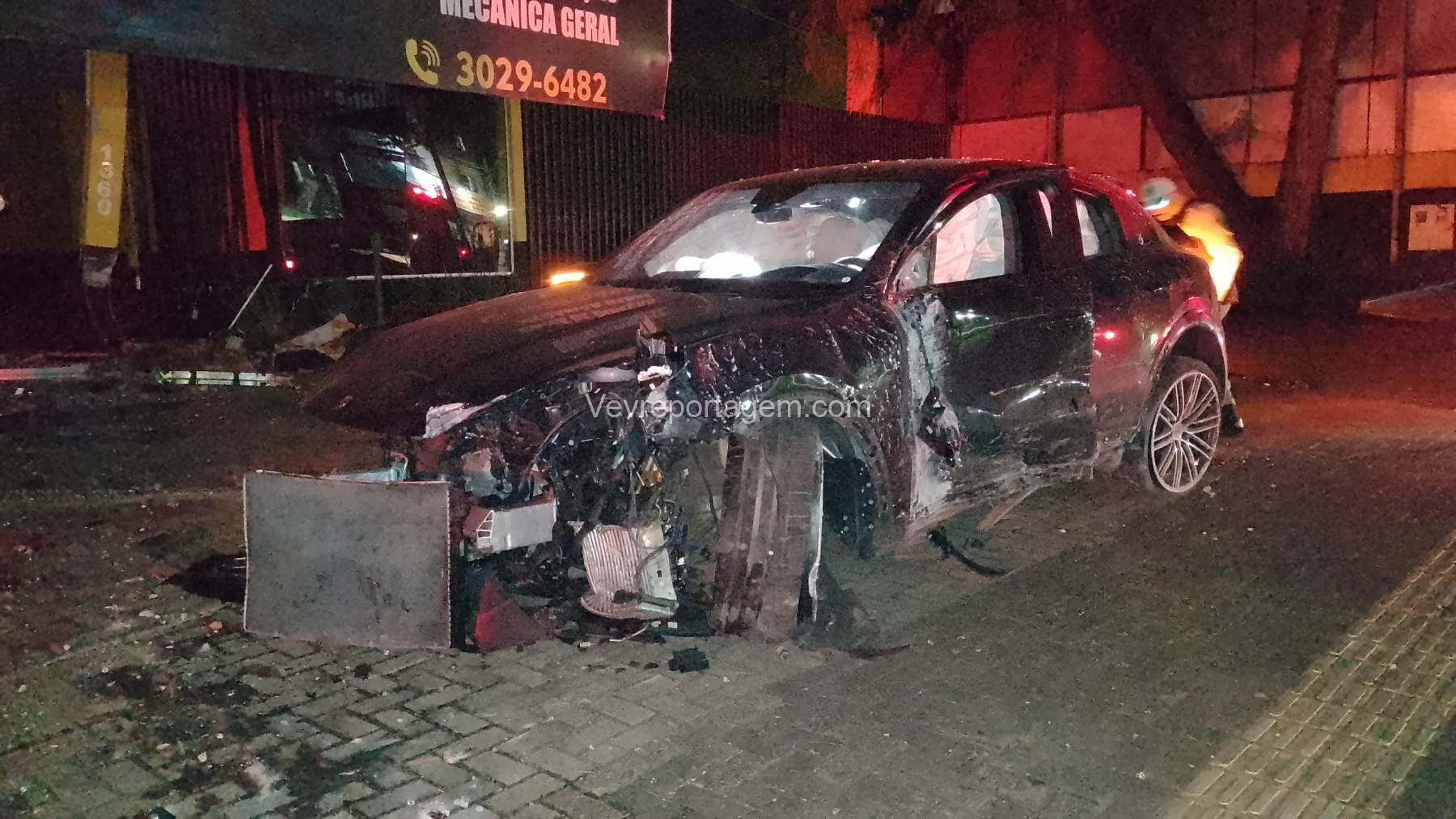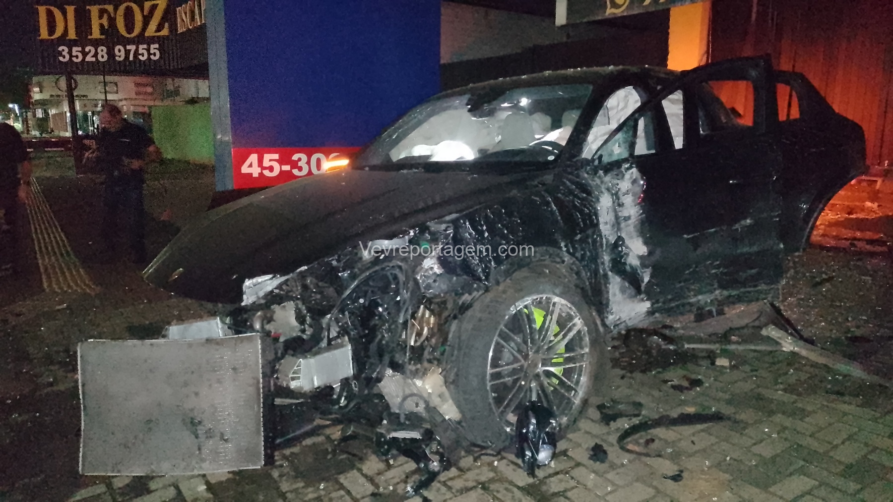 De acordo com as informações repassadas às equipes, um veículo de luxo, modelo Porsche, colidiu violentamente contra um poste de energia elétrica e, em seguida, contra a fachada de um estabelecimento comercial. Ao chegarem ao local, os policiais e os guardas municipais constataram o acidente, porém não havia feridos. O condutor do veículo havia abandonado o local antes da chegada das autoridades.